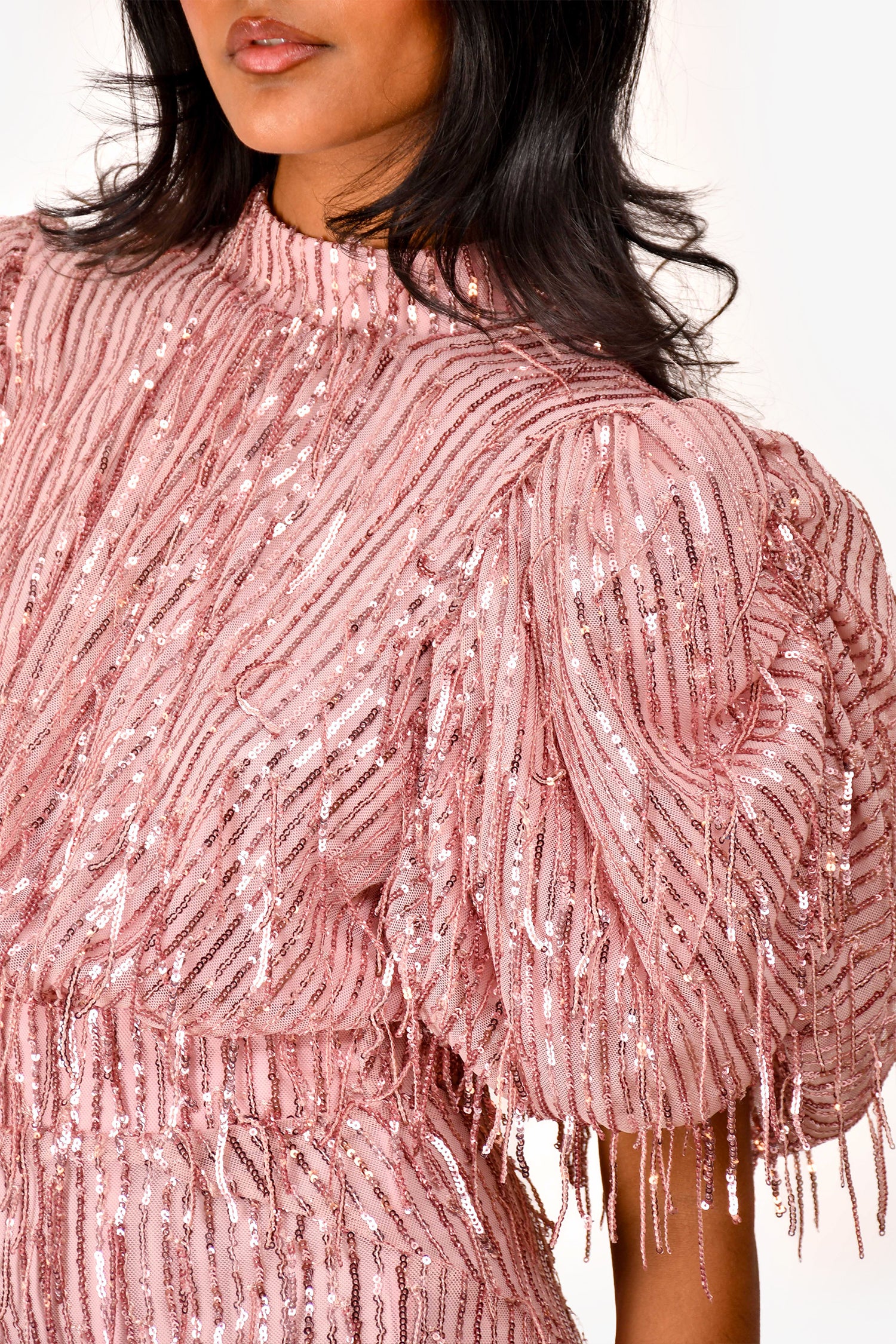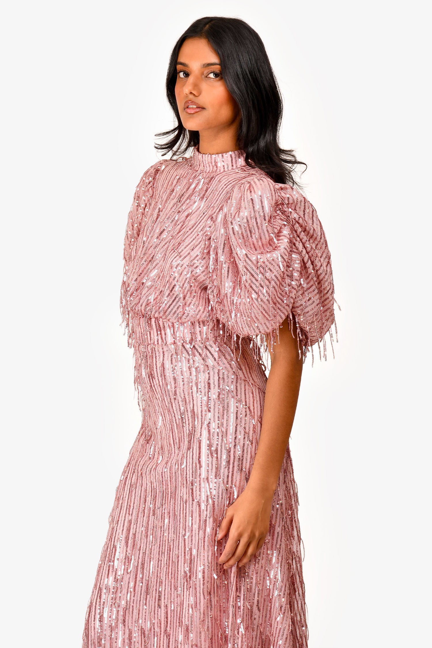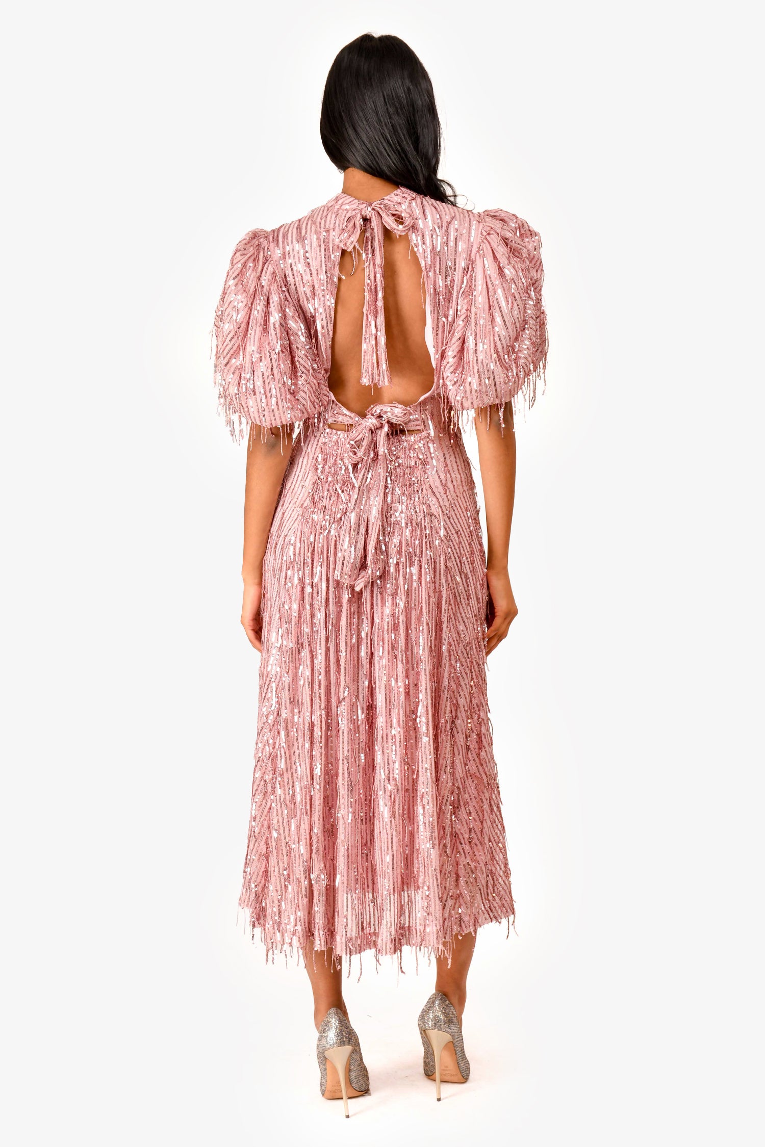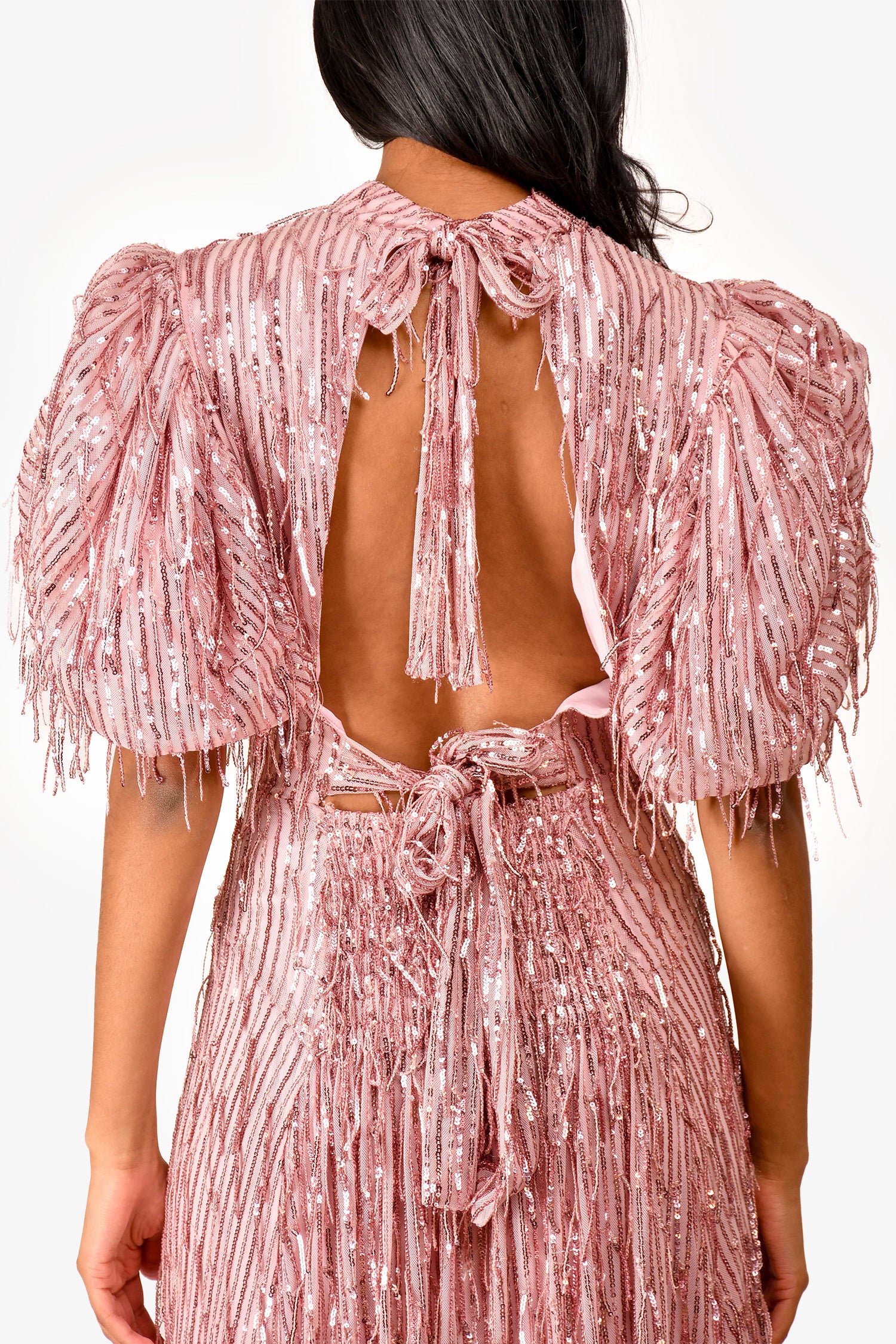 Refresh availabilityROTATE Pink Sequin Puff Sleeve Maxi Dress. Tie-back closure. Lined. Tonal stitching.
