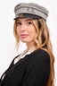 Refresh availabilityRuslan Baginskiy Grey Wool Baker Boy Hat. Metallic front. Stitch detailing on the front. Soft top. Tonal stitching.