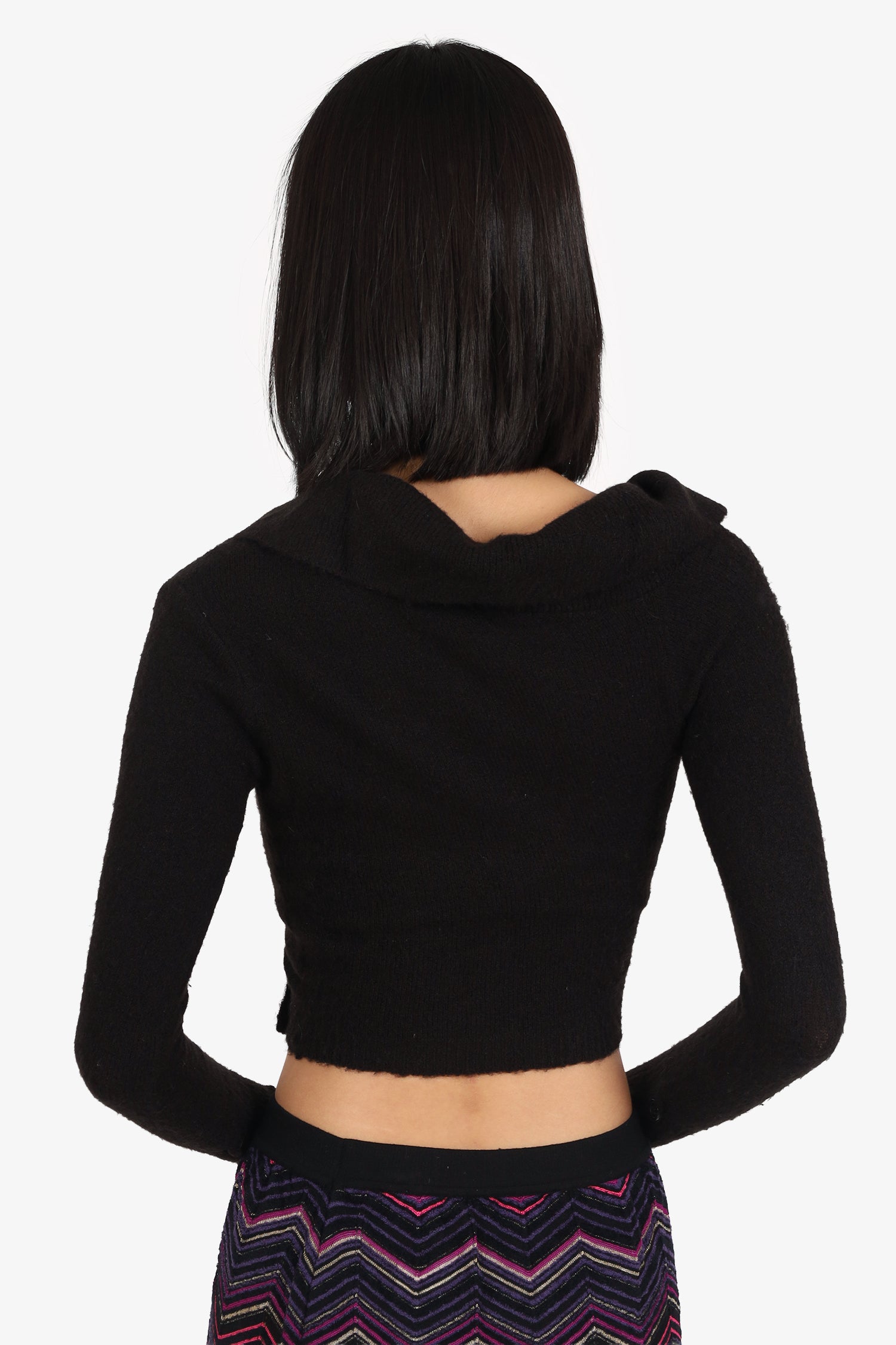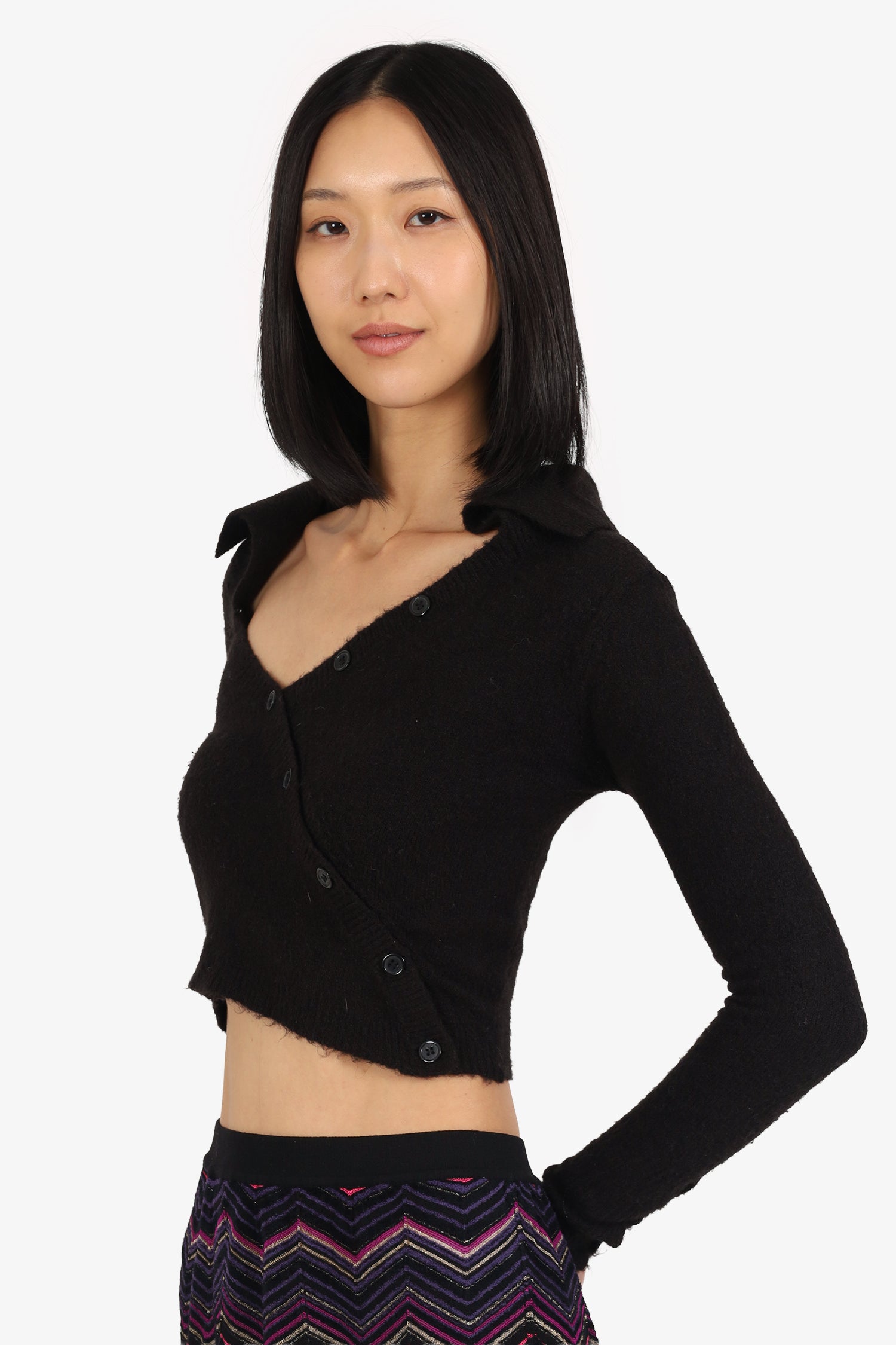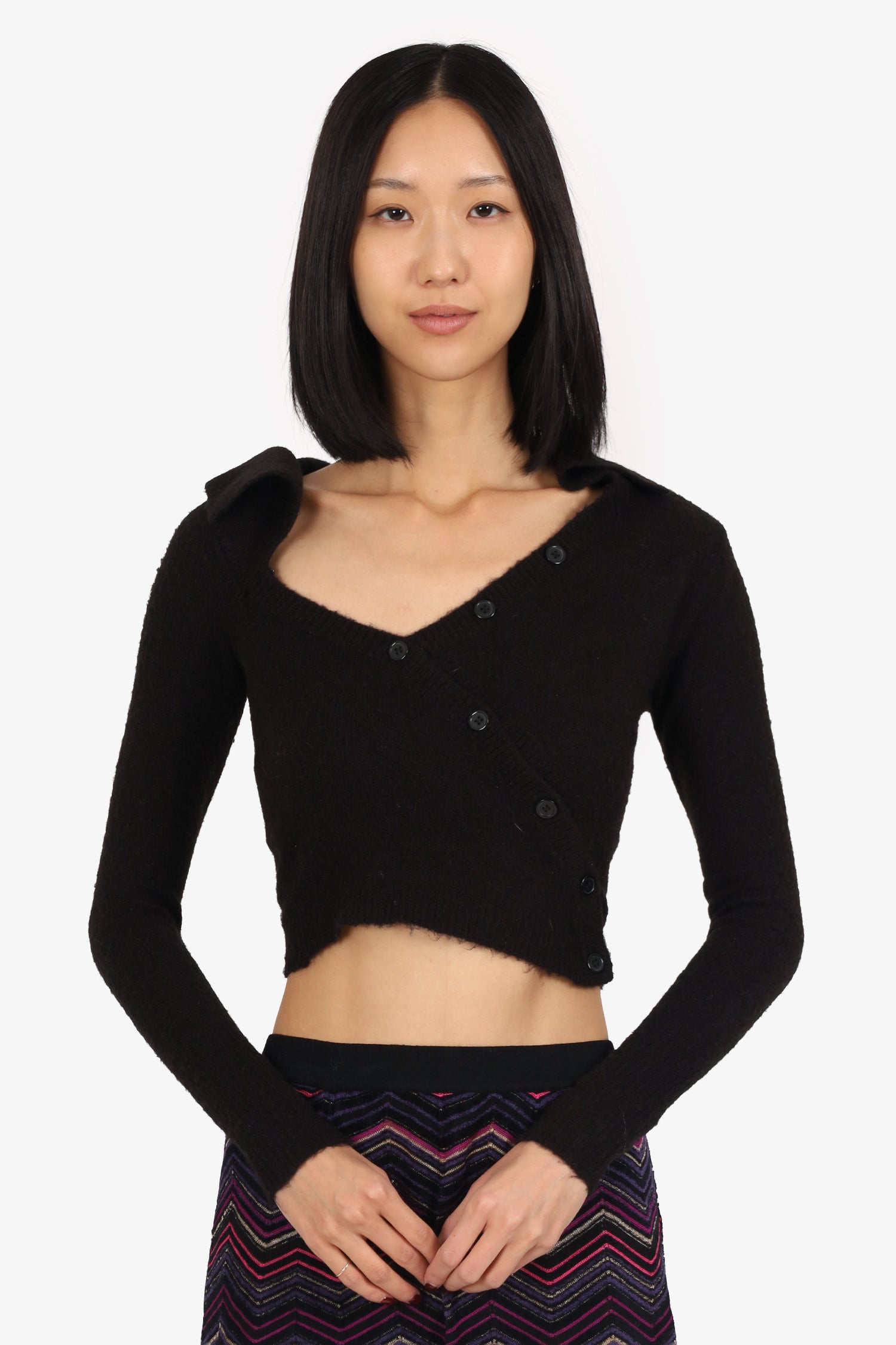 Refresh availabilityRuve Black Knit Long Sleeve Cropped Sweater. Pull-on. Collared-neckline. Front button-up closure. Tonal stitching.
