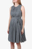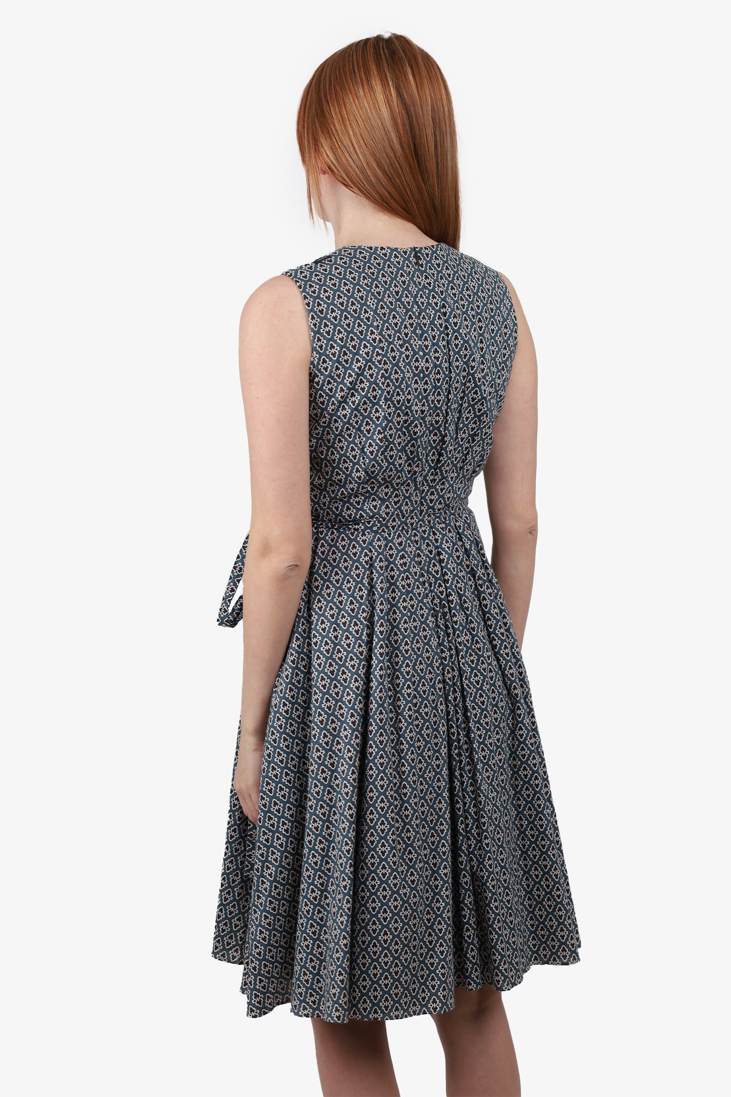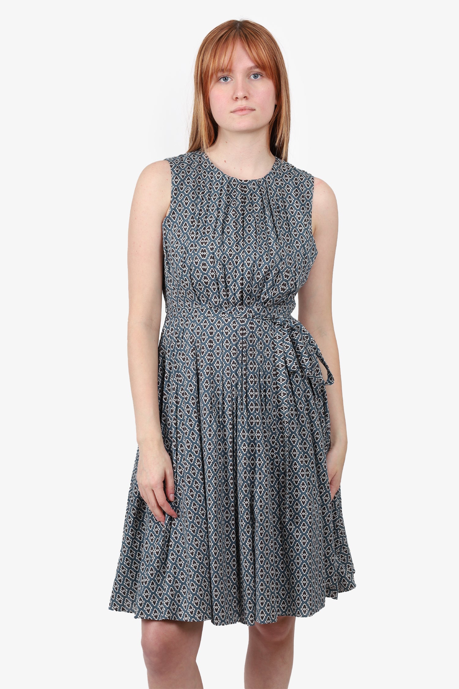 Refresh availability'S Max Mara Blue/Grey Printed Cotton Pleated Sleeveless Dress with Waist Tie. Round neckline. Back zip-up closure. Tonal stitching.