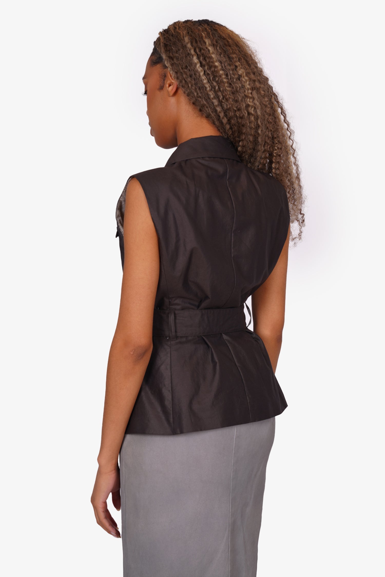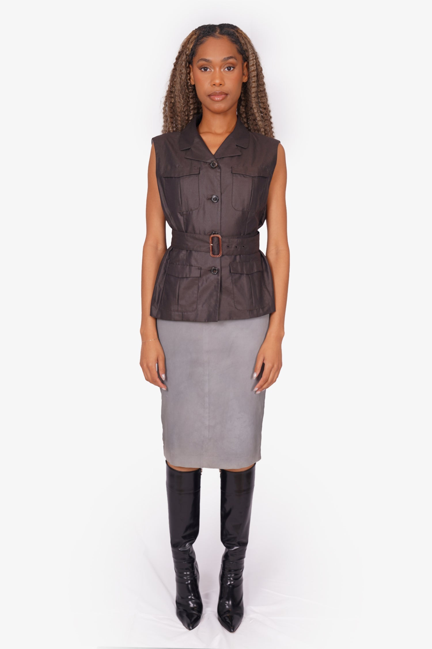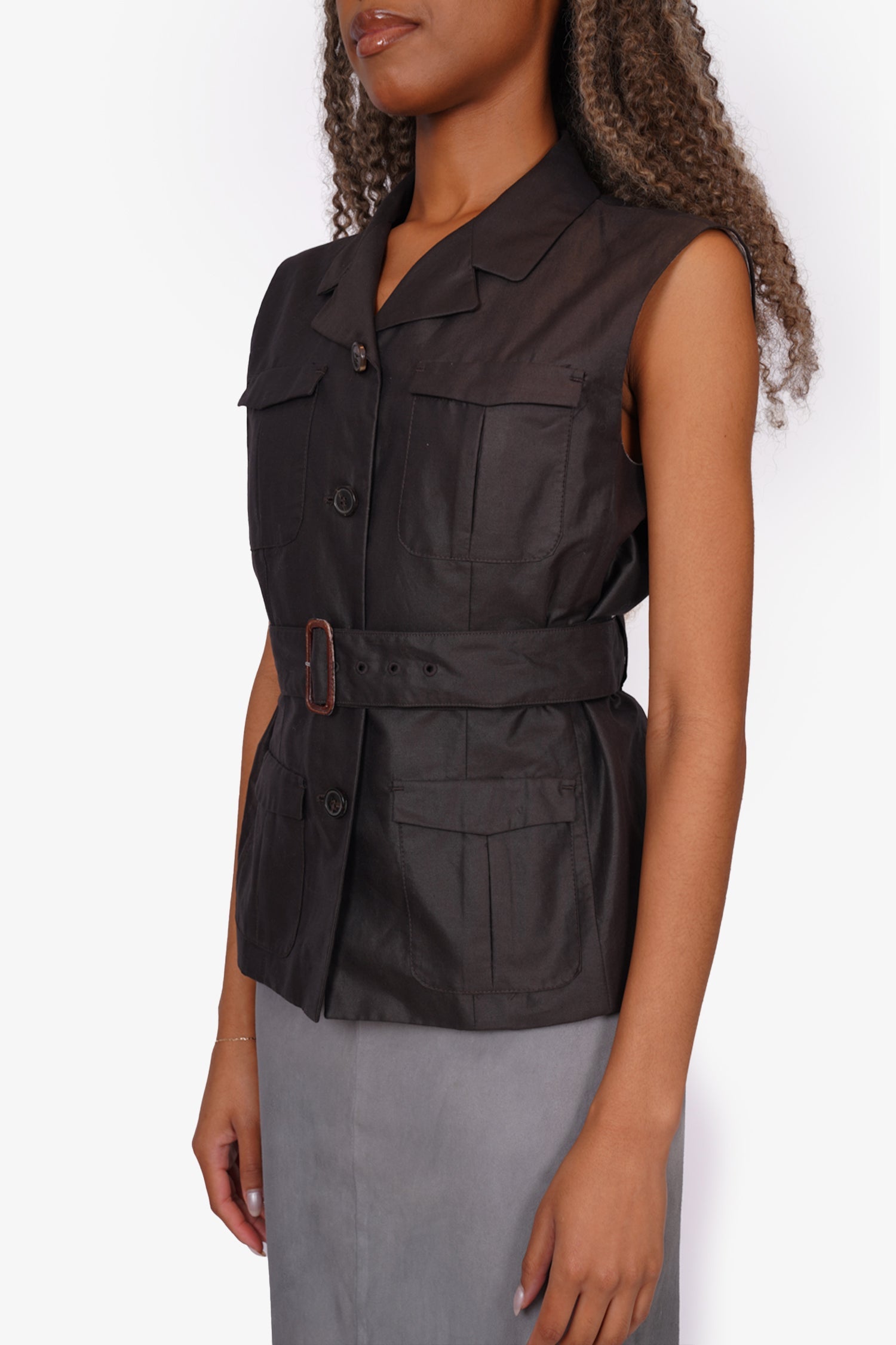 Refresh availabilityMax Mara Brown Sleeveless Jacket. Notched collared neckline. Front button closure. Belted waist. 4 front breast pockets. Half-lined. Tonal stitching.