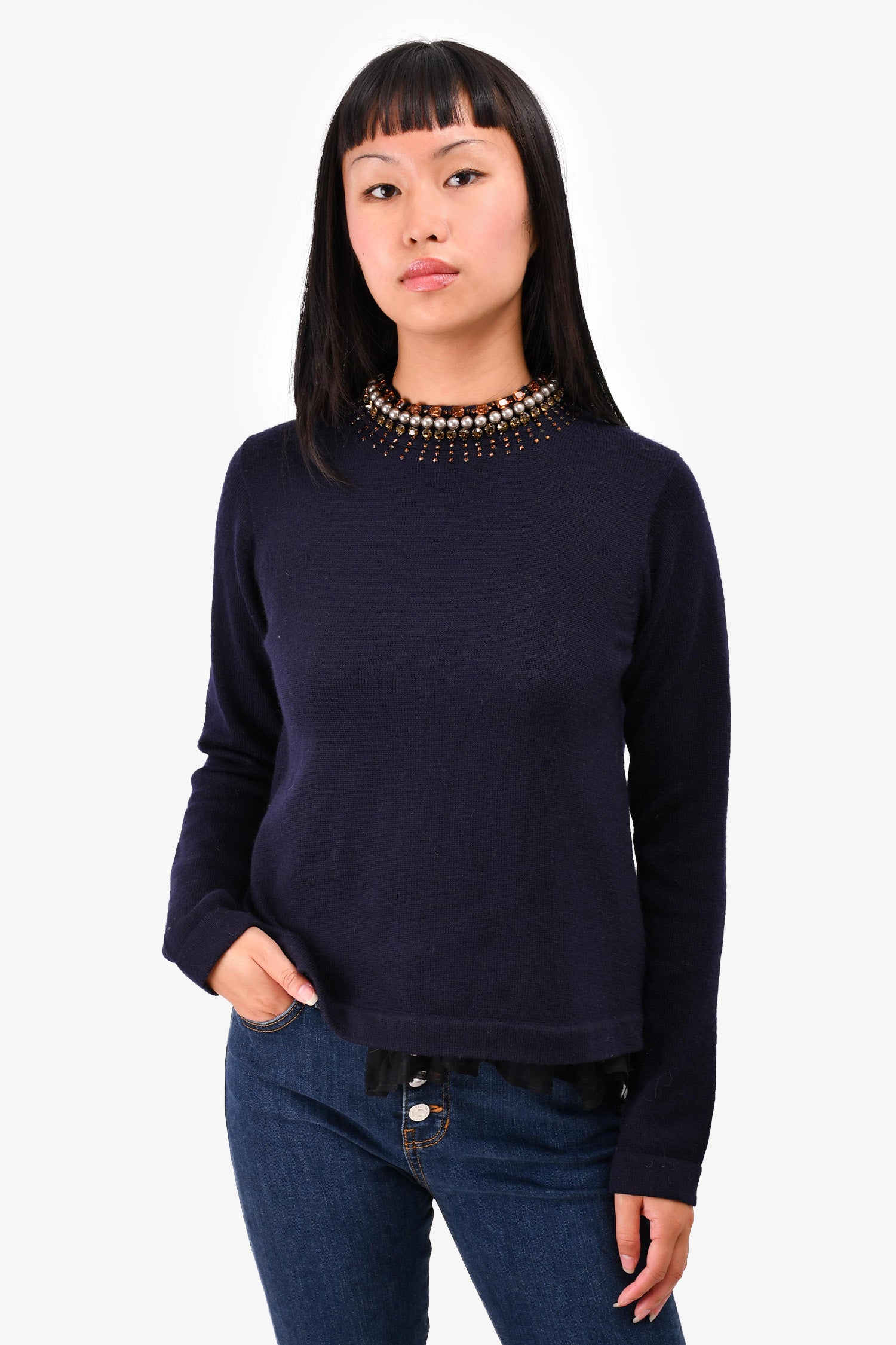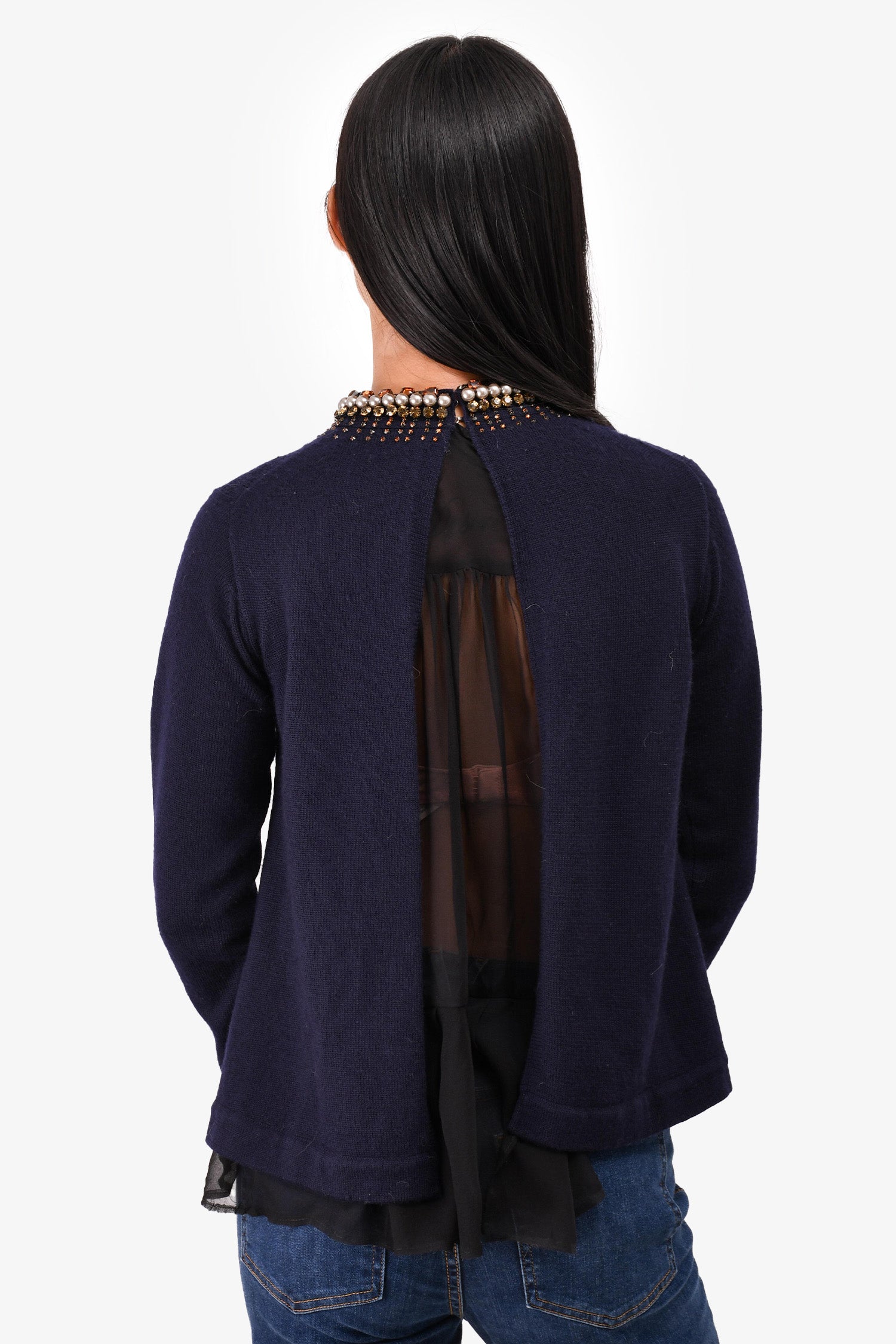 Refresh availabilitySacai 2011 Navy Wool/Silk Crystal Embellished Cardigan. Open vent back. Lined. Hook and eye closures at the back. Crystal embellishment at the collar.