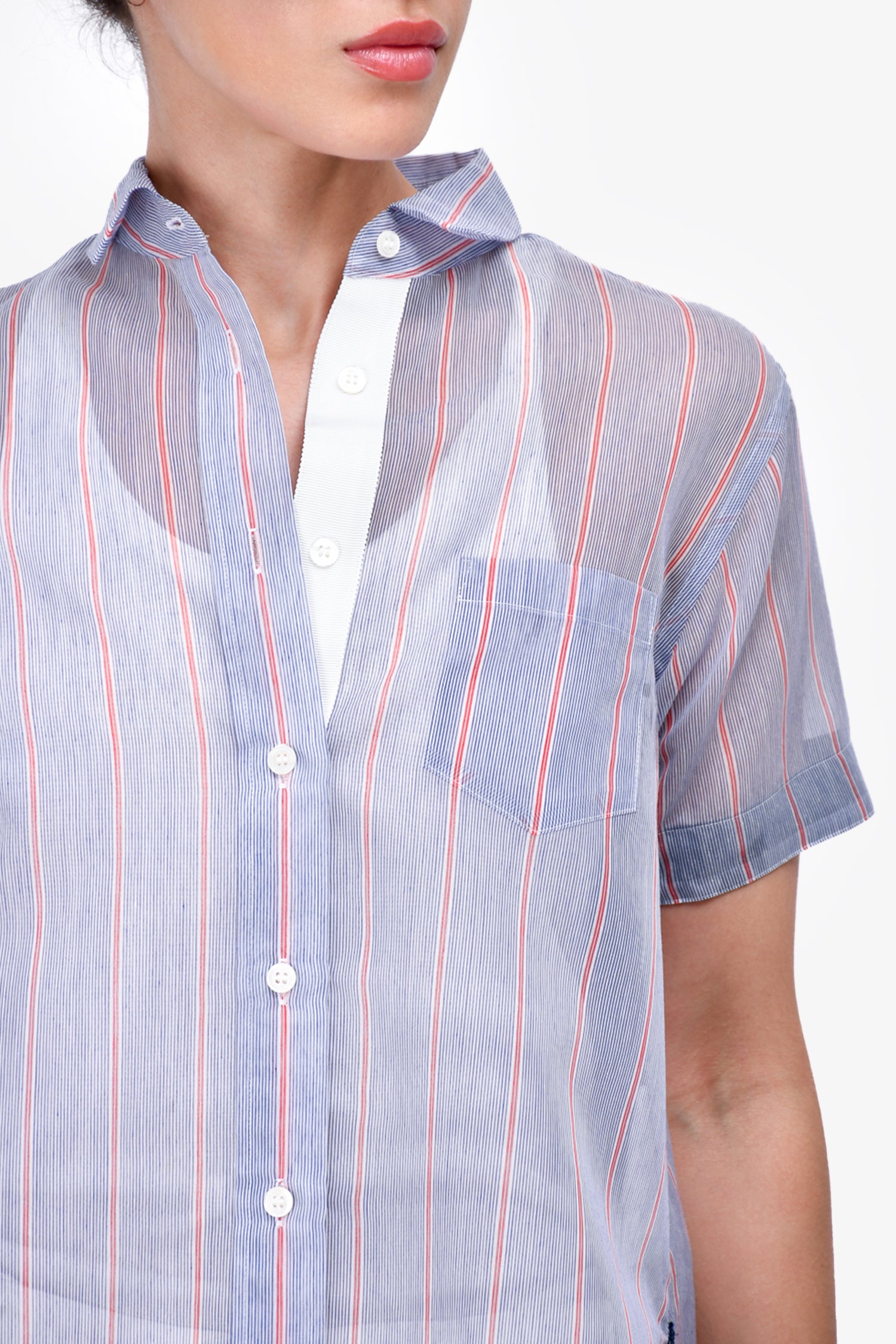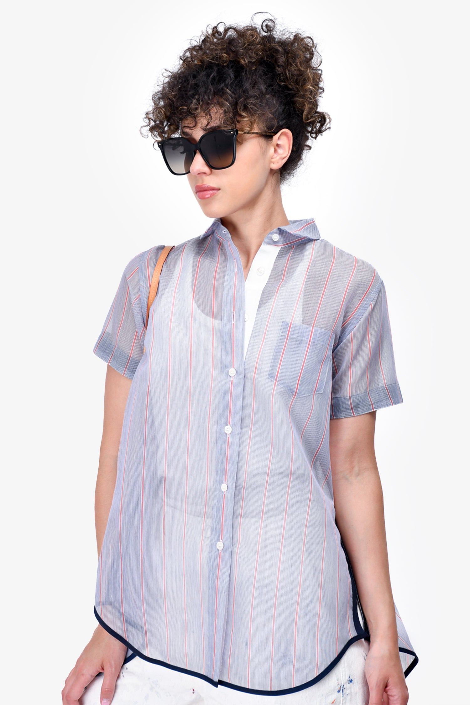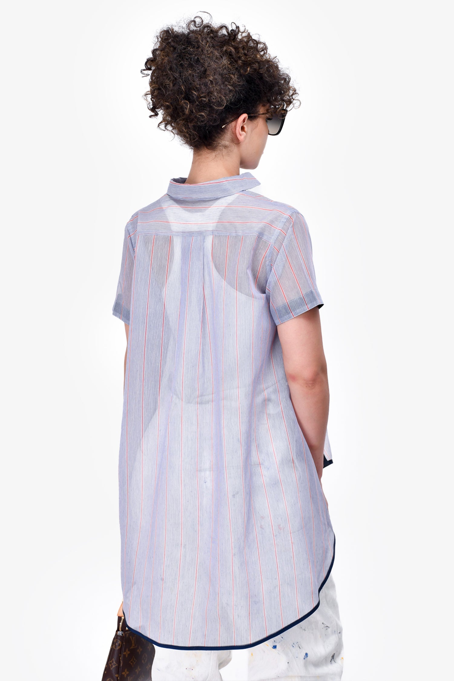 Refresh availabilitySacai 2019 Blue/Red Striped Mesh Button Up Shirt. Button closure on the cuffs. Sheer. Slip not included.