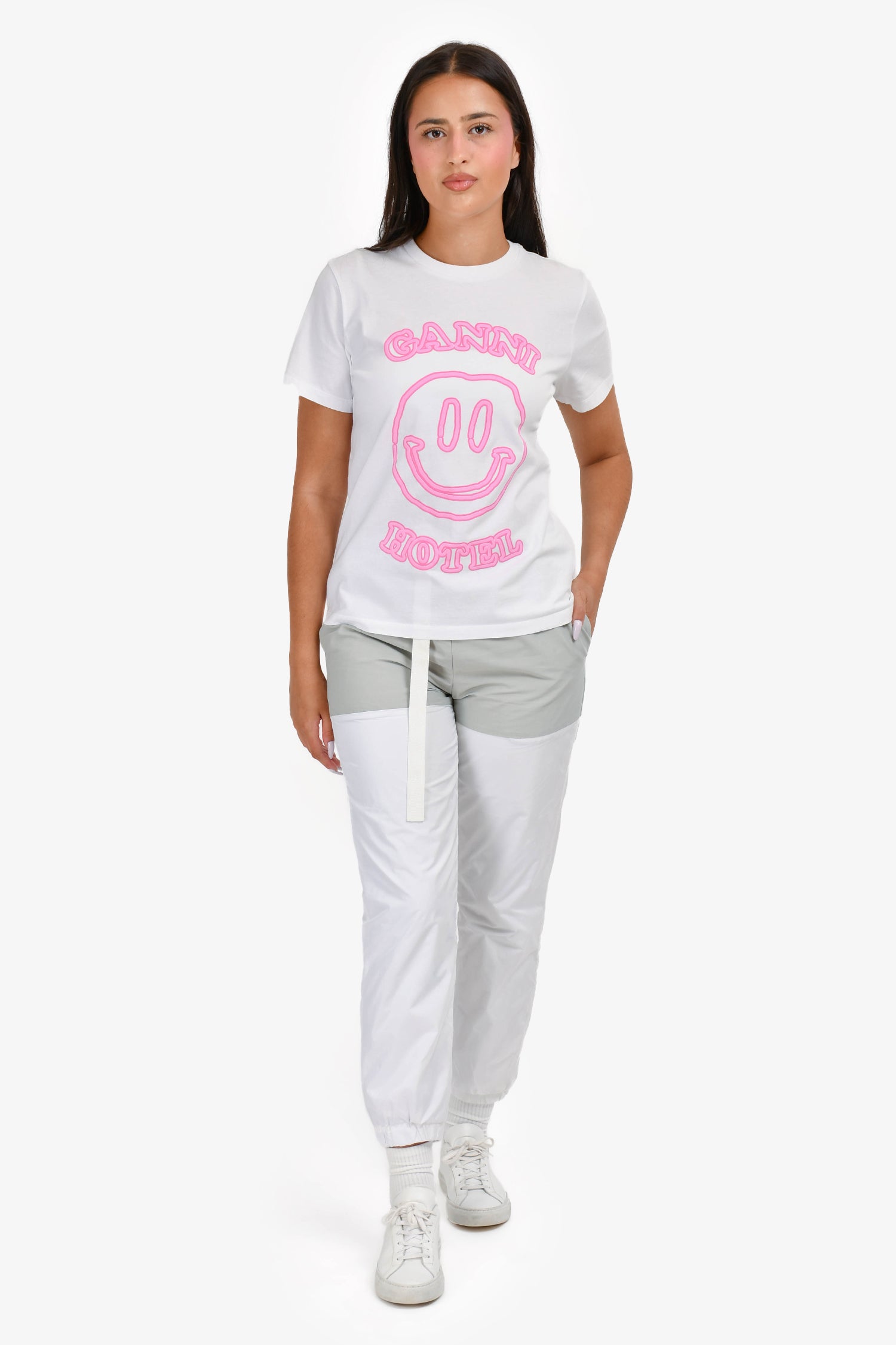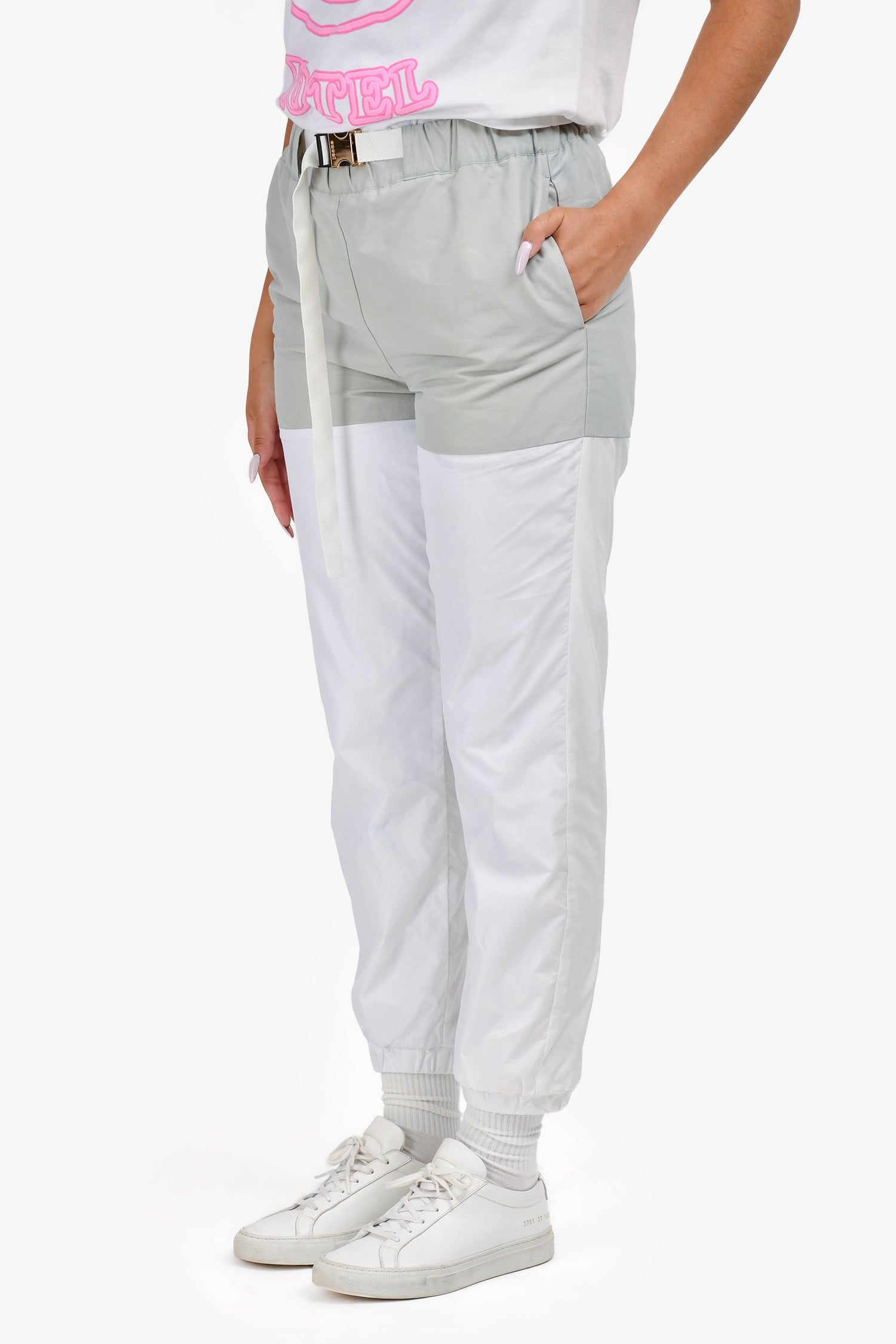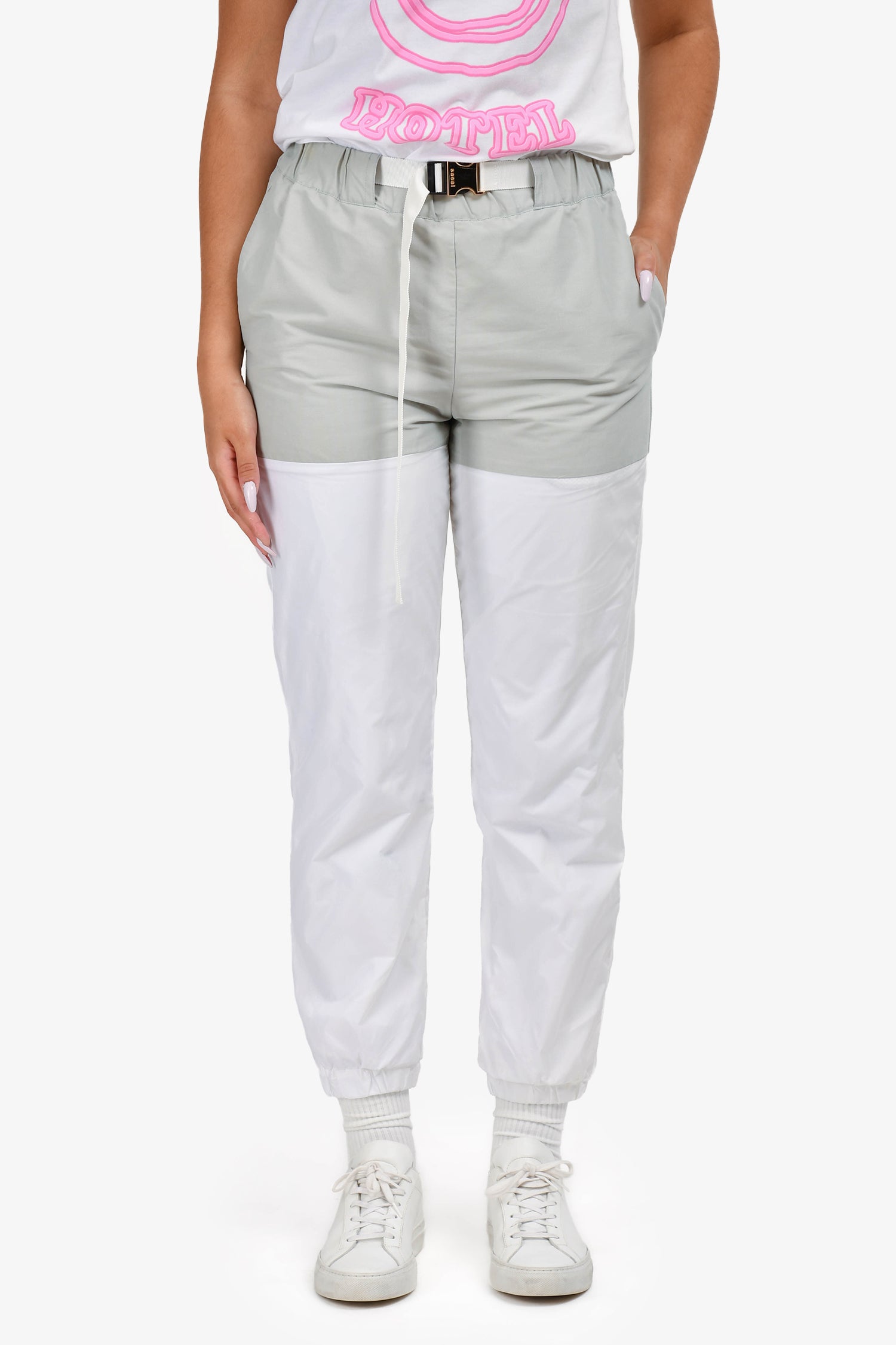 Refresh availabilitySacai 2021 Grey/White Belted Track Pants. Mid-rise waist with integrated belt. Contrast white panel detailing. Side and back pockets. Tapered leg. Zip fly with button closure. Tonal stitching.