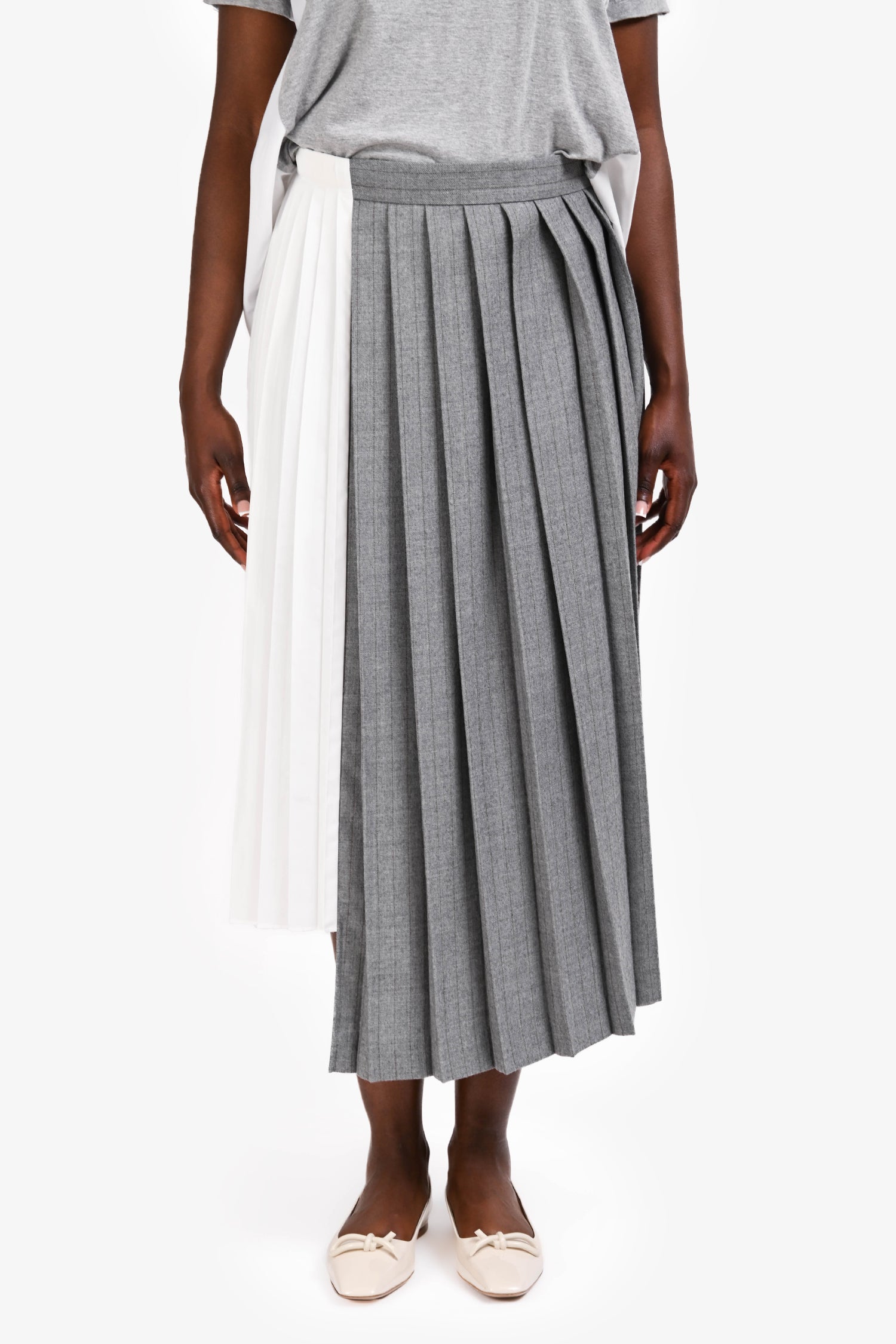 Refresh availabilitySacai 2023 Grey/White Wool Blend Pleated Midi Skirt. Side zip closure. Lined interior. Tonal stitching.