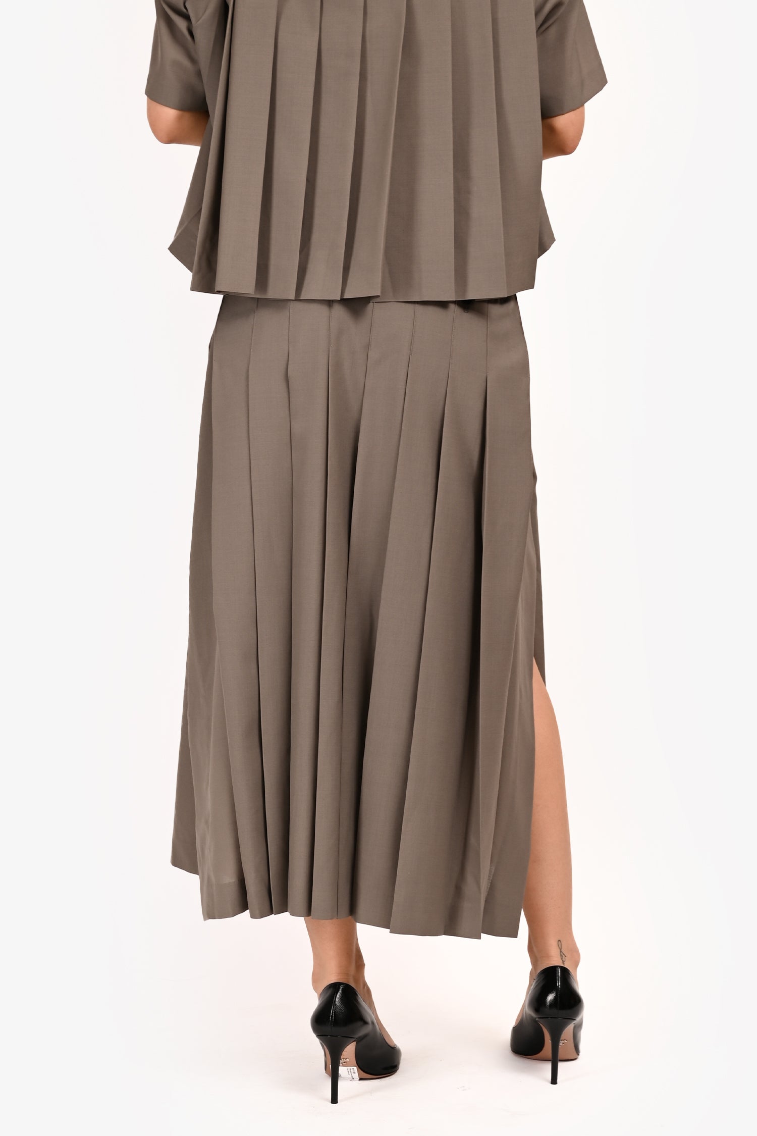 Refresh availabilitySacai Green Pleated Midi Skirt. Pull-on. Front zip with clasp closure. 2 side pockets. 2 back pockets with button-up closure. Side slits. Lined interior. Silver-tone hardware. Tonal stitching.