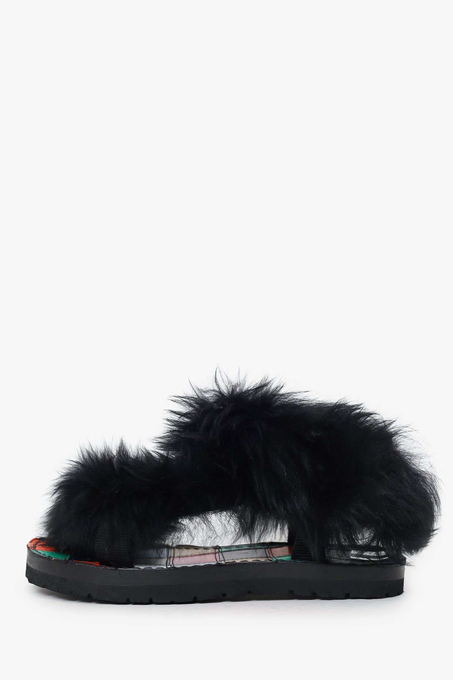 Refresh availabilitySacai Black Fur Sandals. Slip-on. Open-round toe. Adjustable straps with velcro closure. Tonal stitching.