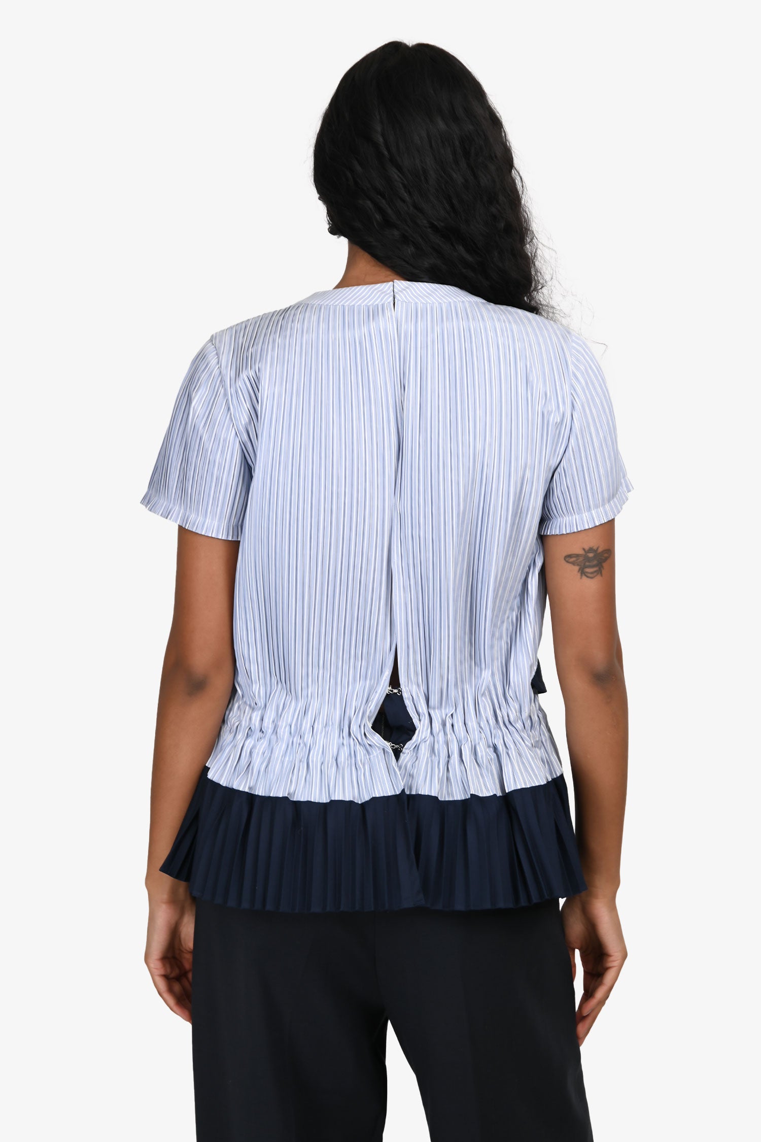 Refresh availabilitySacai Blue Striped Cotton Front Pocket Pleated Top. Round neckline. Rear hook closures. 2 front pockets with fold-over flap and snap-button closure. Toggle drawstring at front, near the hemline. Tonal stitching.