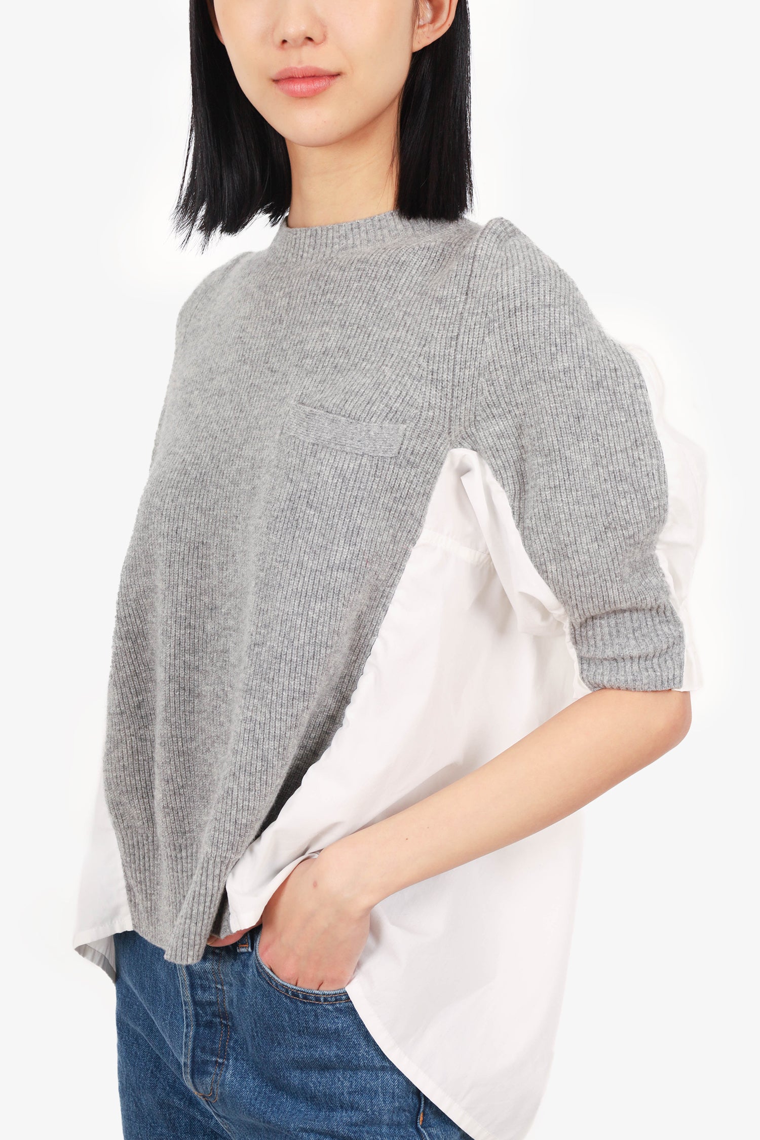 Refresh availabilitySacai Grey/Wool Wool Knit Front 3/4 Sleeve Blouse. Pull-on. Rear button-up closure. Single front slip pocket. Elasticated cuffs. Unlined. Tonal stitching.