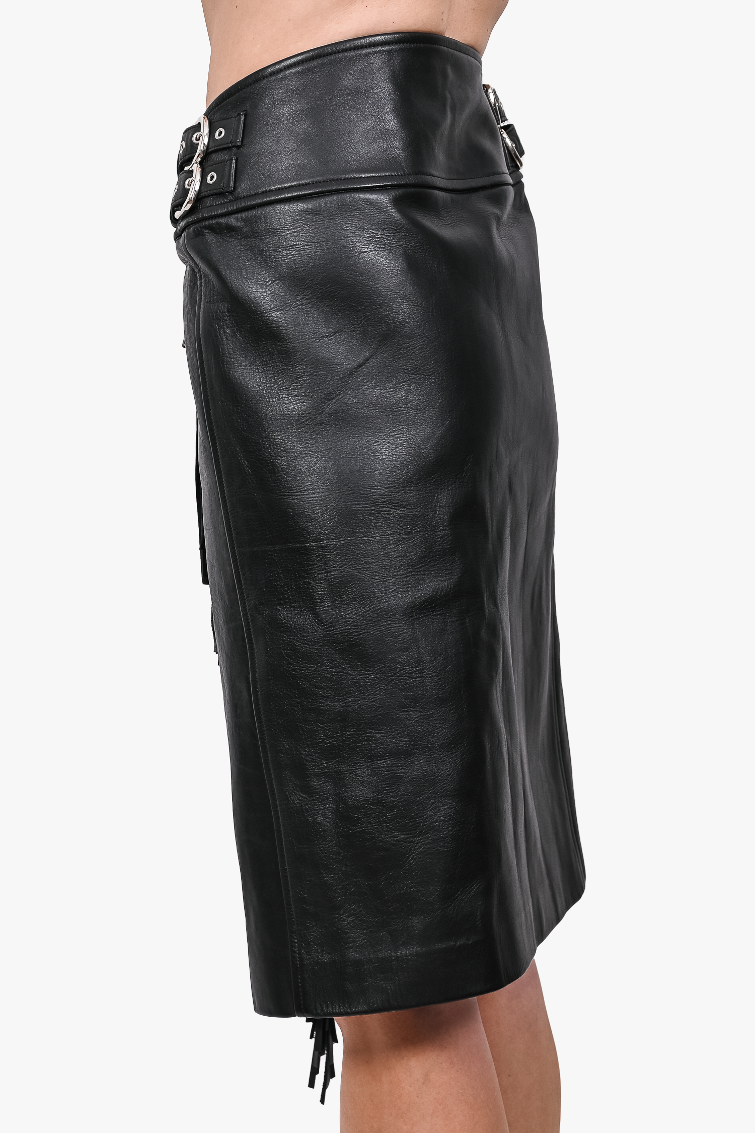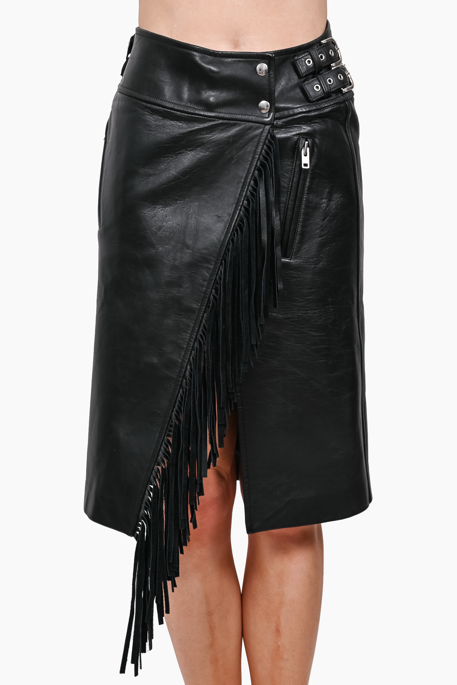 Refresh availabilitySacai Luck Black Leather Fringe Midi Skirt. Front snap button closures. Front zip pockets. Lined. Tonal stitching.