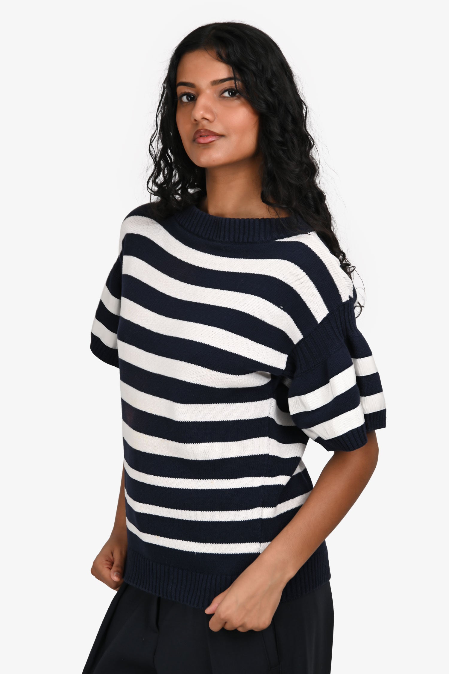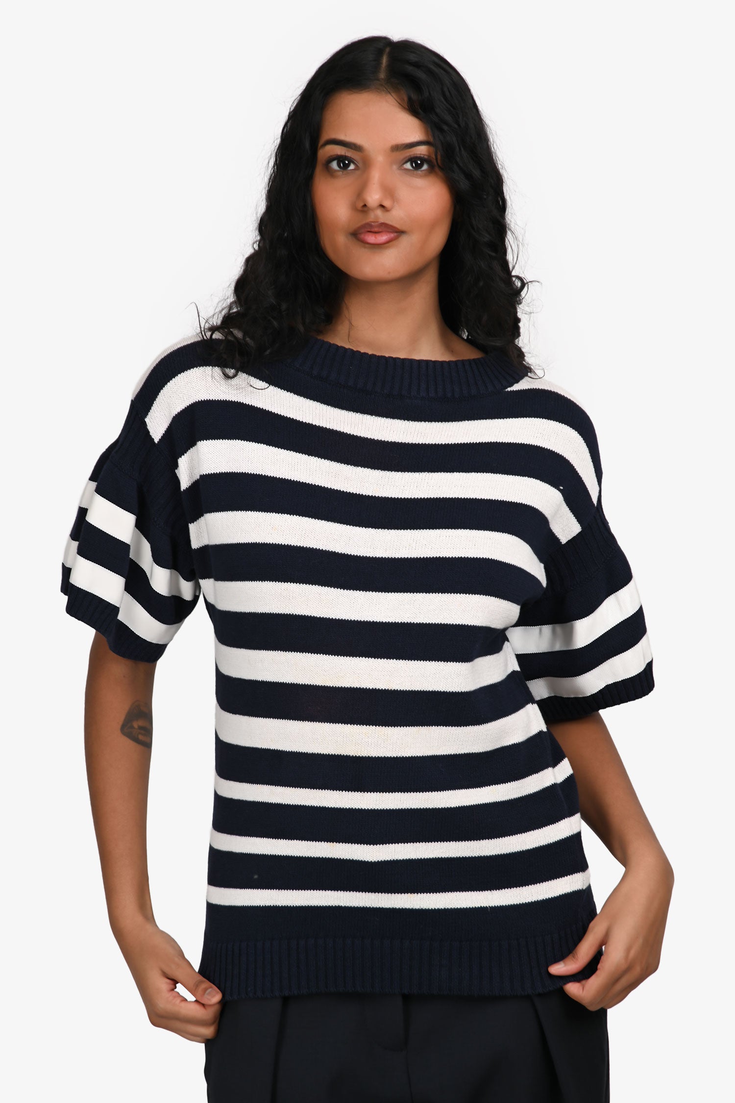 Refresh availabilitySacai Luck Navy/White Cotton Striped Sweater. Round neckline. Ribbed neckline, cuffs and hem. Tonal stitching.