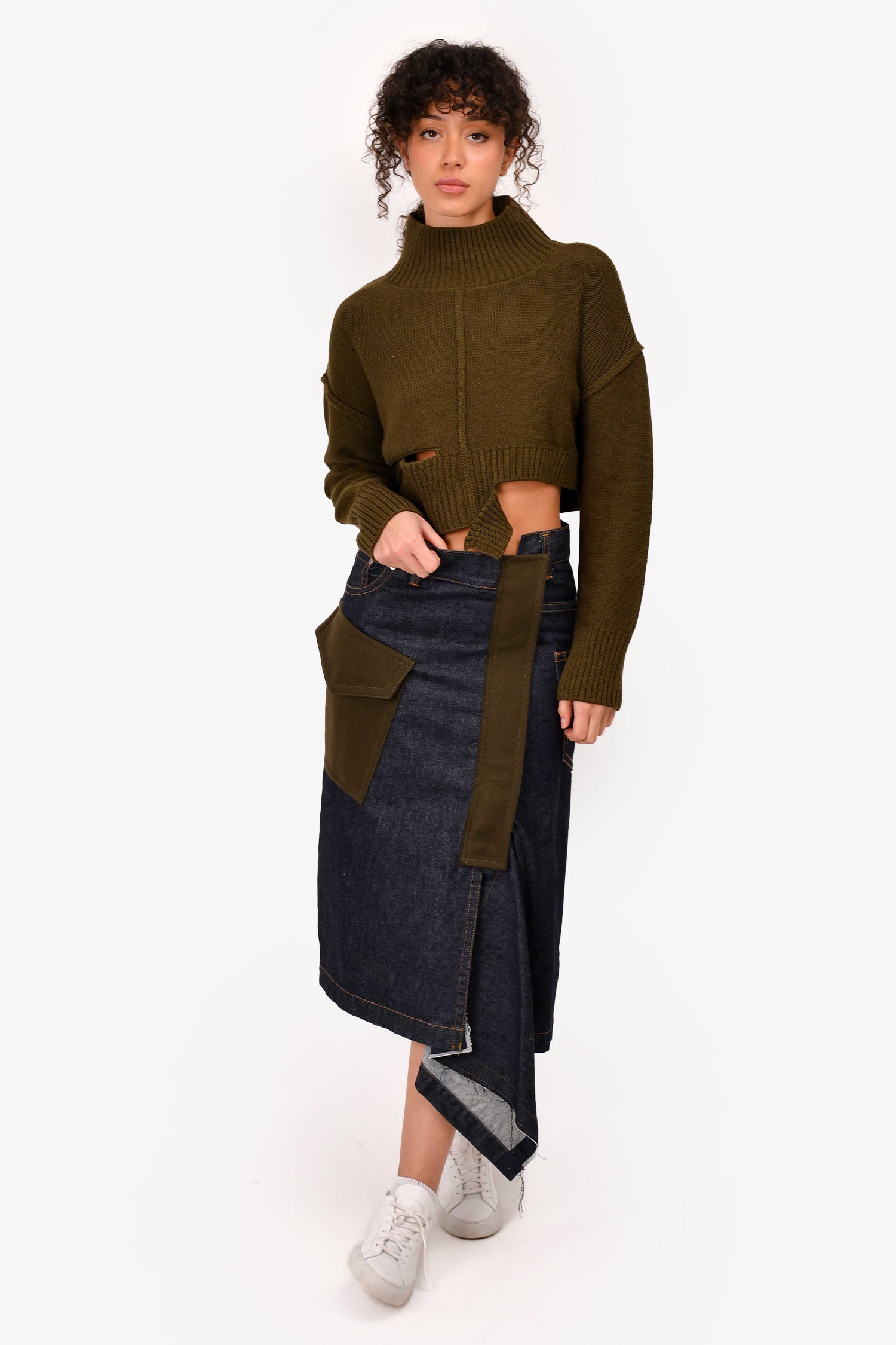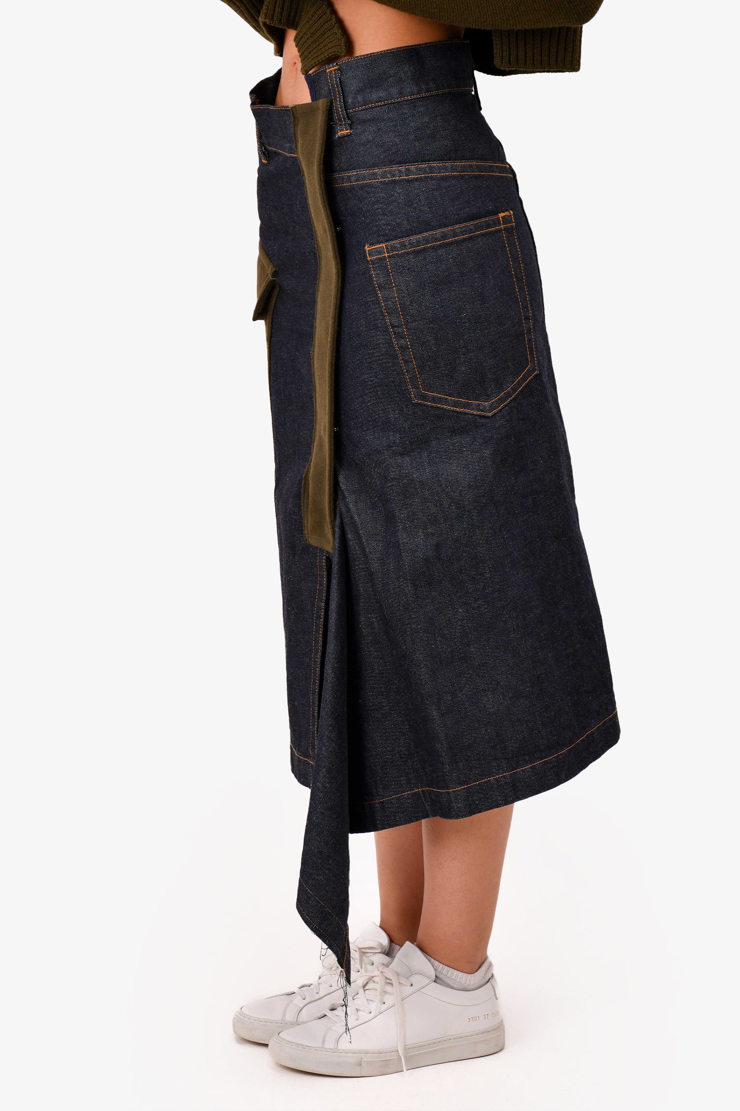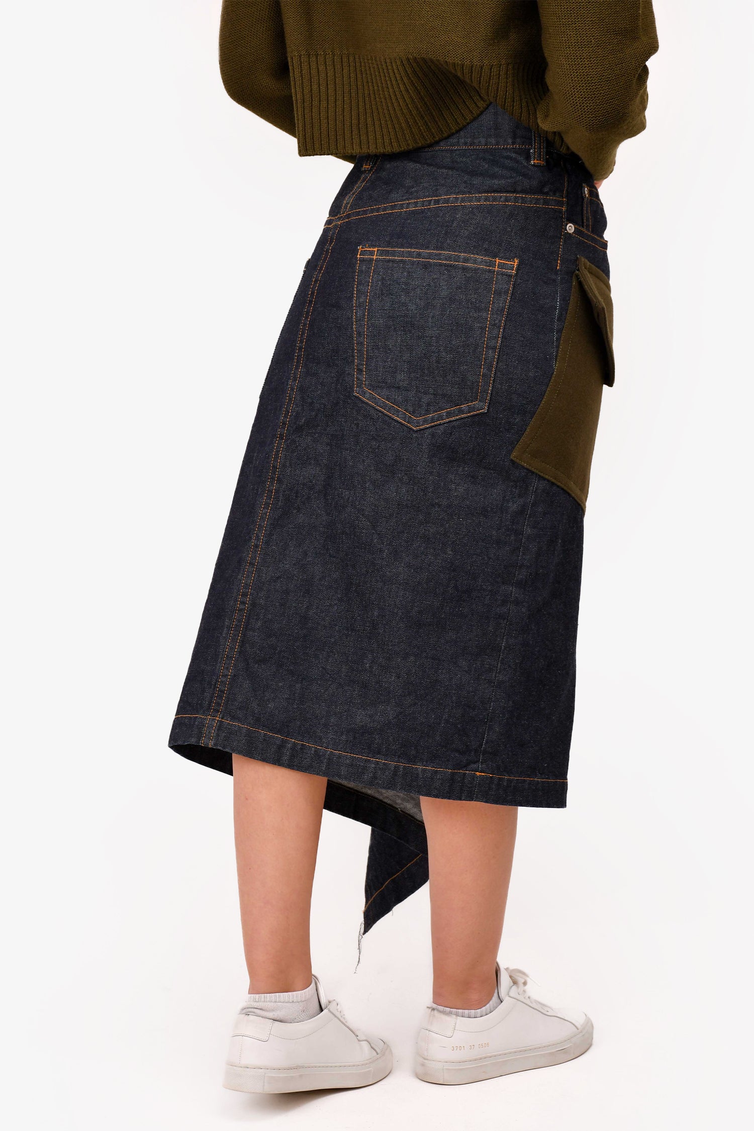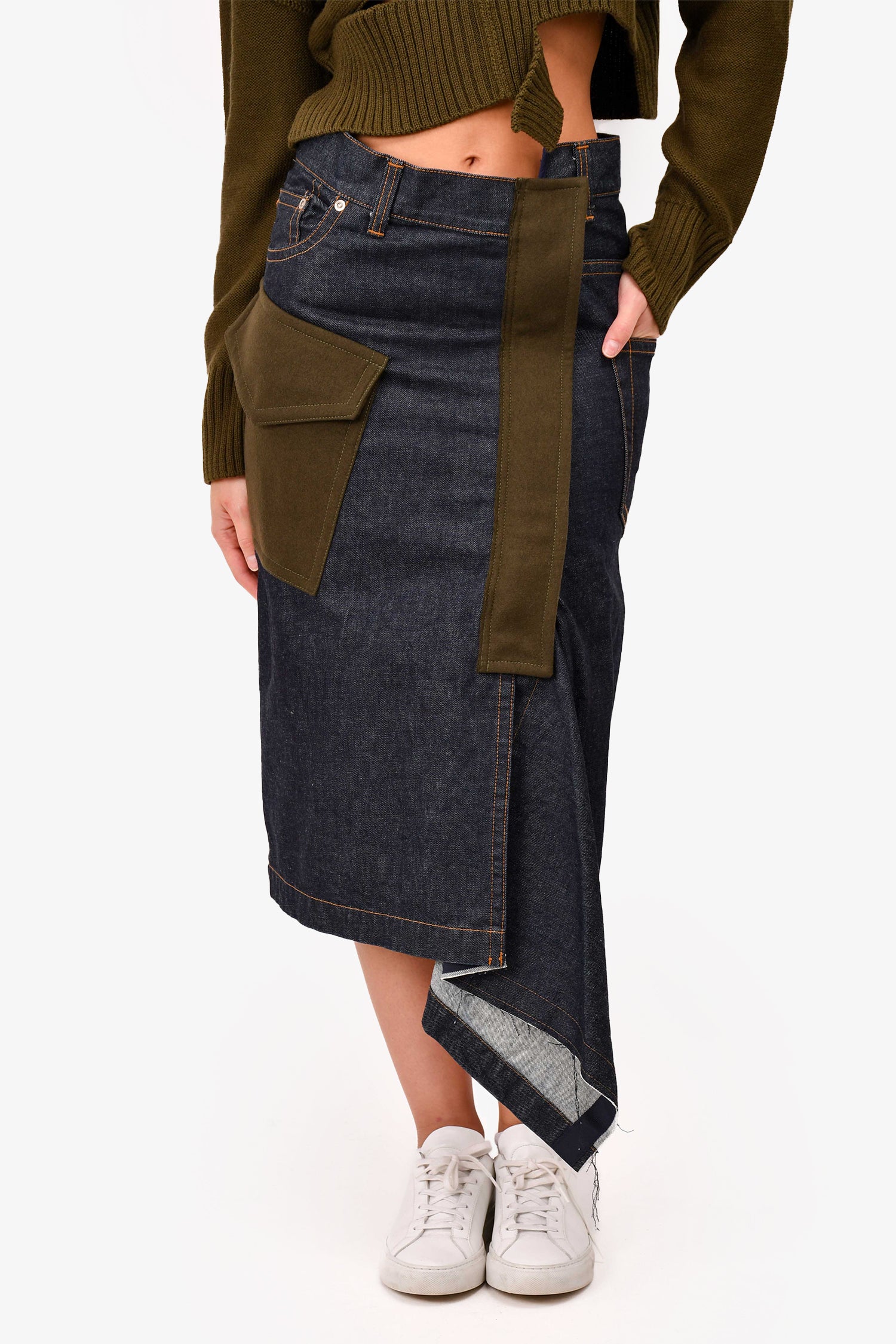 Refresh availabilitySacai Medium Wash Wool/Denim Asymmetrical Midi Skirt. Stitched wool patches. Concealed snap closures with a zipped fastening. Contrast stitching.