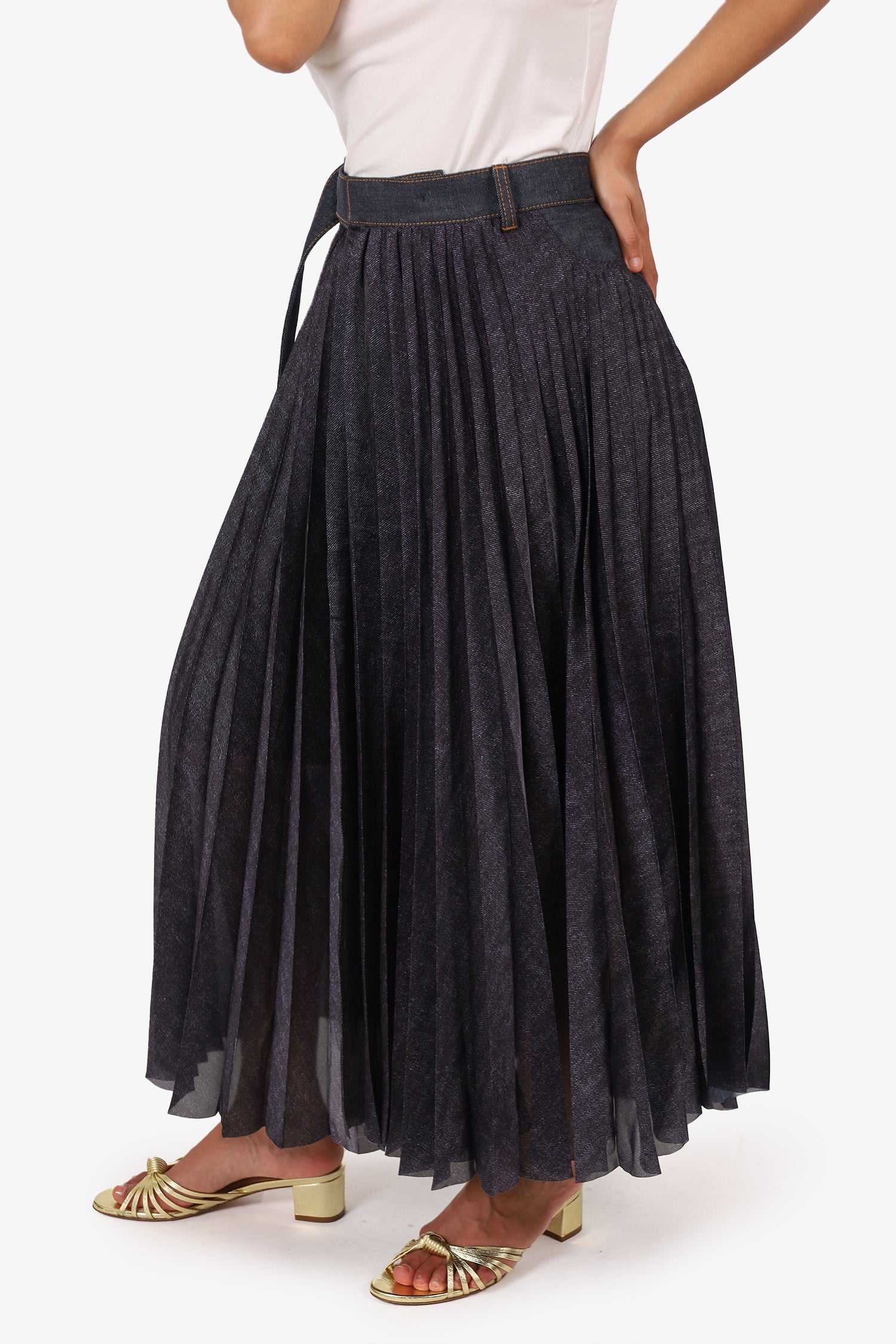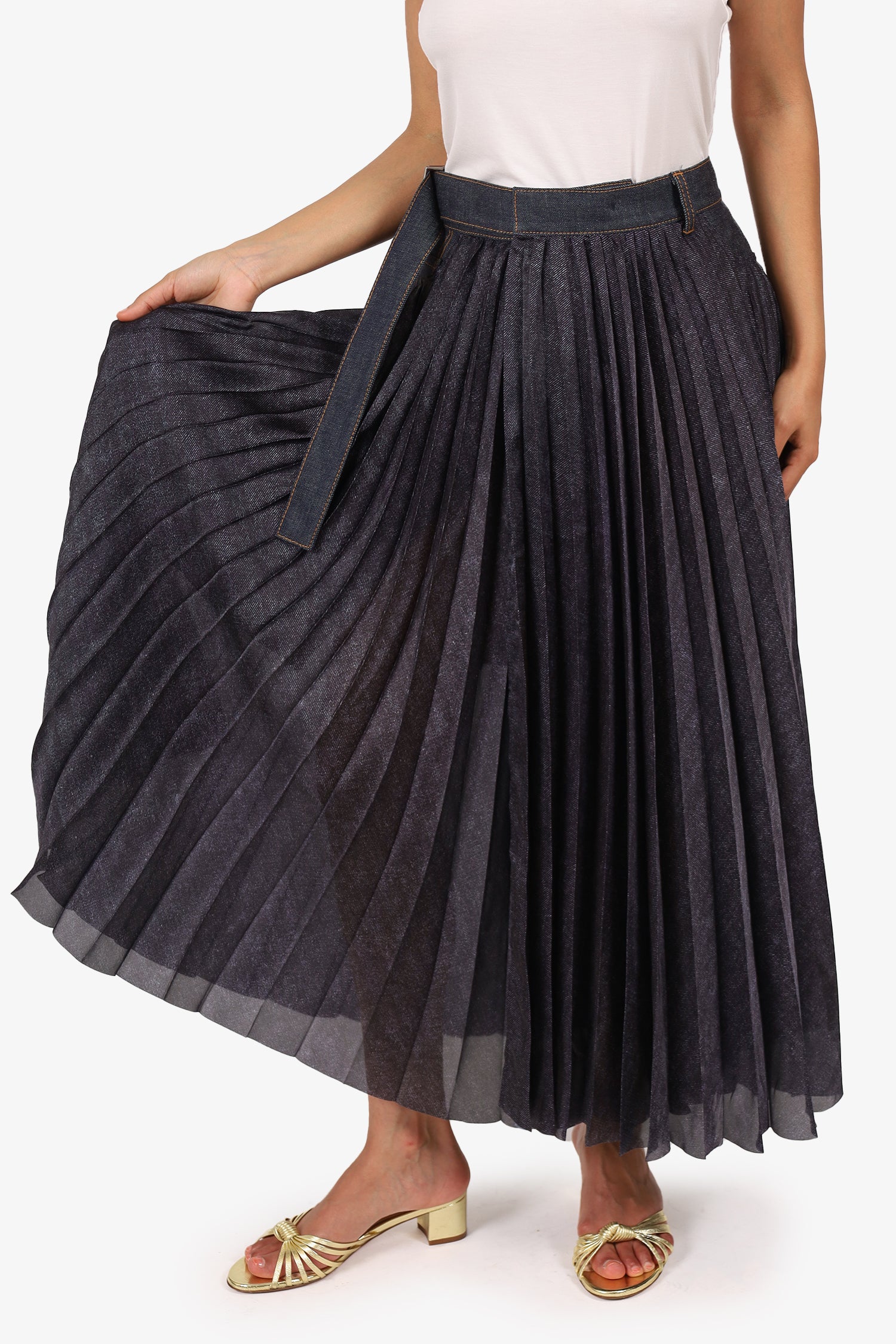 Refresh availabilitySacai Navy Denim Trimmed Pleated Midi Wrap Skirt. Slip-on. Interior button-up closure. Attached belt with adjustable pull-through closure. 2 exterior slip pocket; 1 front and 1 rear. Contrast stitching.