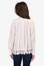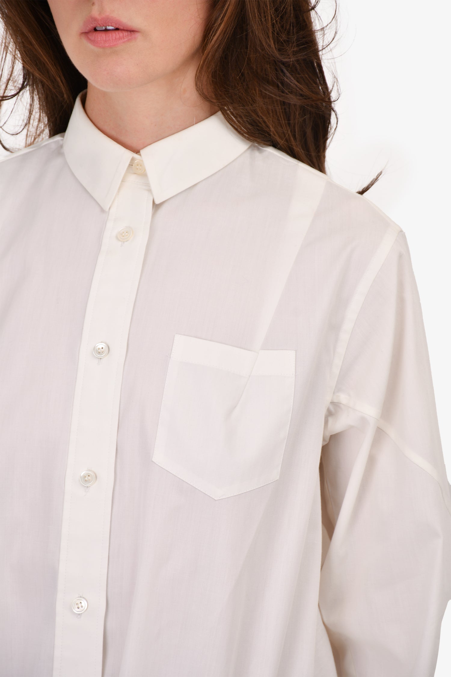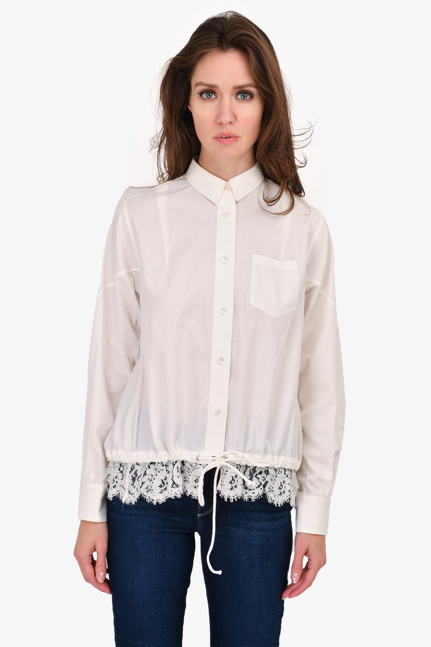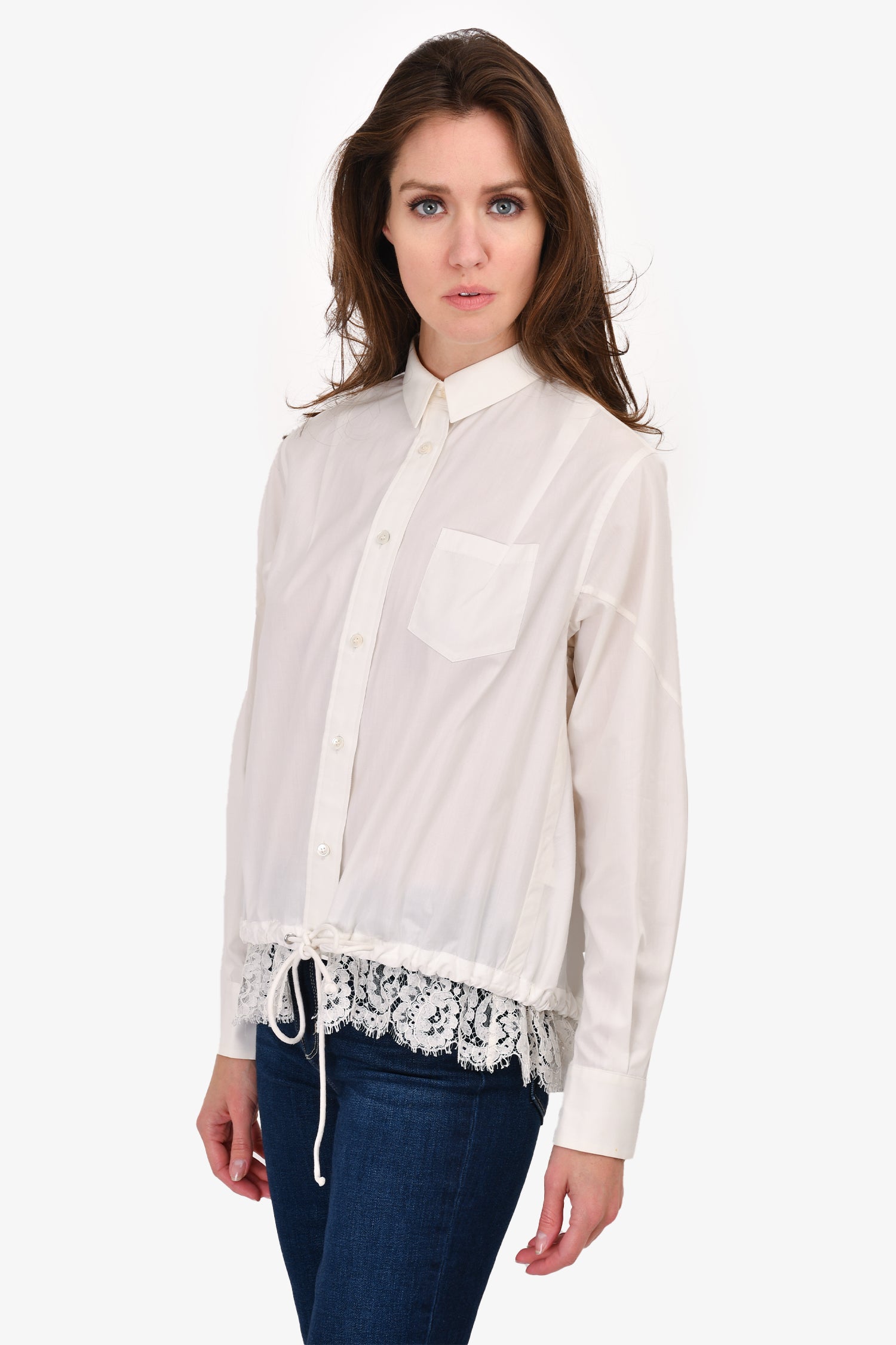 Refresh availabilitySacai White Button Up Shirt With Lace Hem Detail. Front button up and bottom snap closure. Drawstring at bottom. Unlined. Tonal stitching.