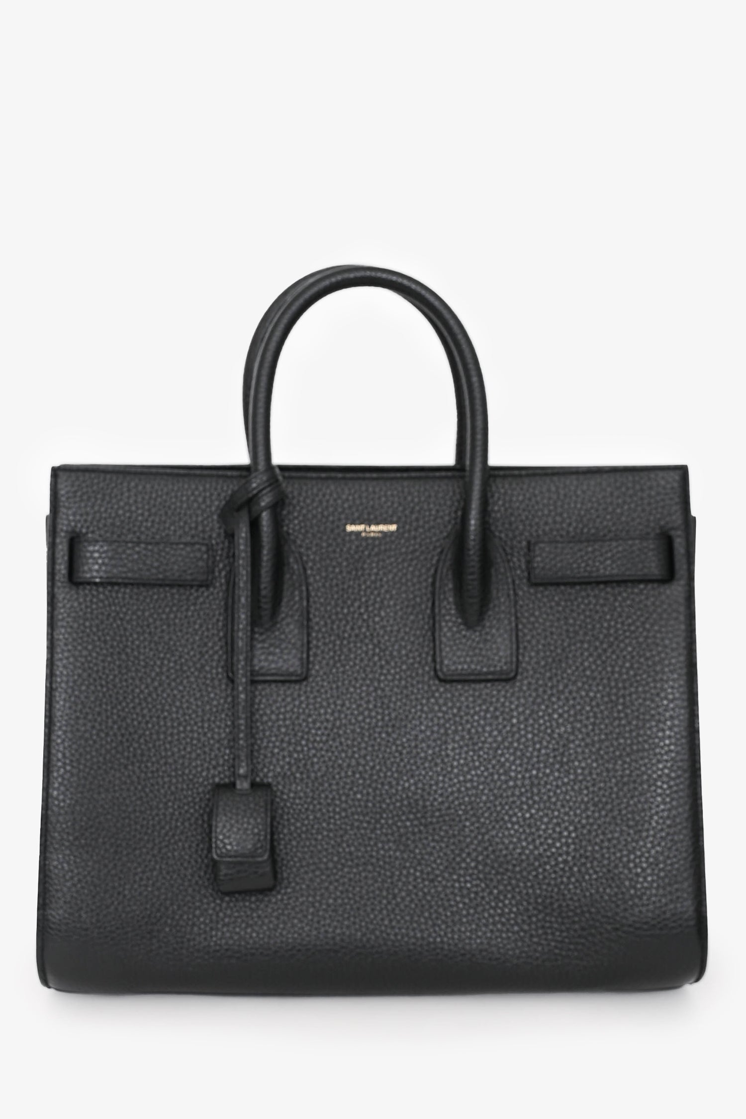 Refresh availabilitySaint Laurent 2014 Black Grained Leather Sac De Jour with Strap. Open top with accordion sides. Dual rolled top handles and detachable shoulder strap. 3 interior compartments; 2 with zippered pockets and 1 with 2 slip pockets. 5 protective base studs. Detachable exterior lock detail. Silver-tone hardware. Tonal stitching.