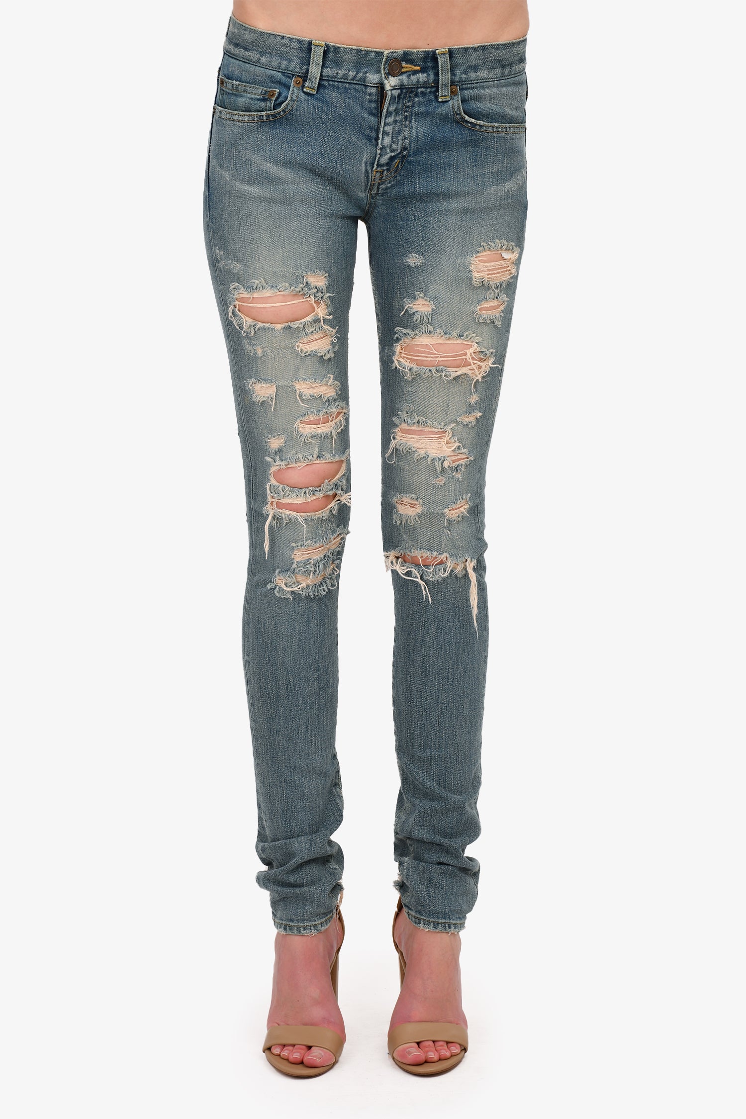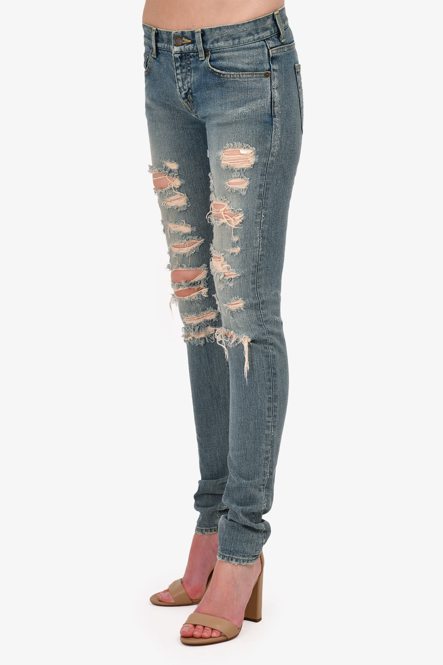 Refresh availabilitySaint Laurent 2014 Blue Denim Distressed Skinny Jeans. Front button and zip up closure. Front and rear pockets. Waist belt loops.