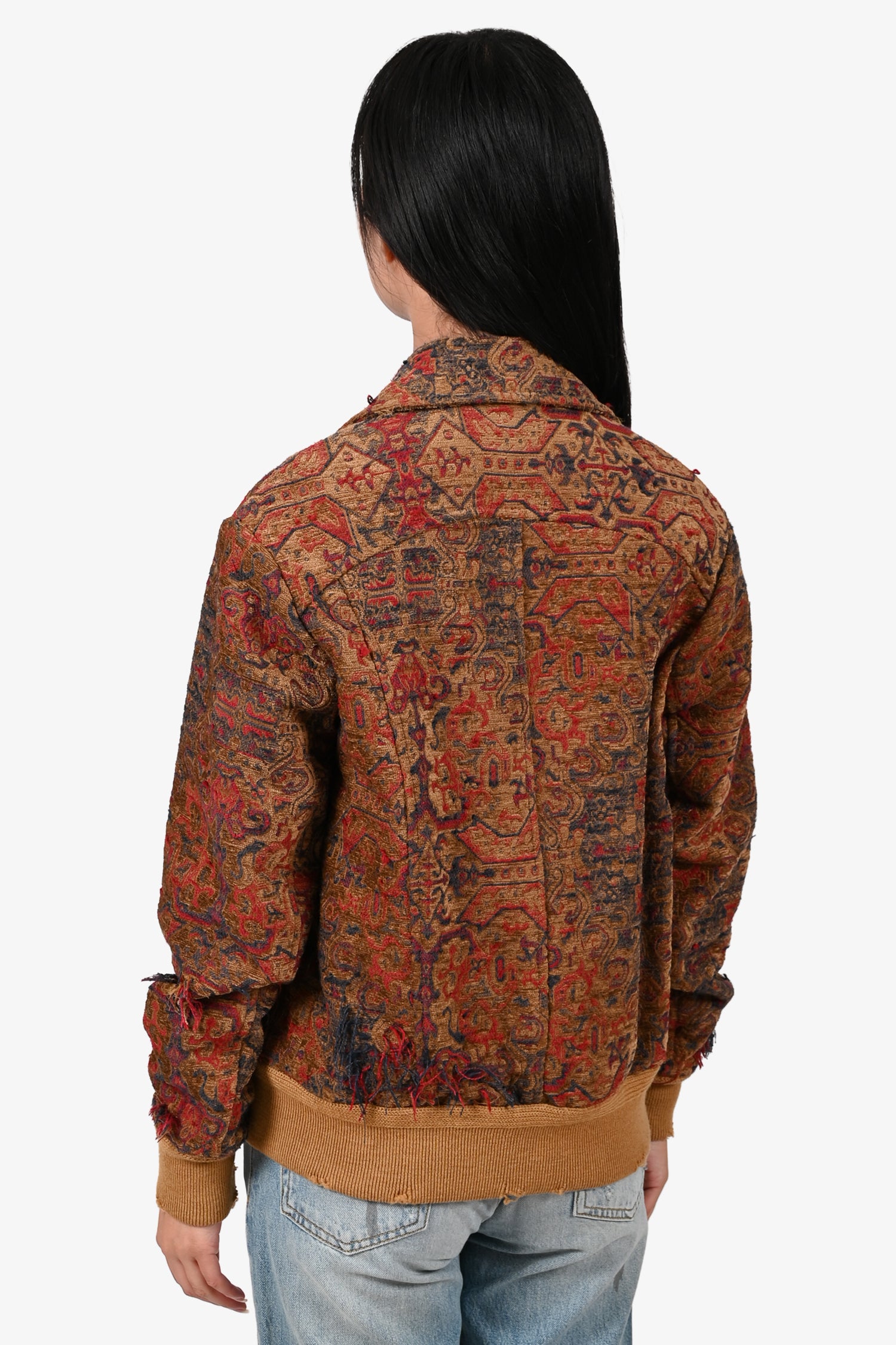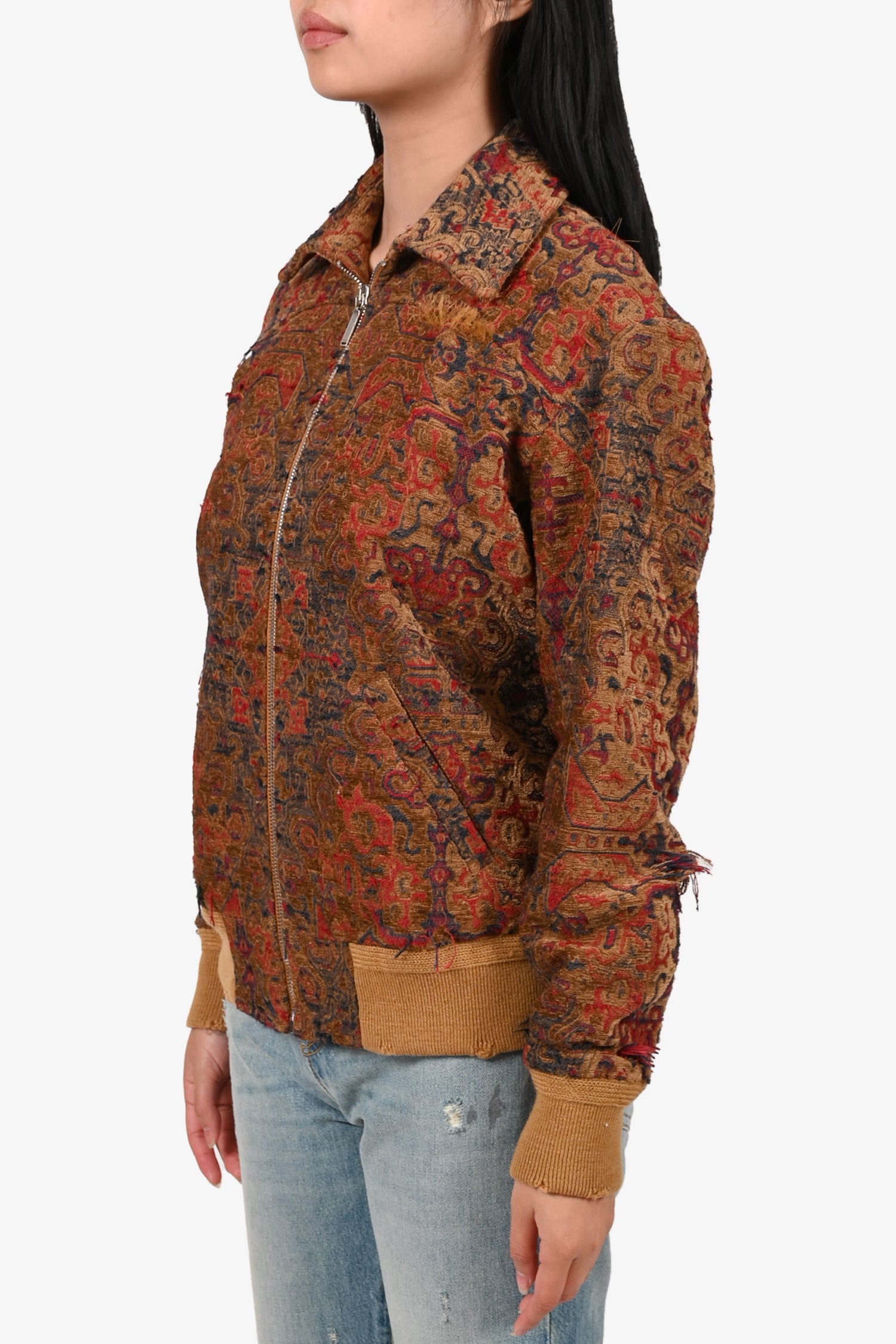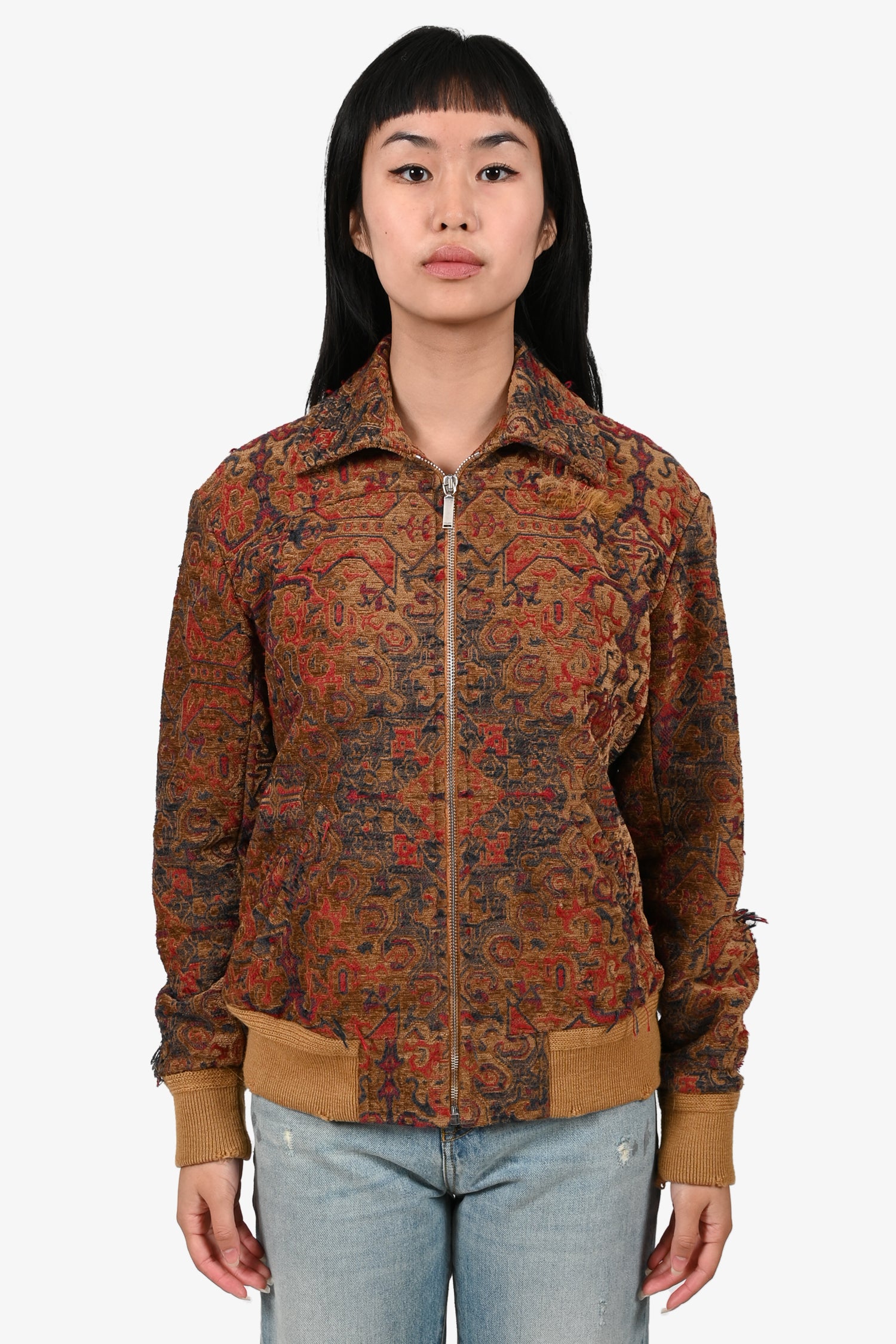 Saint Laurent 2016 Brown/Red Distressed Tapestry Jacquard Zip-Up Jacket Size 36