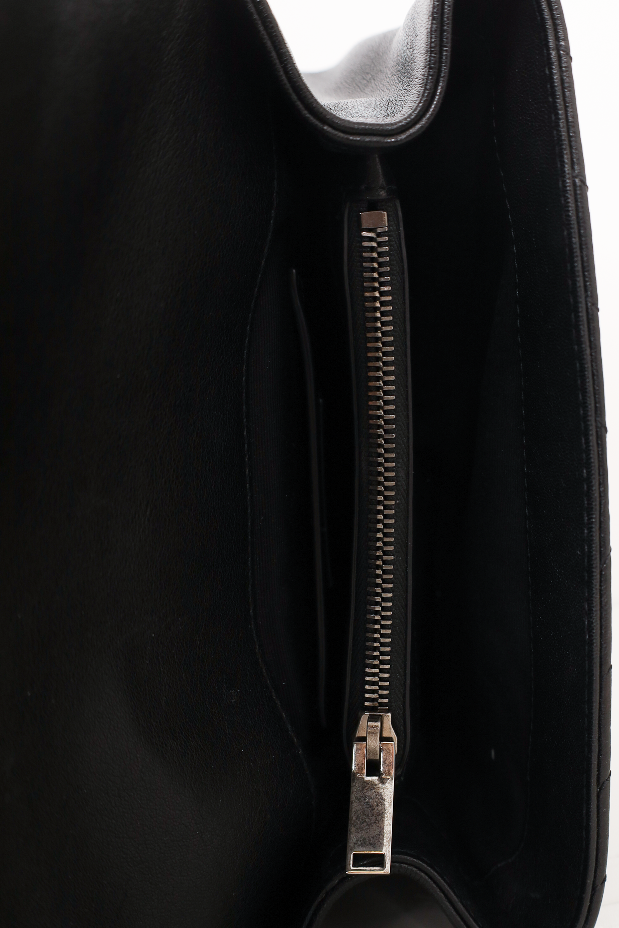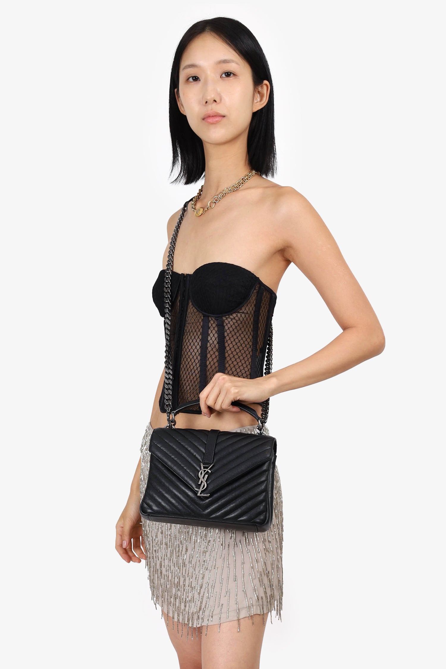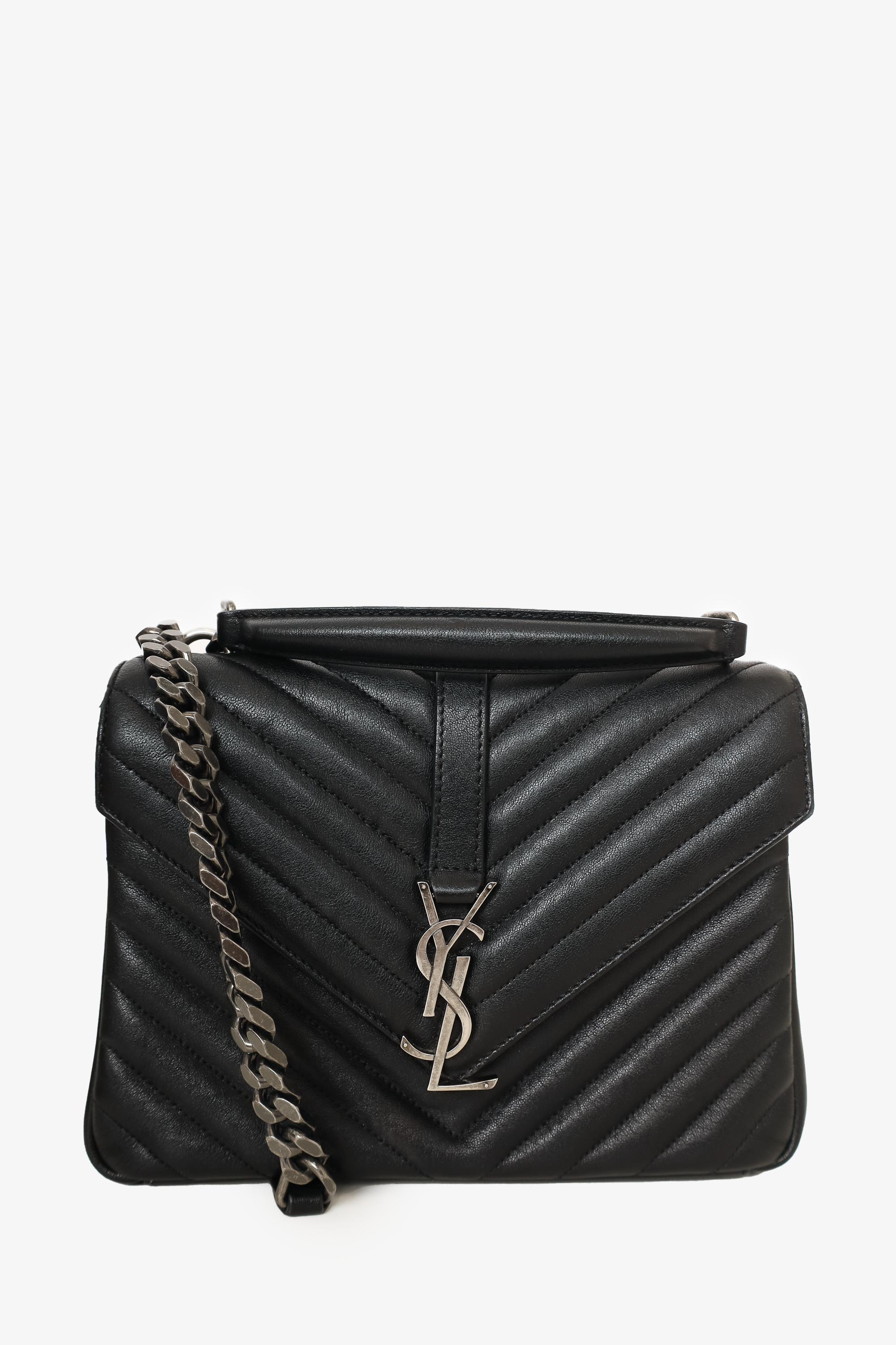 Refresh availabilitySaint Laurent 2017 Black Leather Chevron Medium College Crossbody Bag. Front fold-over flap with magnetic button. Top handle. Single exterior slip pocket on back. Single interior wall slip pocket. Middle divider pocket with zipper closure. Tonal stitching. Silver-tone hardware. Detachable crossbody strap.
