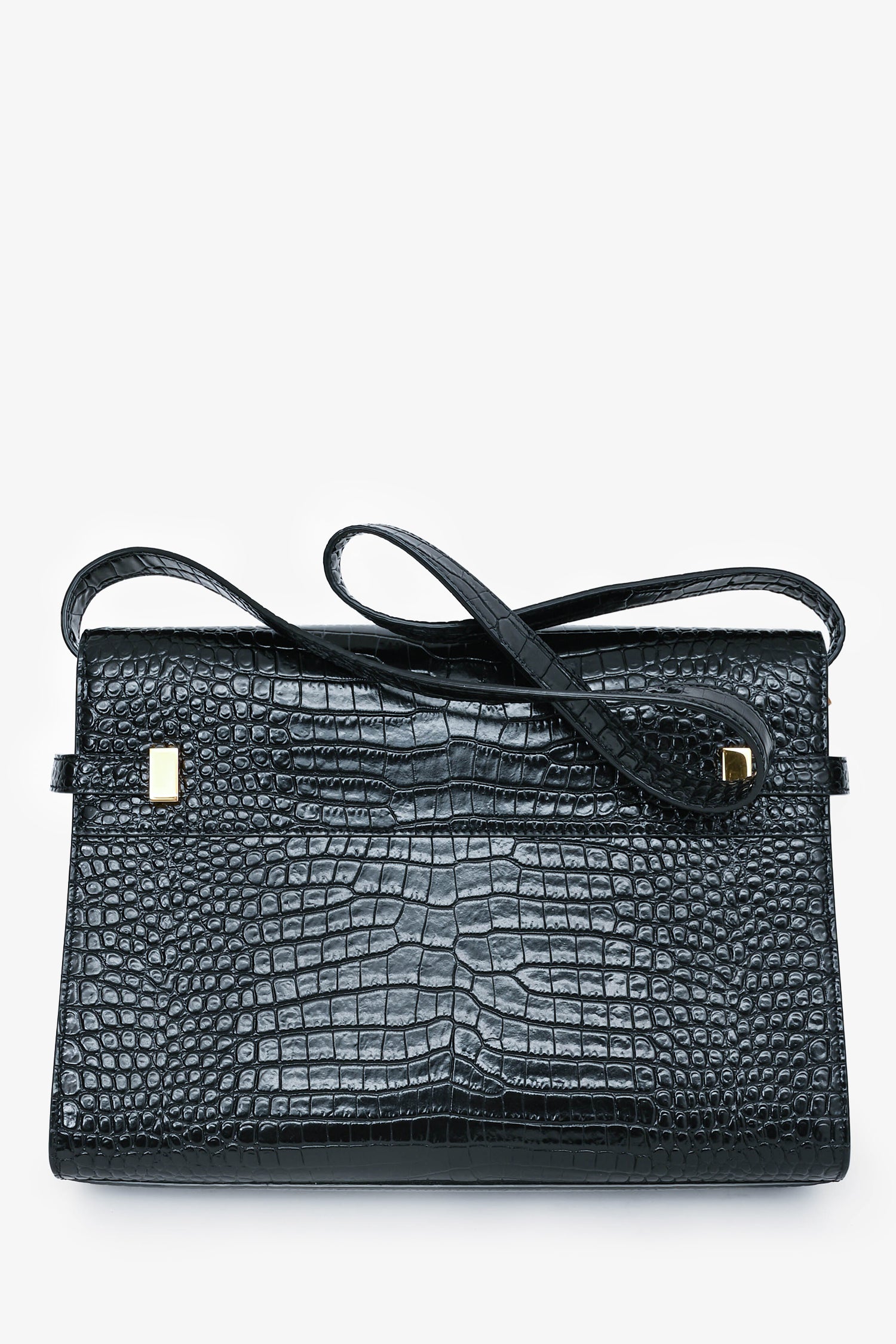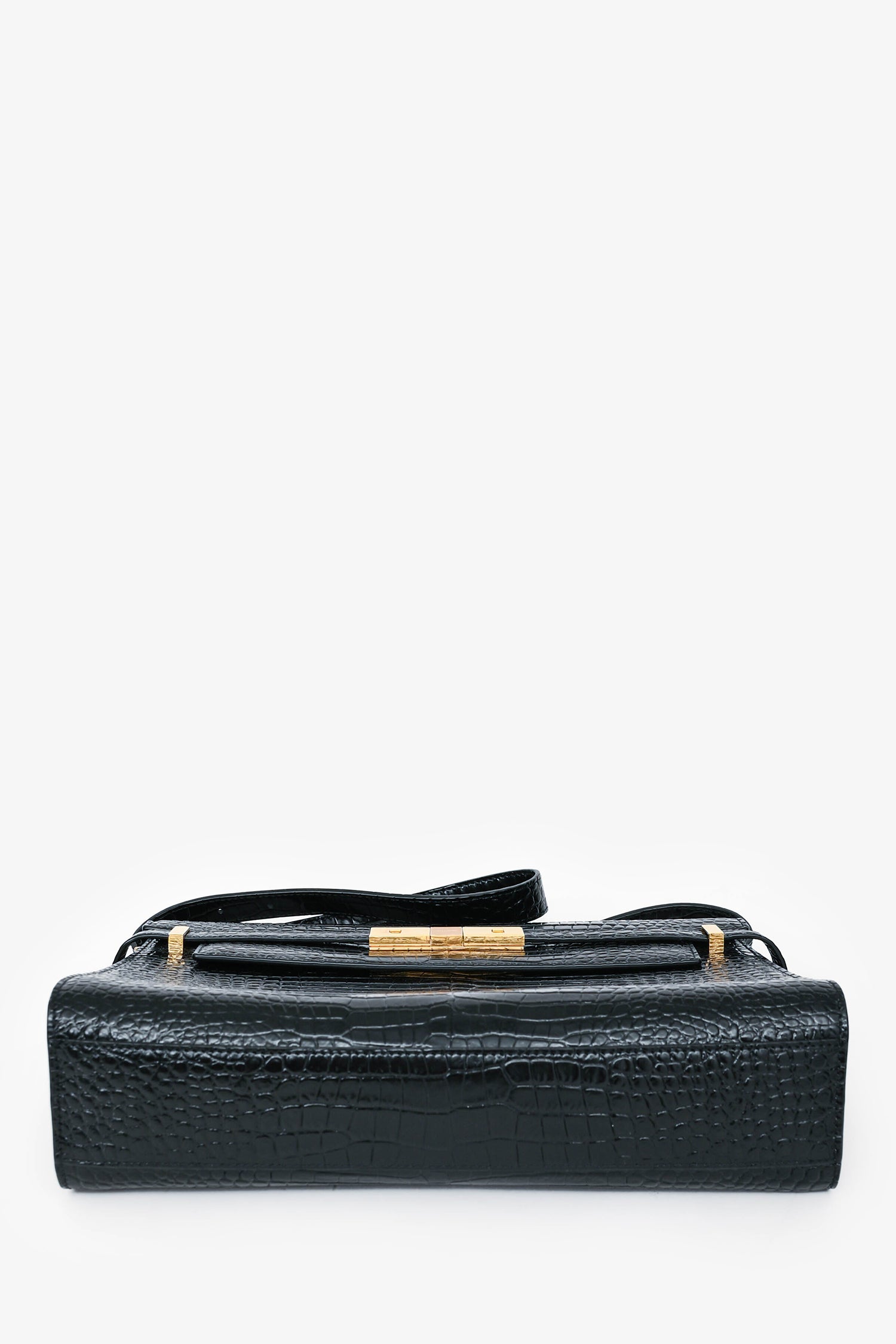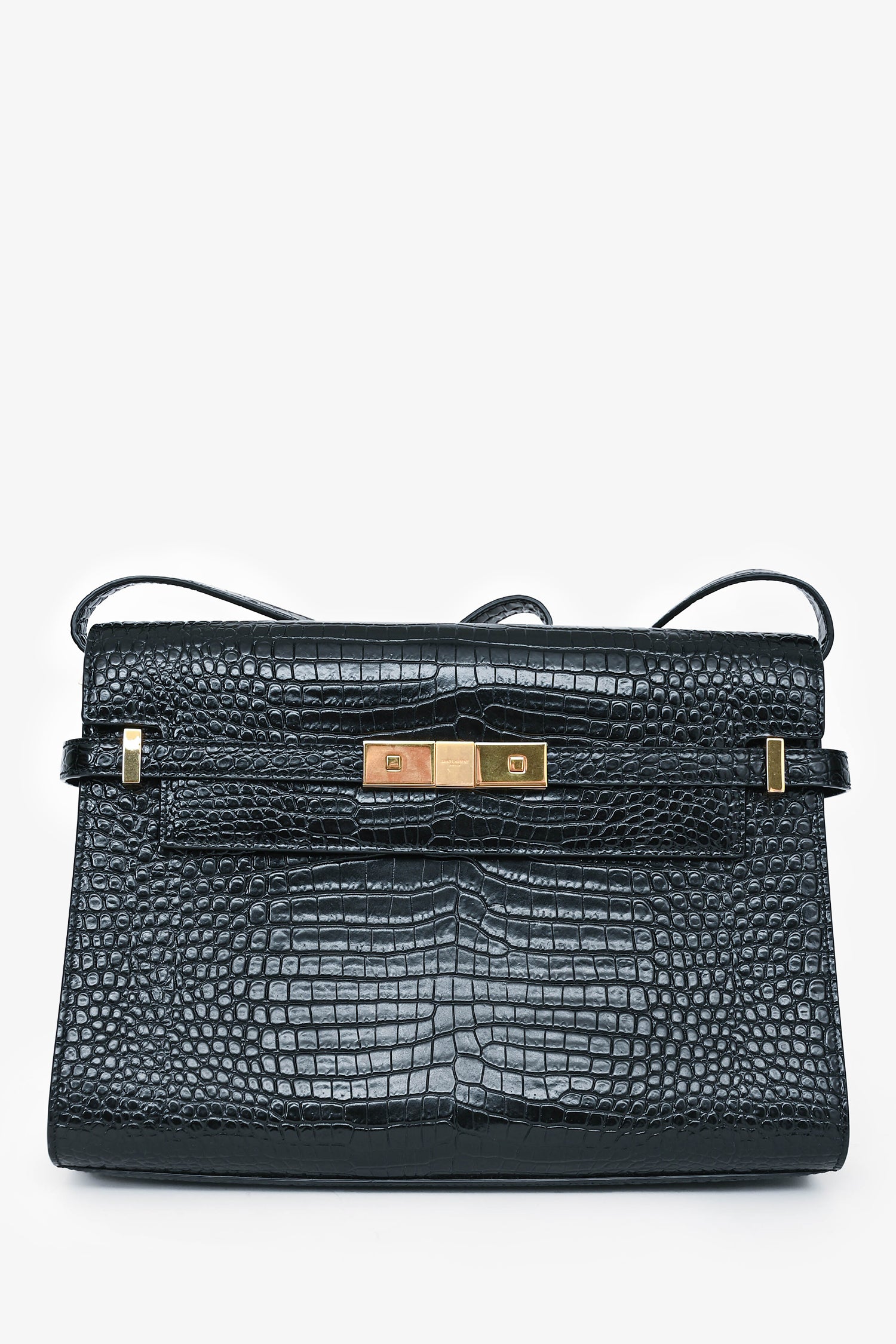 Refresh availabilitySaint Laurent 2020 Black Croc Embossed Leather Medium Manhattan Shoulder Bag. Gold-tone hardware. Magnetic closures with pull through straps. Fold-over flap. Single shoulder strap. Lined interior with a single compartment. Coated trimming. Tonal stitching.