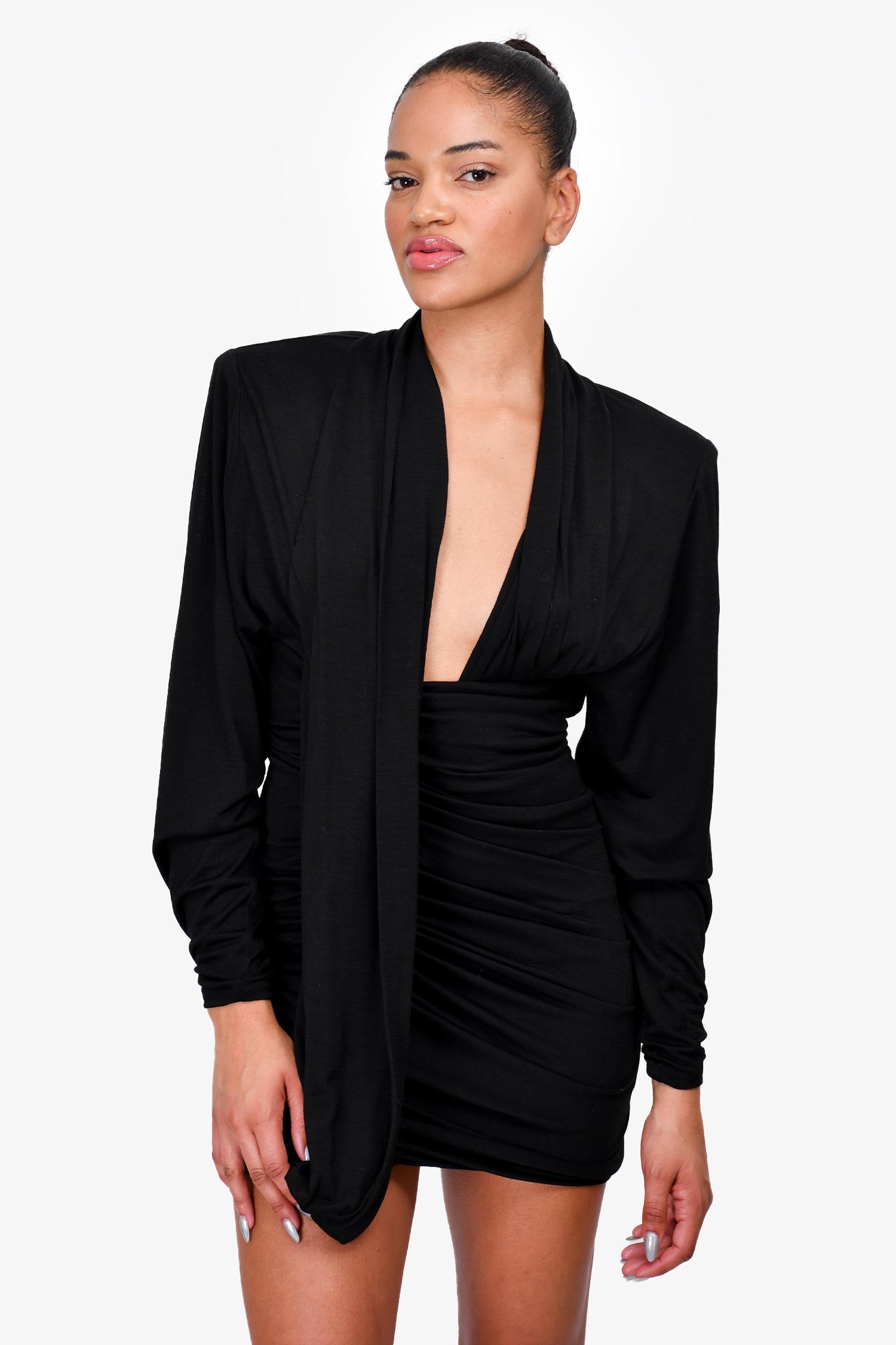 Saint Laurent 2023 Black Wool Shoulder Padded Ruched Mini Dress Size 38
