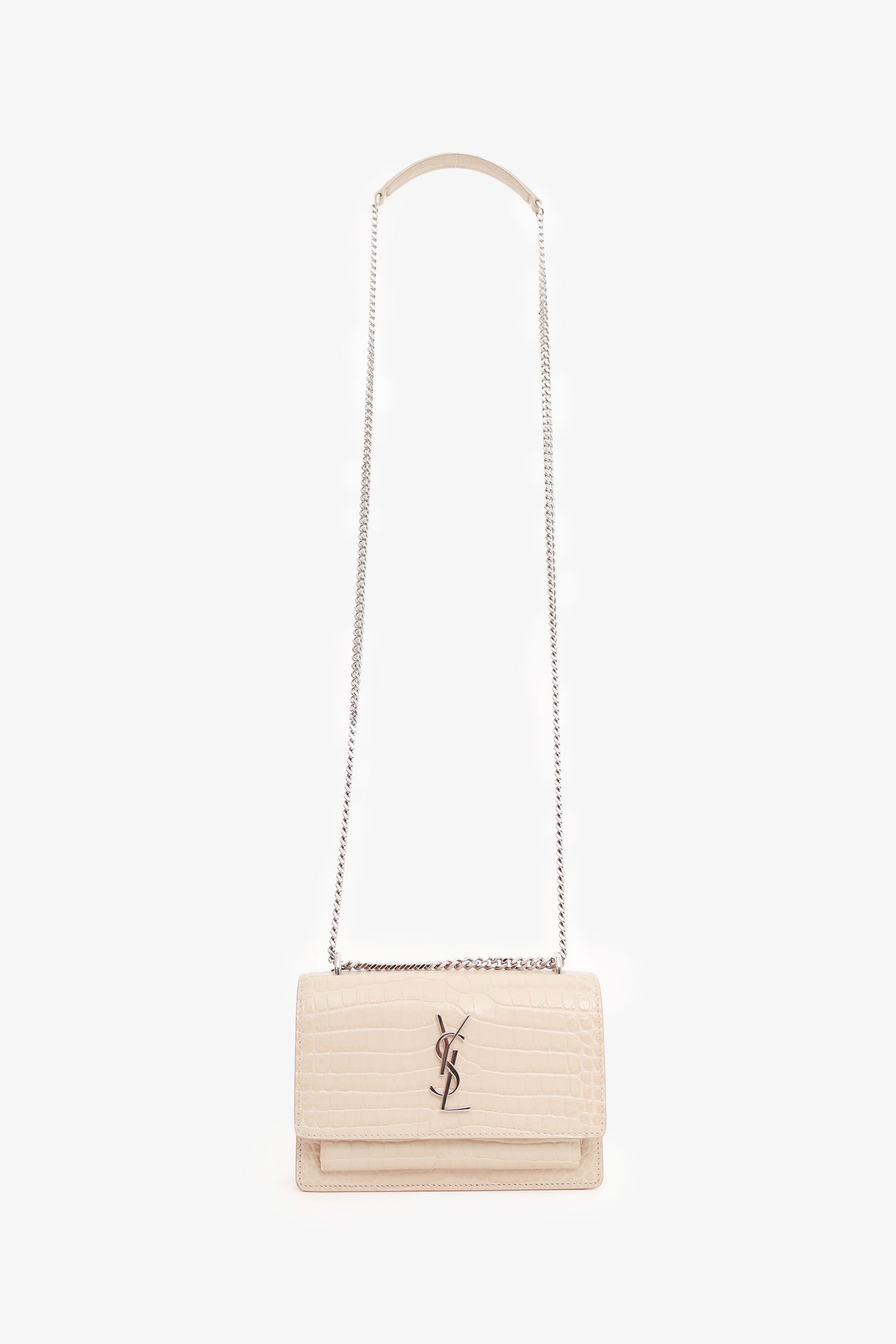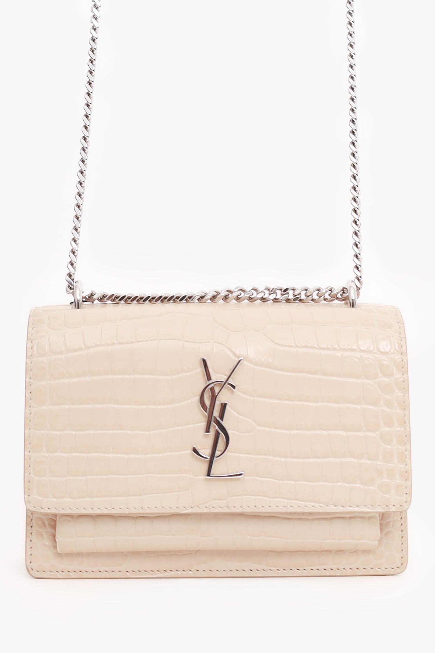 Saint Laurent Beige Croc Embossed Leather 'Sunset' Mini Crossbody Bag. Front fold-over flap with magnetic button closure. Double chain shoulder strap. Exterior rear slip pocket. 3 interior compartments; front slip pocket, centre zip closure pocket, back open interior with 8 card slots and 1 slip pocket. Silver-tone hardware. Tonal stitching.