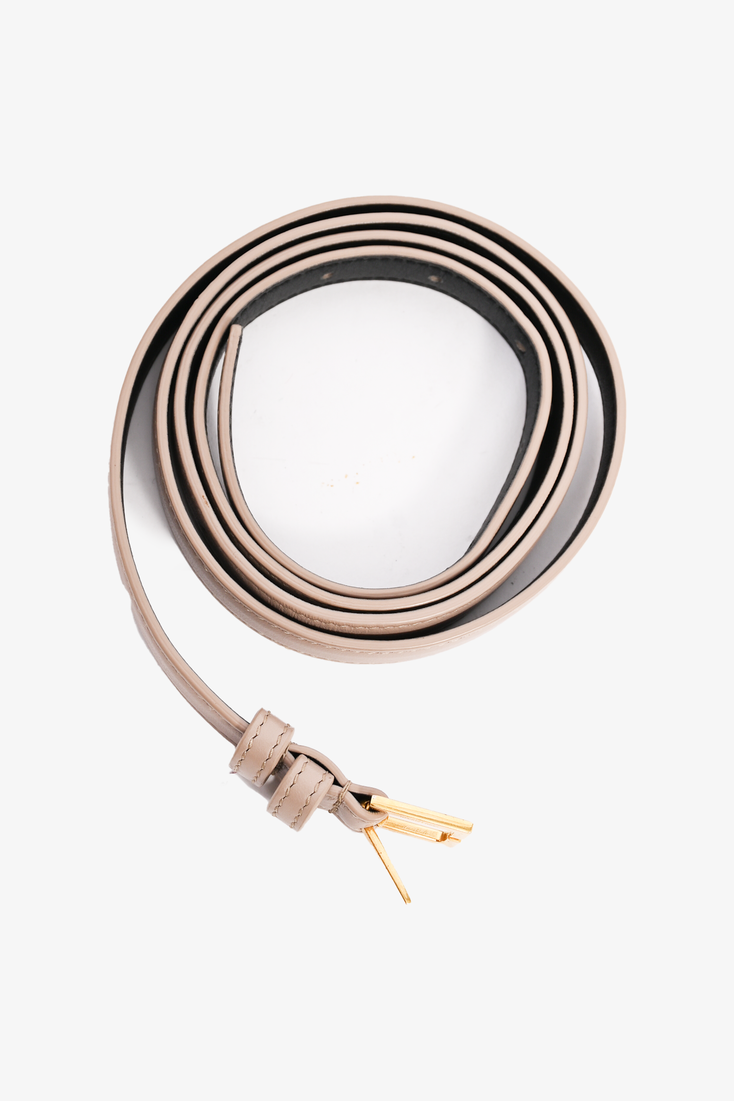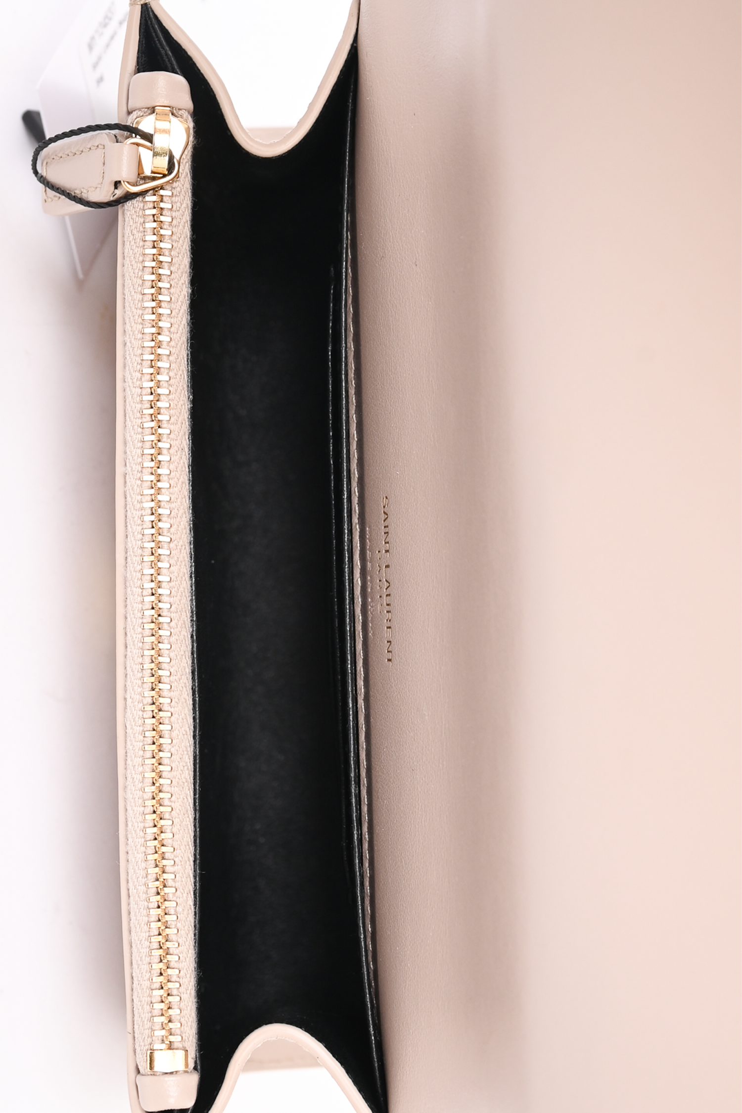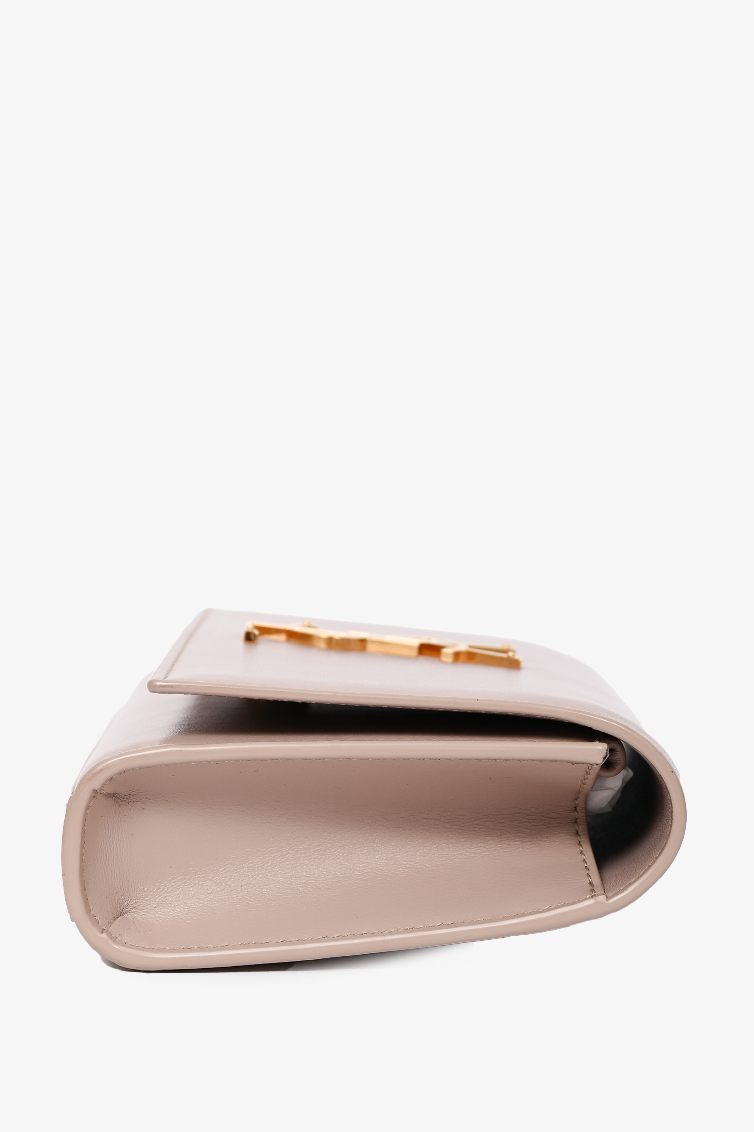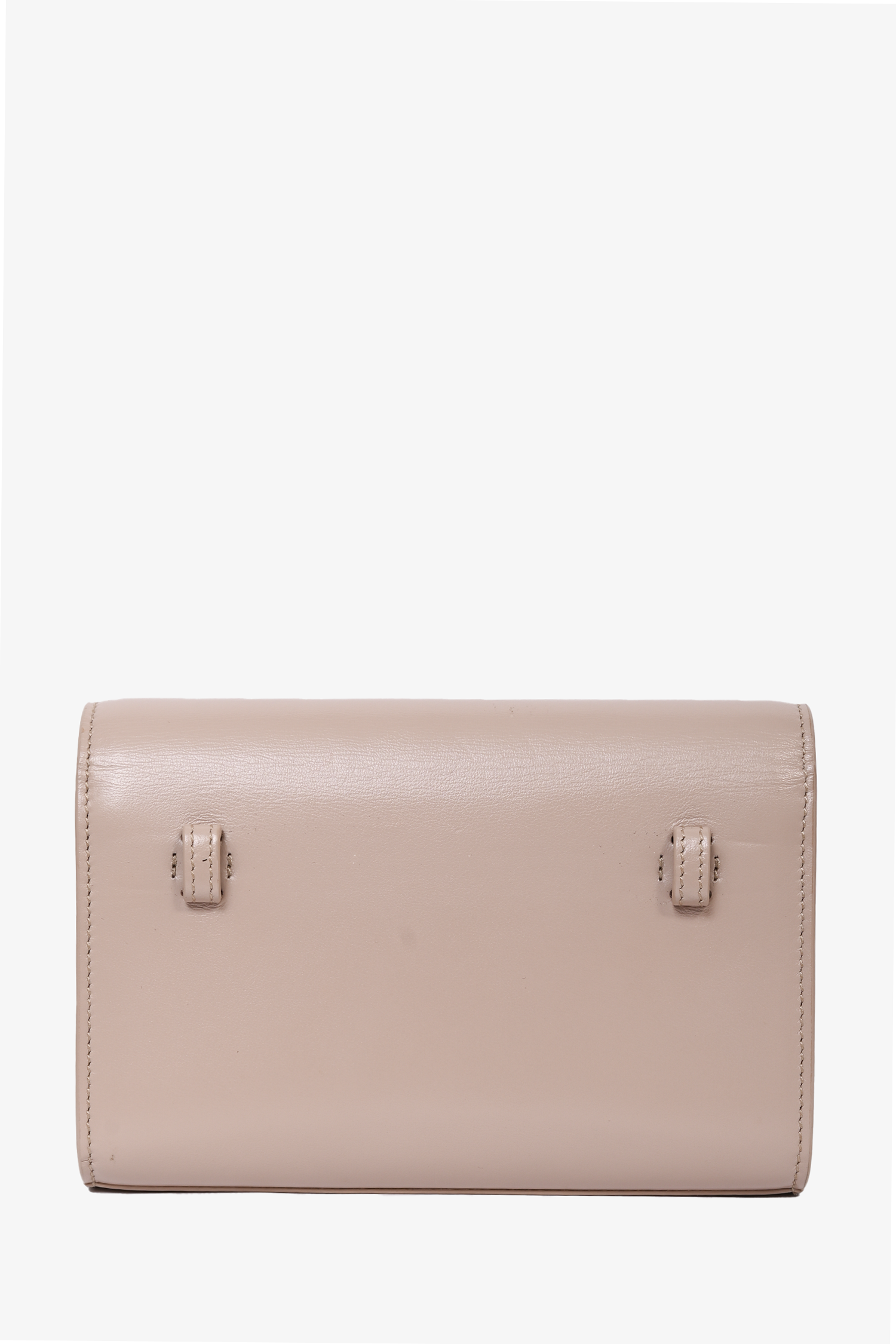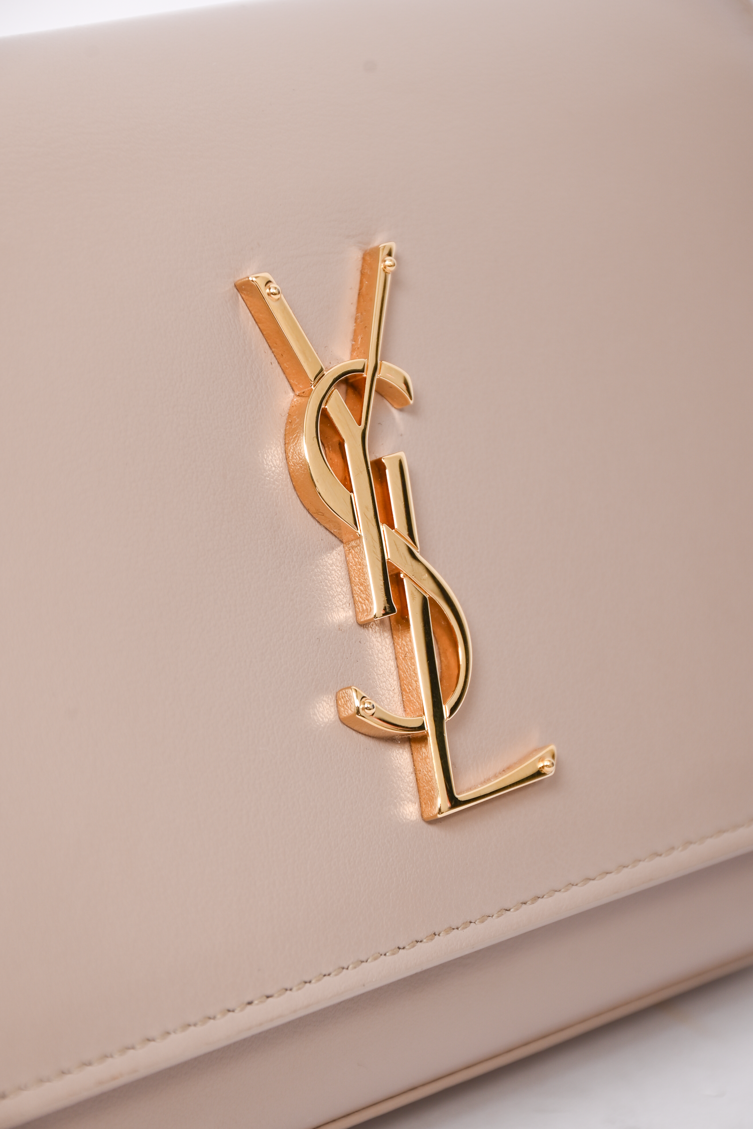 Refresh availabilitySaint Laurent Beige Leather Kate Belt Bag. Fold-over flap with magnetic button closure. 4 interior card-slip pockets. 1 interior wall pocket with top-zip closure. Gold-tone hardware. Tonal stitching.