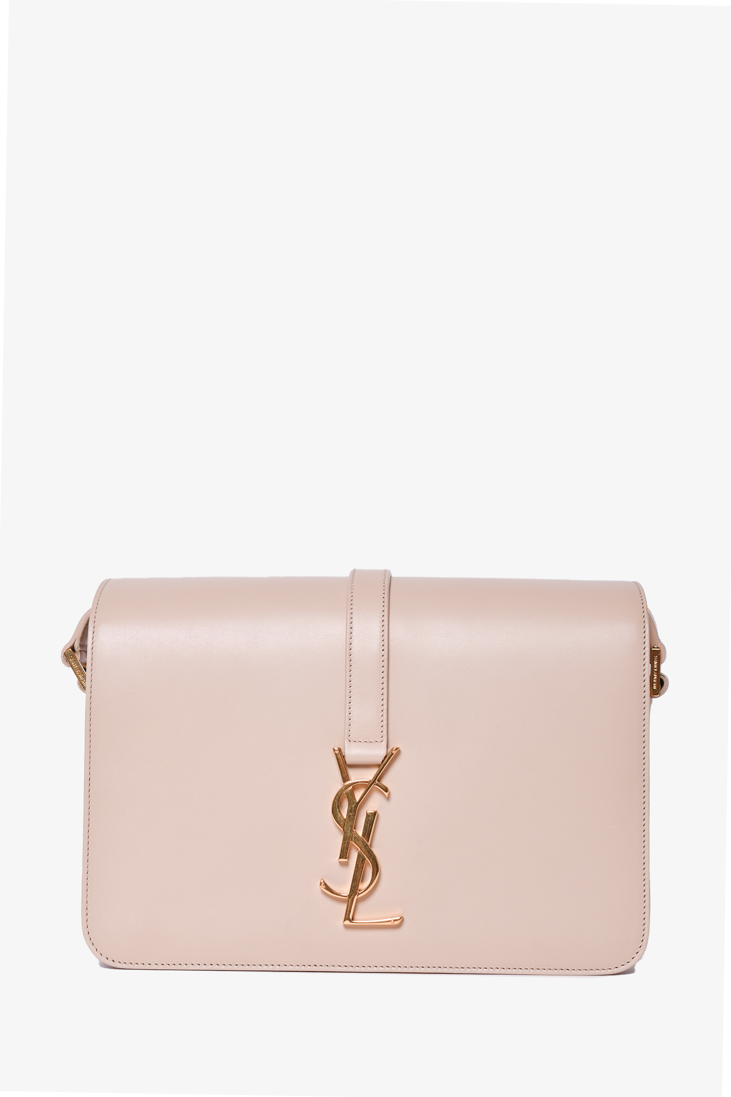Refresh availabilitySaint Laurent Beige Leather Medium 'Universite' Crossbody Bag. Front fold-over flap with magnetic button closure. 2 interior compartments; separated by a divider. Single interior wall zip pocket.