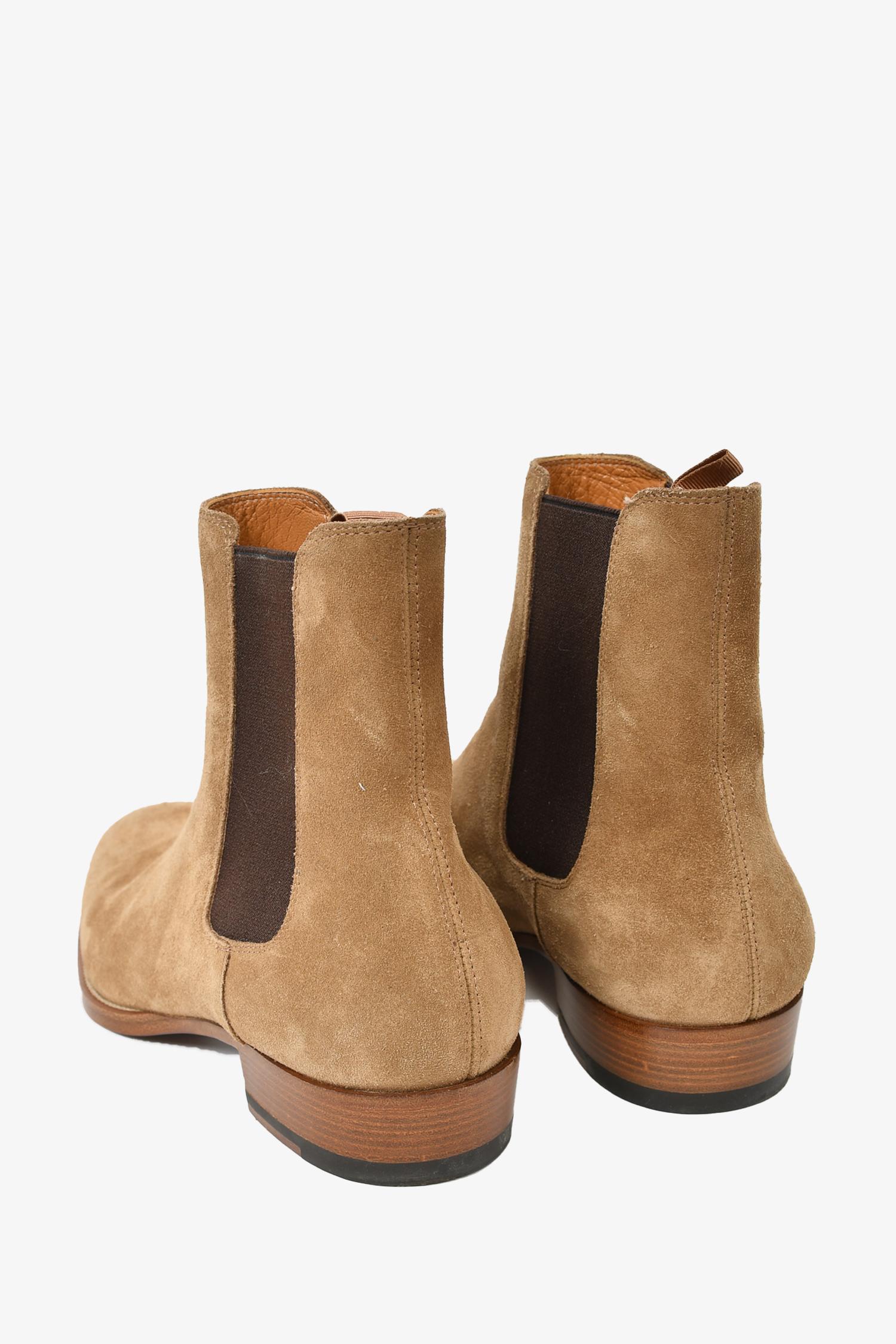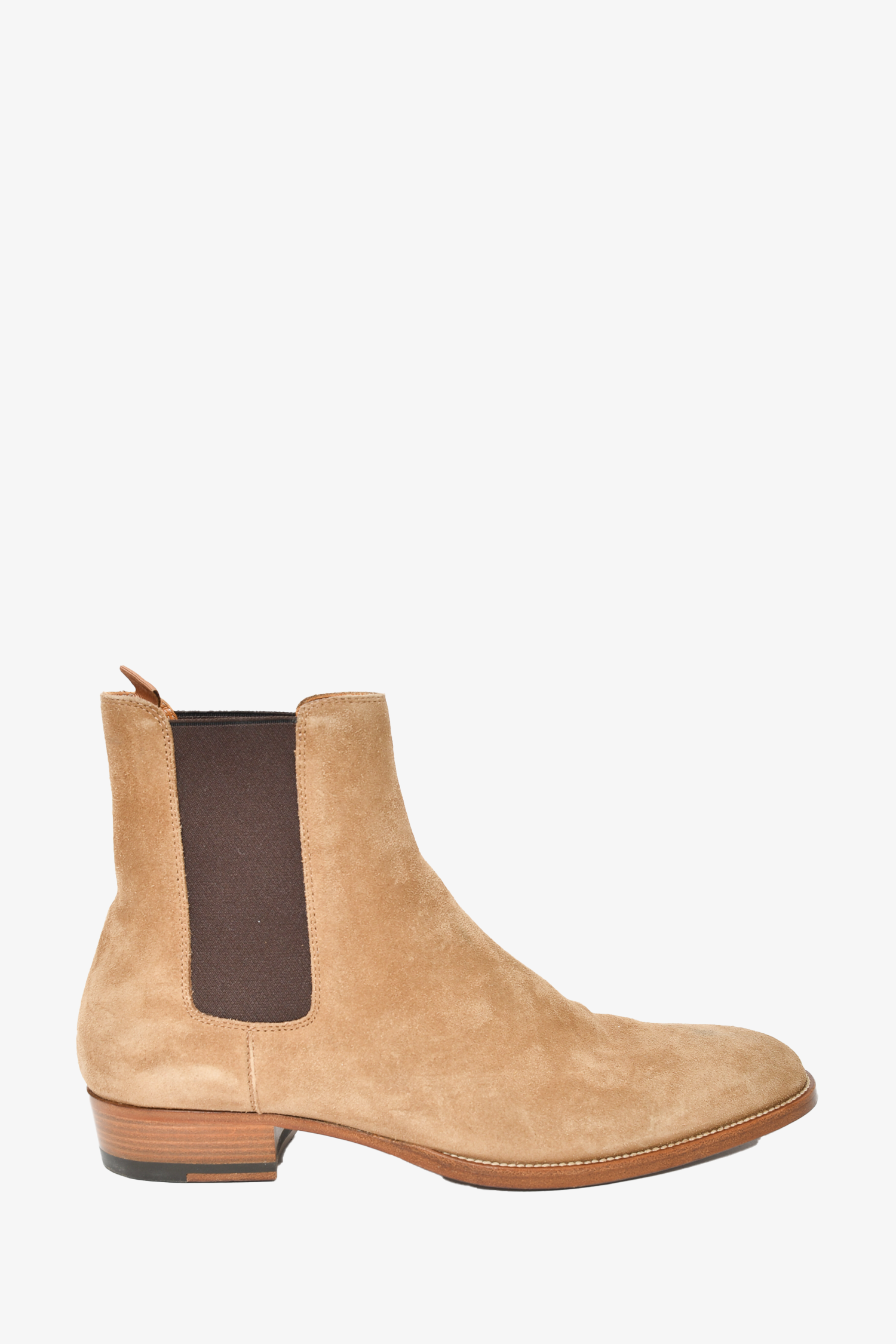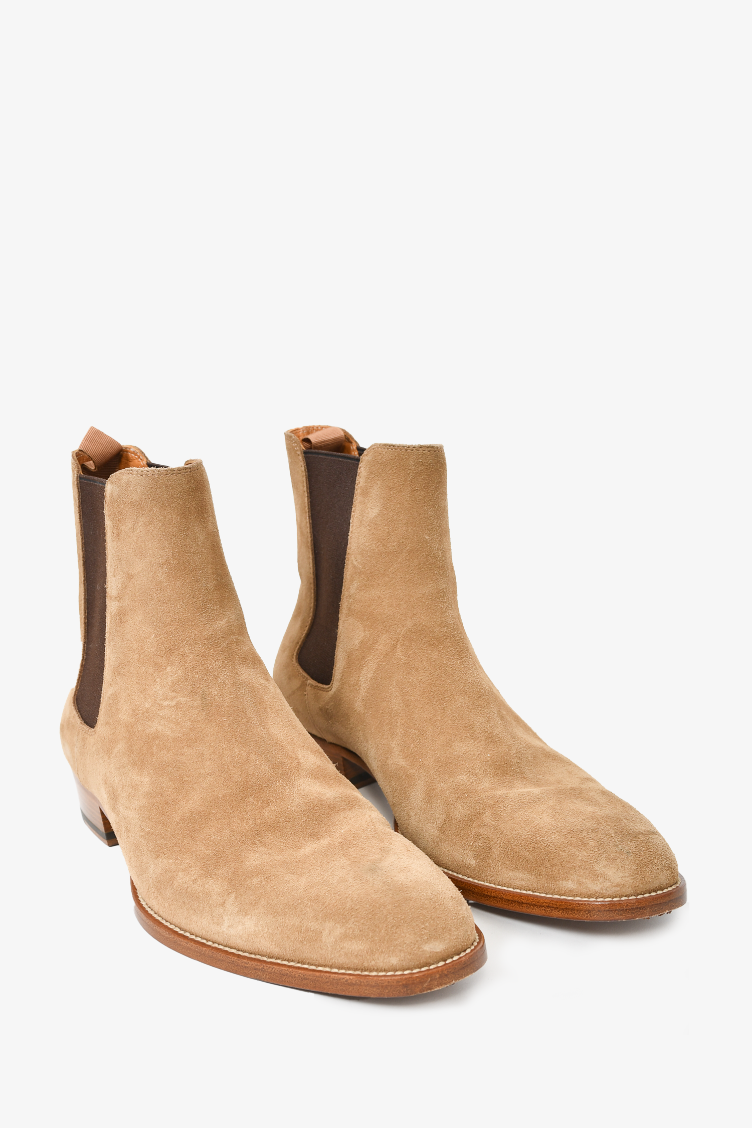 Refresh availabilitySaint Laurent Beige Suede Chelsea Boots. Round toe. Pull-on. Elasticized sides. Tonal stitching.