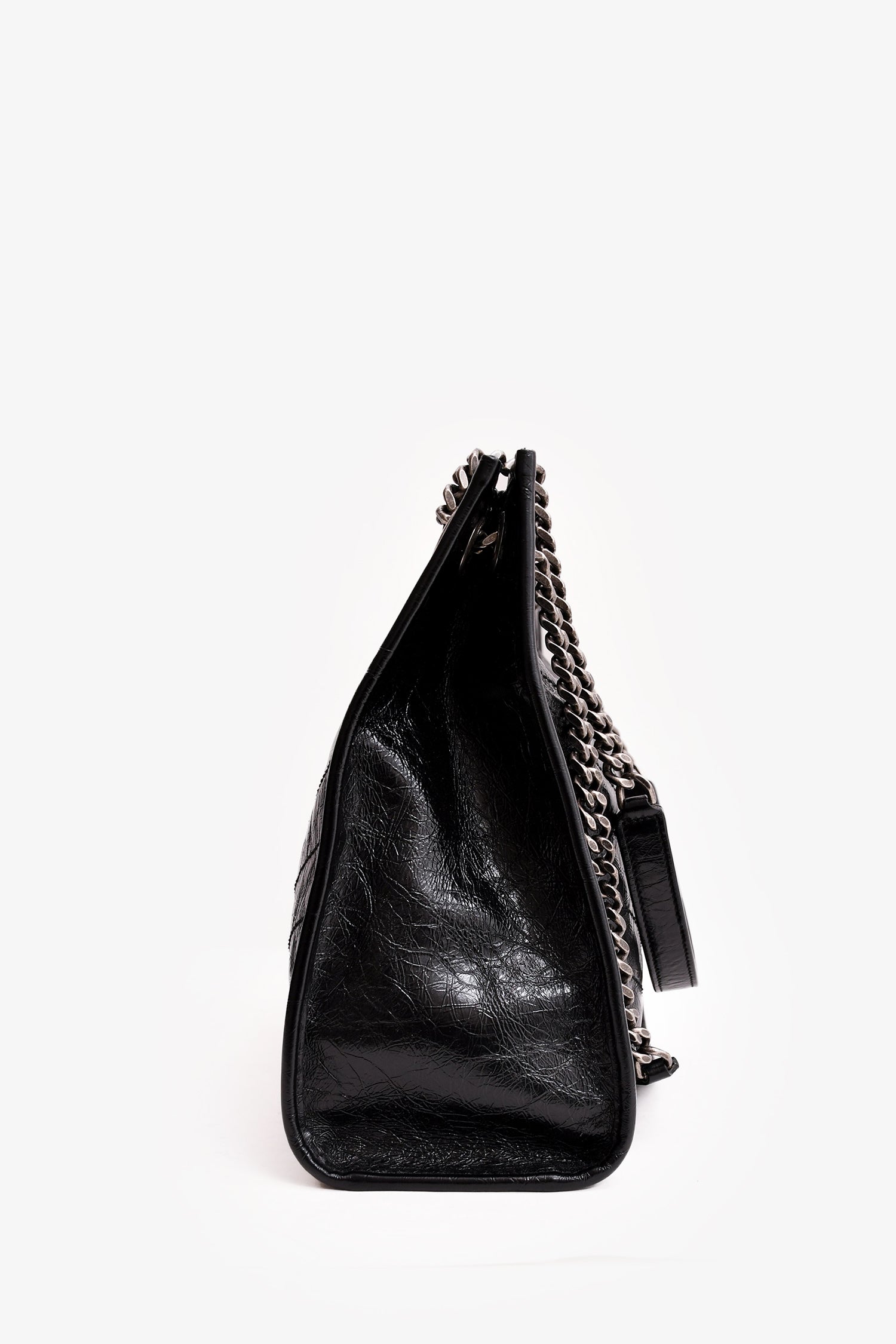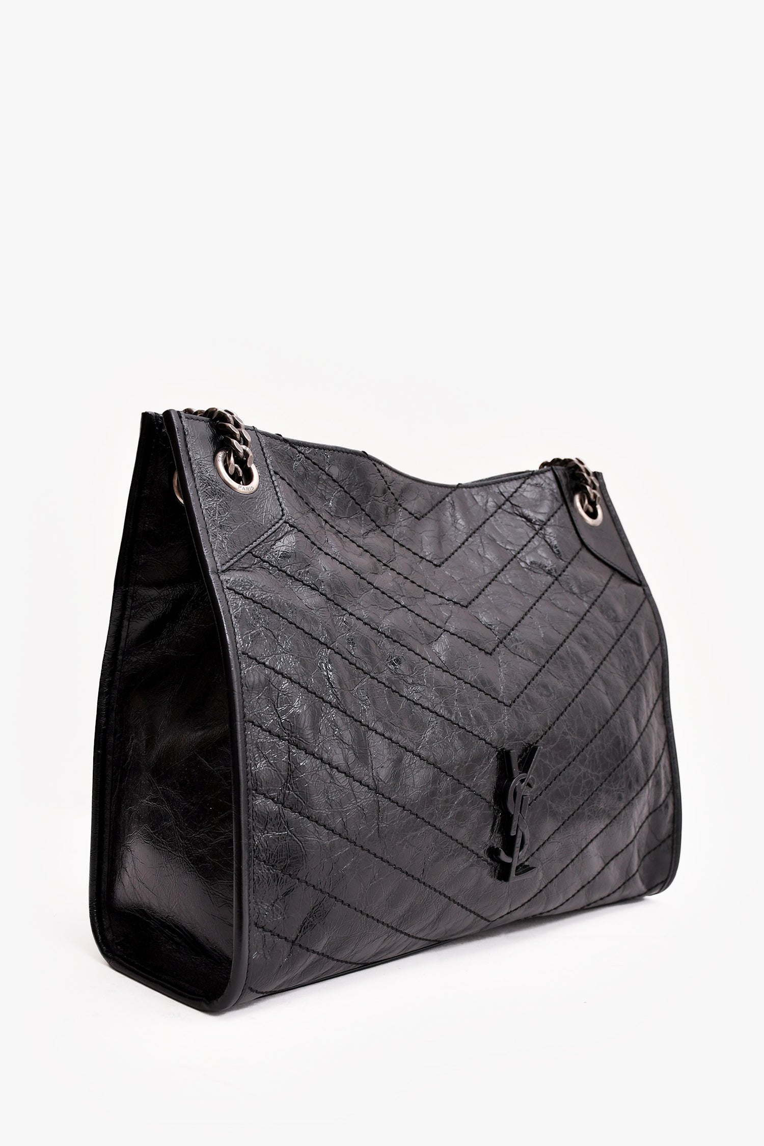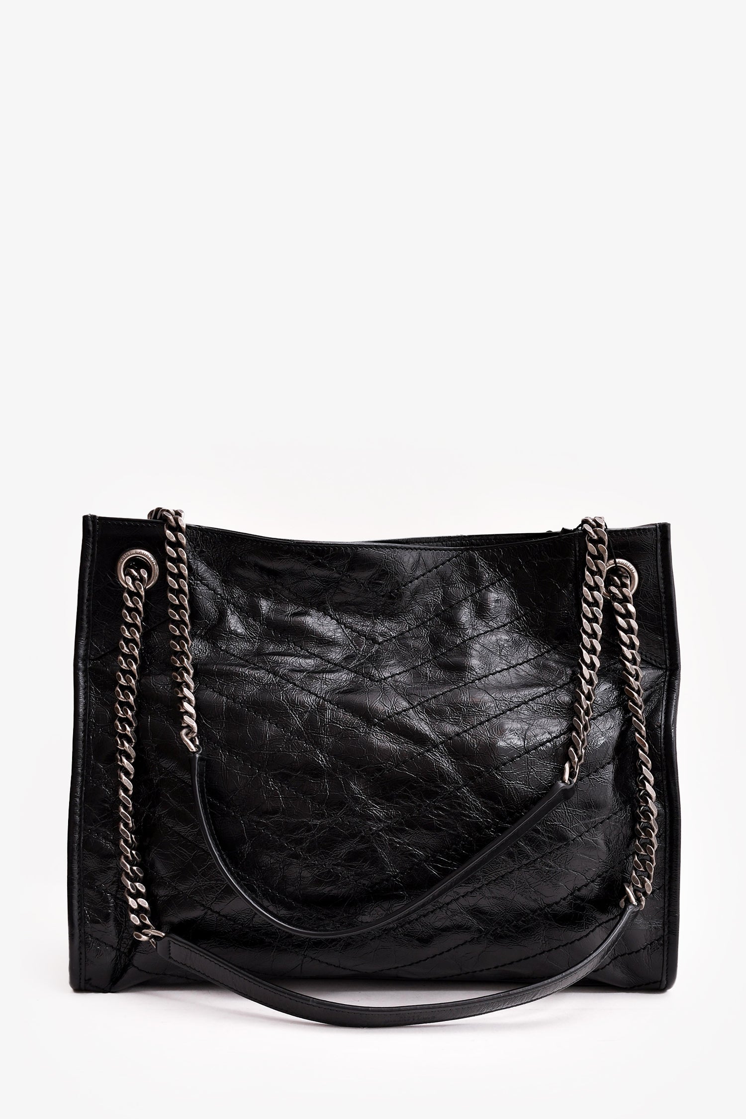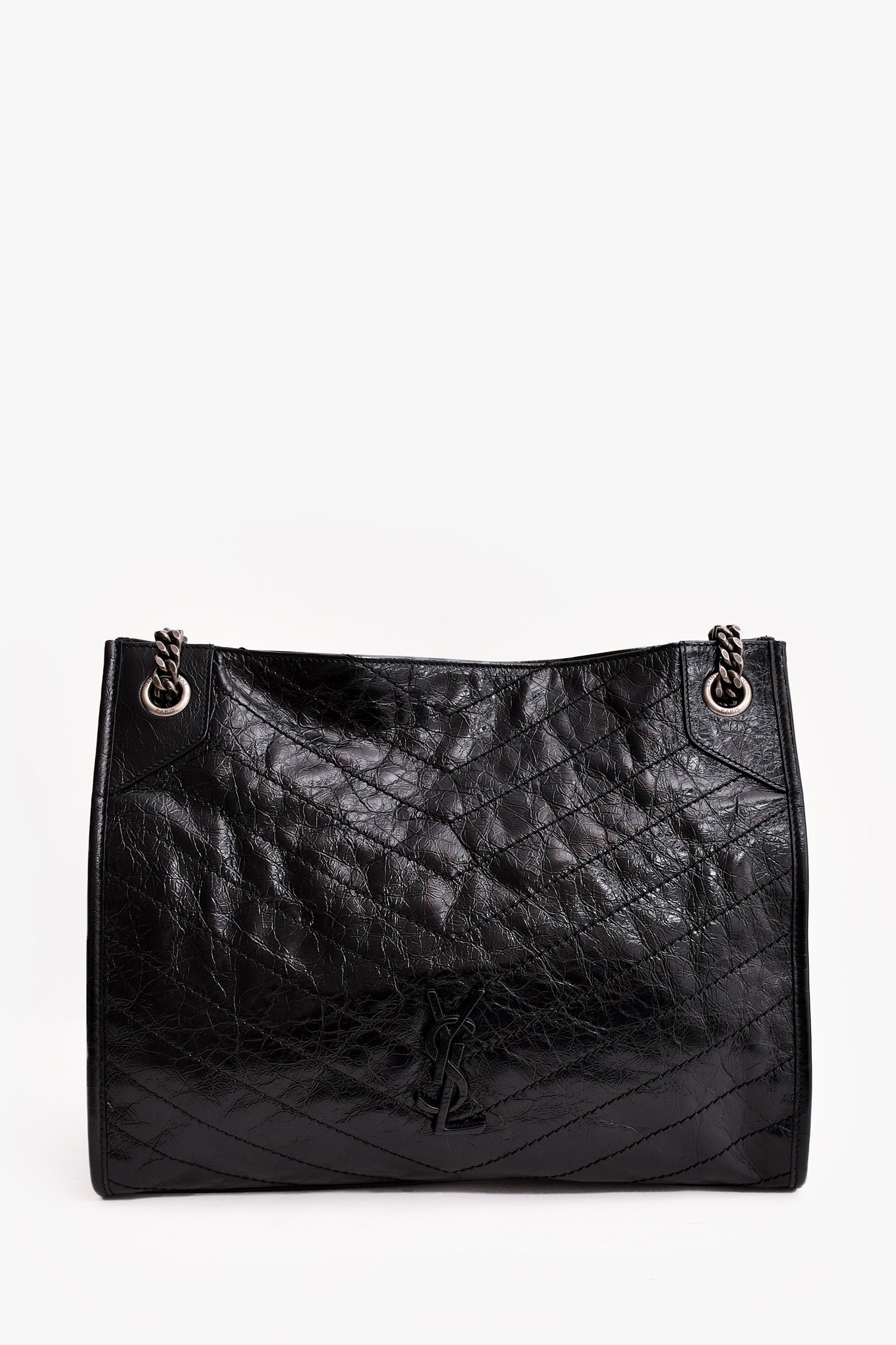 Refresh availabilitySaint Laurent Black Crinkled Leather Large 'Niki' Shoulder Bag. Top interior magnetic button closure. Tonal textile interior lining. 2 interior wall pockets; 1 slip and 1 with zip closure. Slide-around chain. Silver-tone hardware