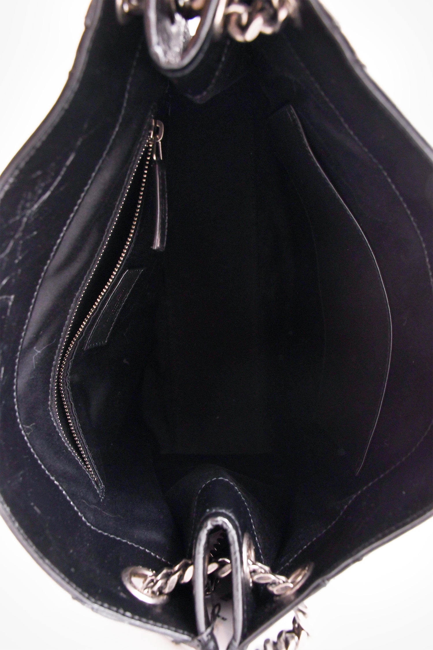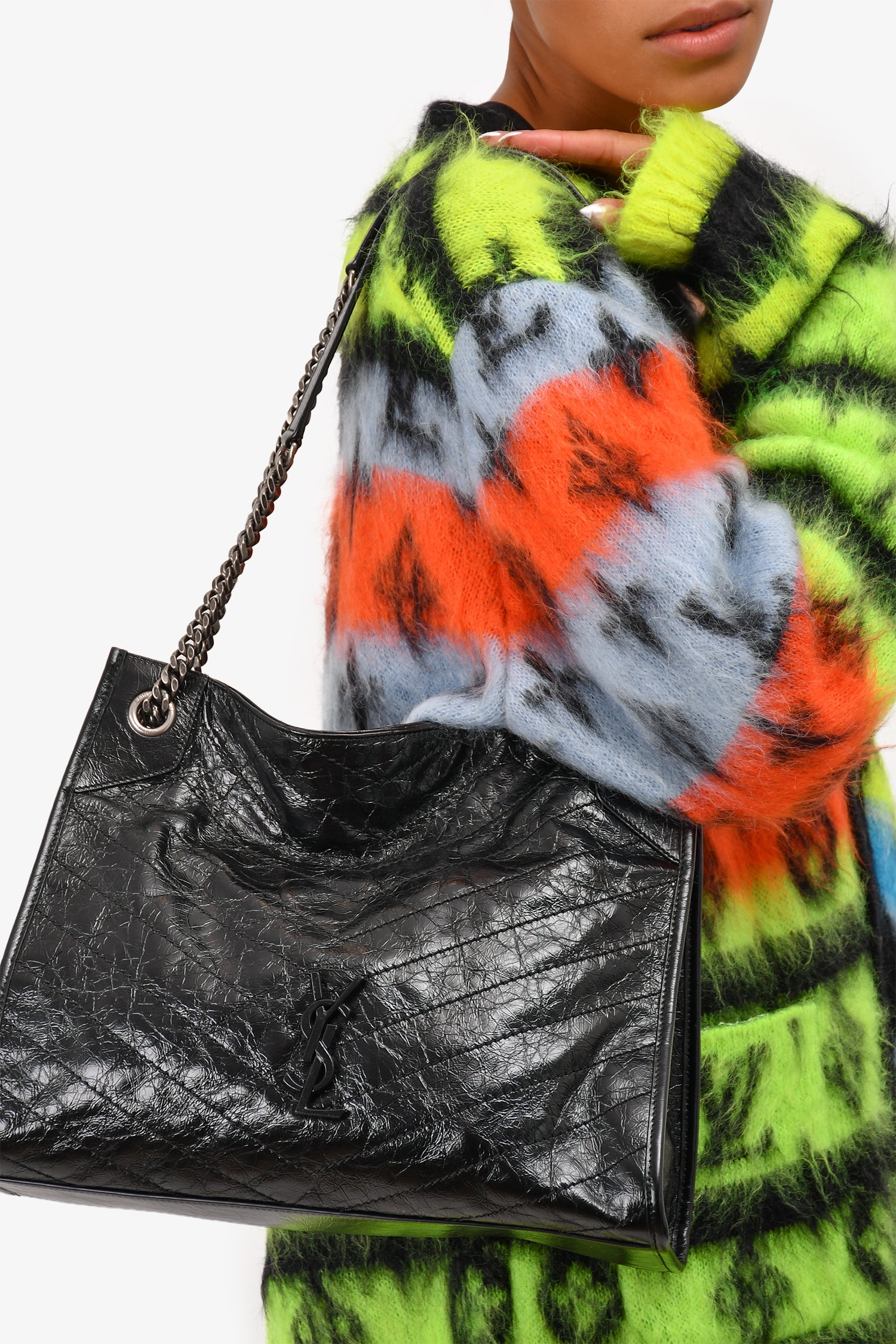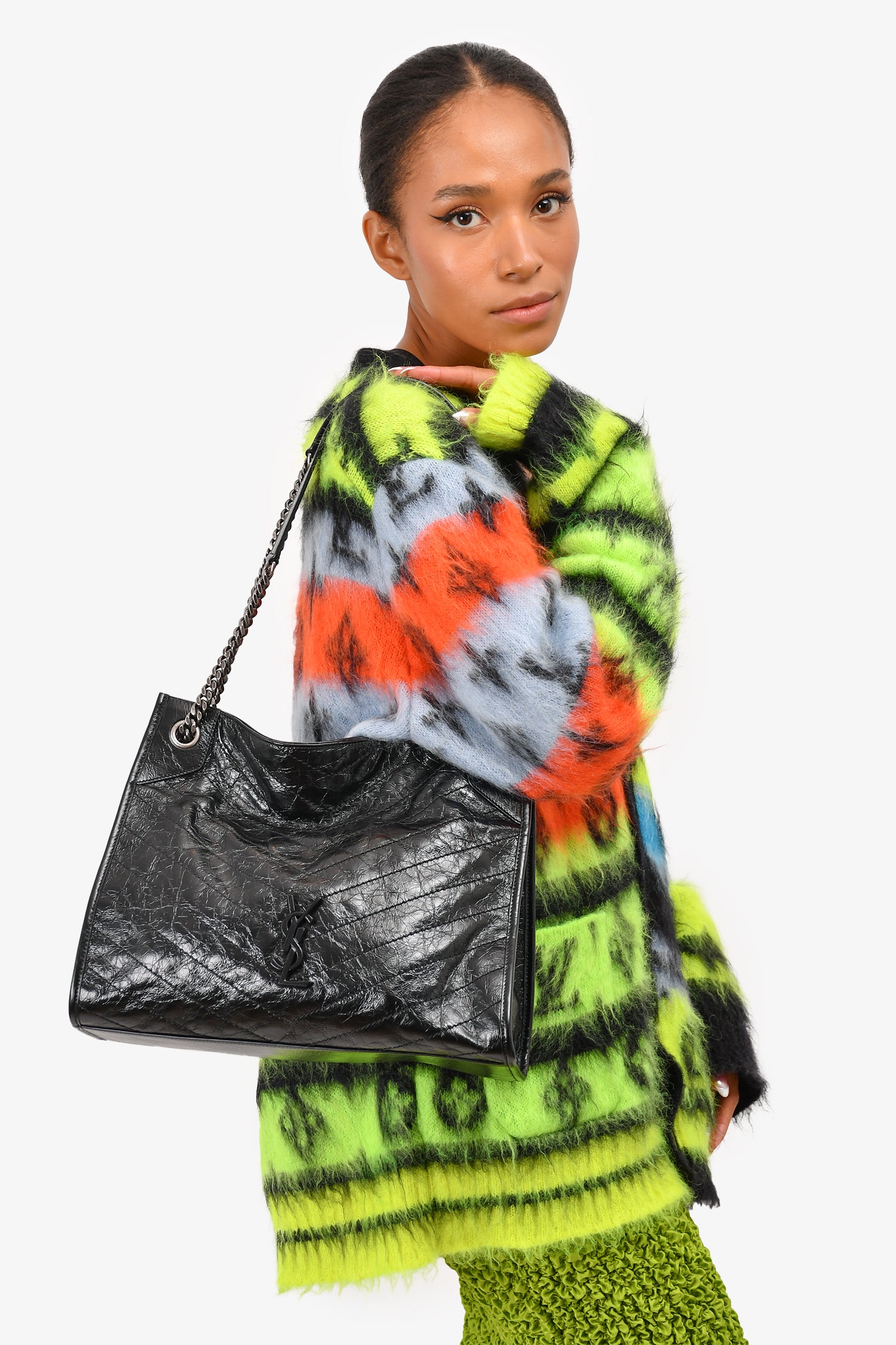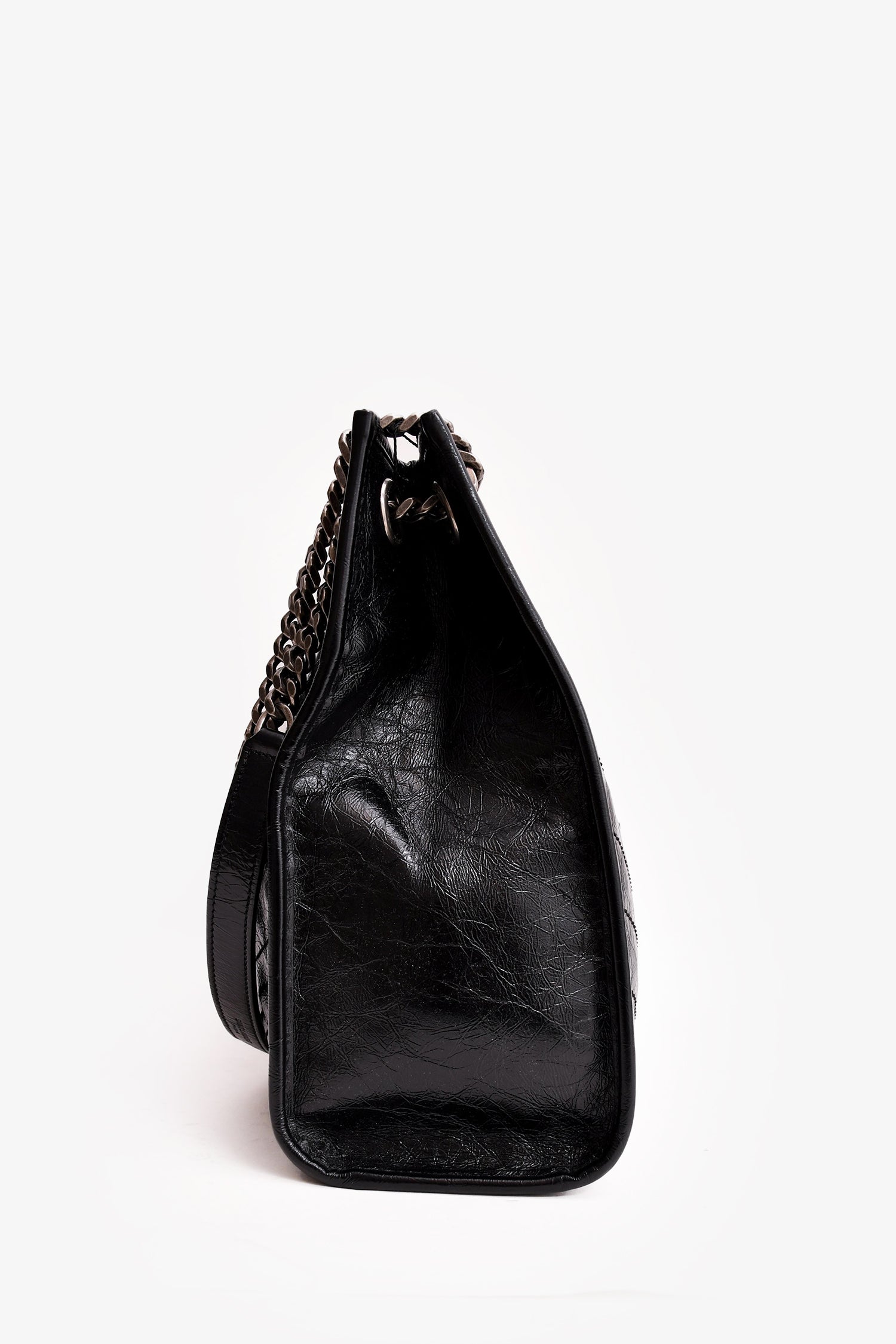 Refresh availabilitySaint Laurent Black Crinkled Leather Large 'Niki' Shoulder Bag. Top interior magnetic button closure. Tonal textile interior lining. 2 interior wall pockets; 1 slip and 1 with zip closure. Slide-around chain. Silver-tone hardware