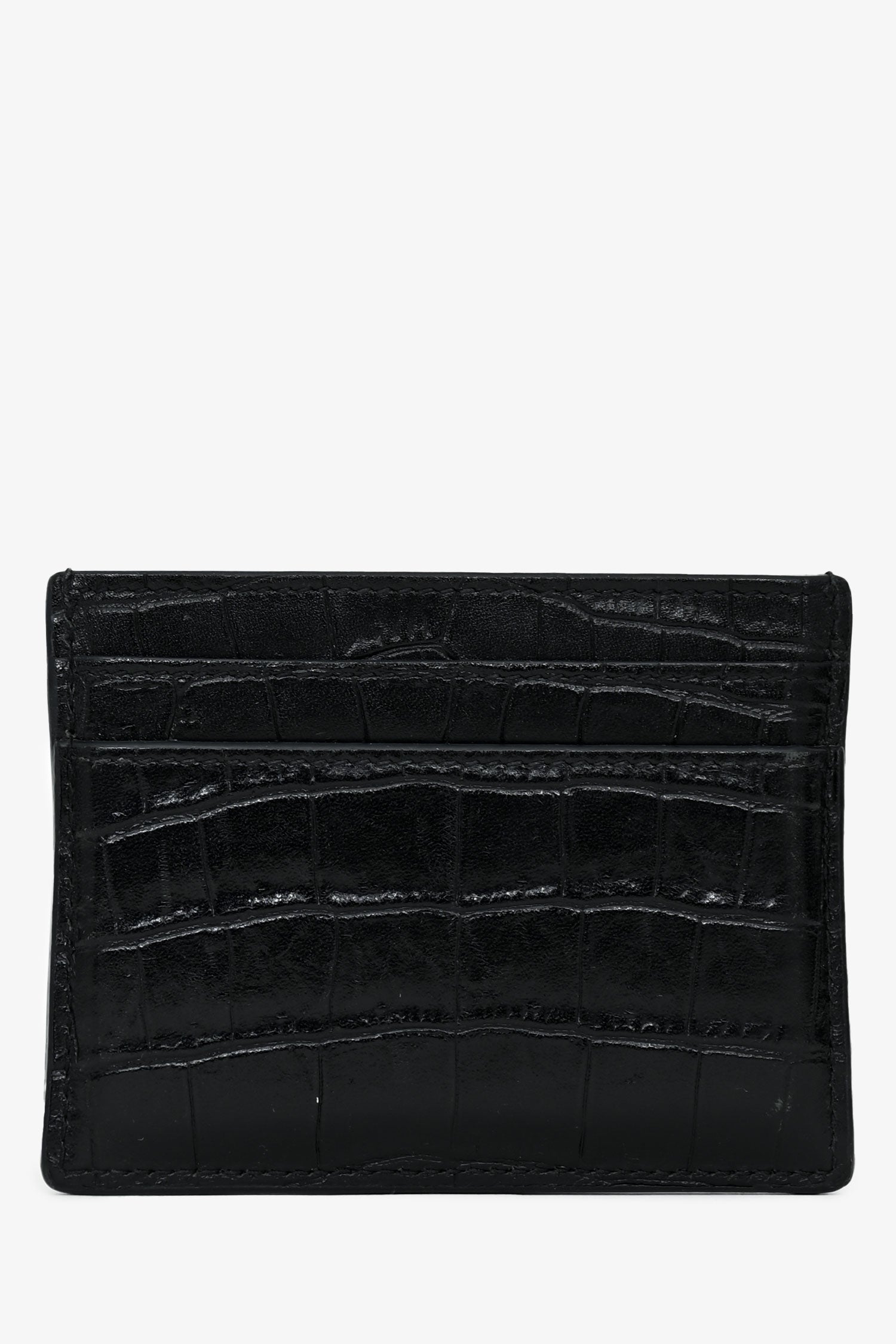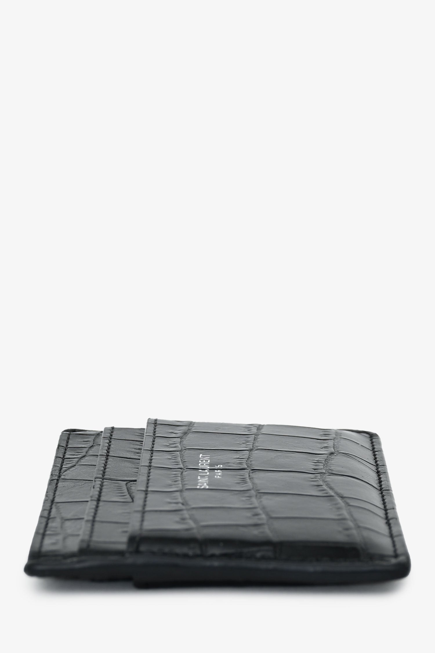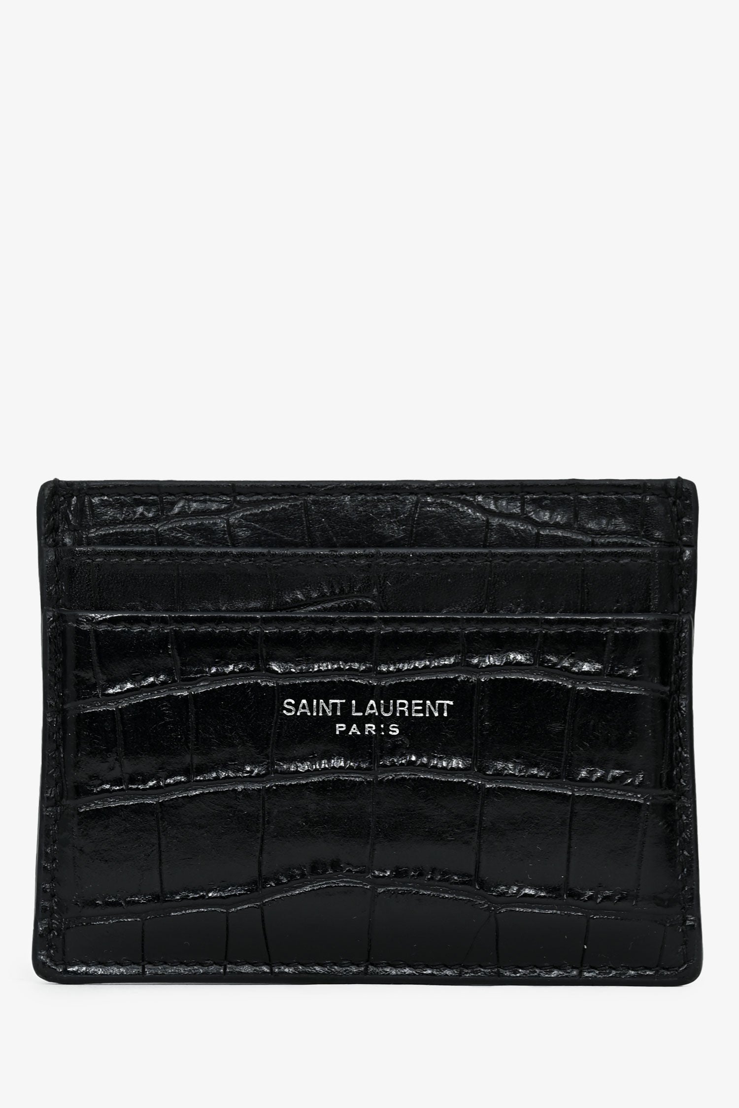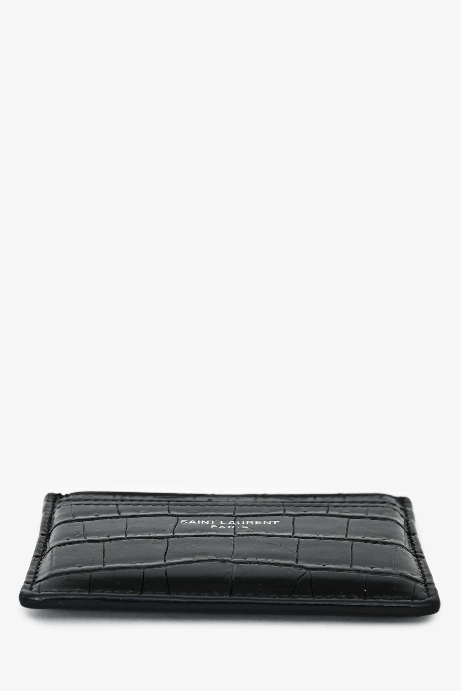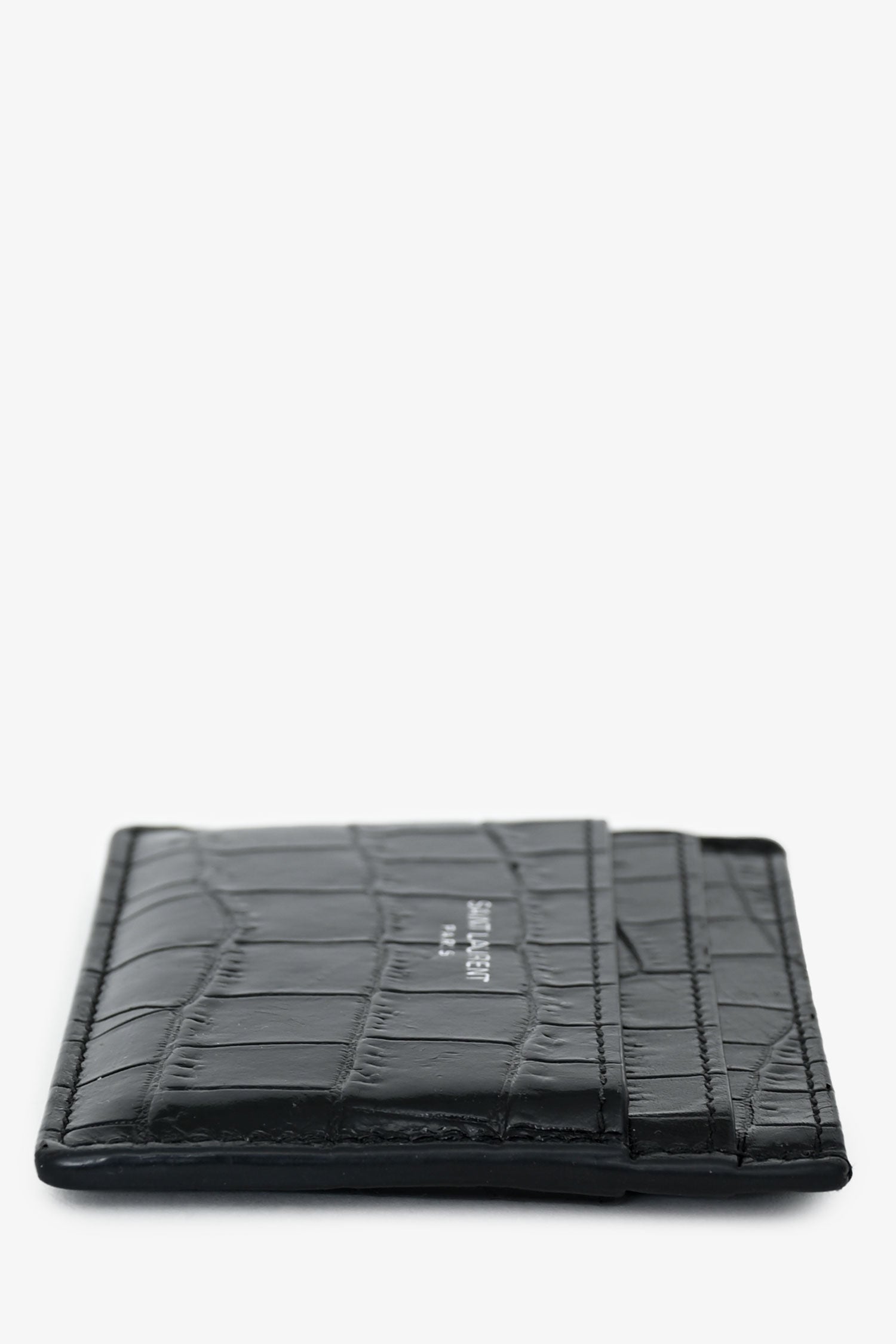 Refresh availabilitySaint Laurent Black Croc-Embossed Card Holder. 5 exterior card slots. Silver-tone hardware. Tonal stitching.