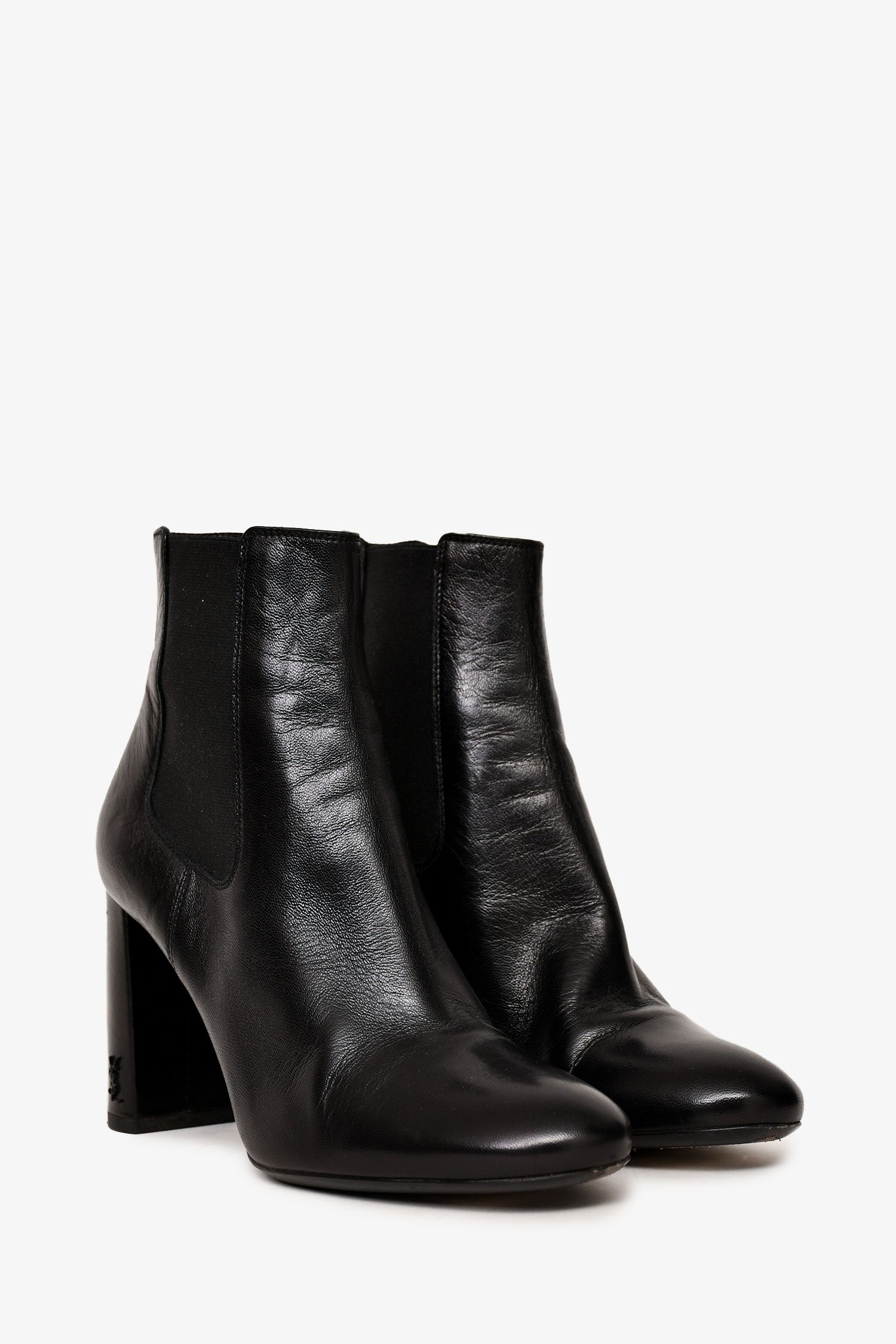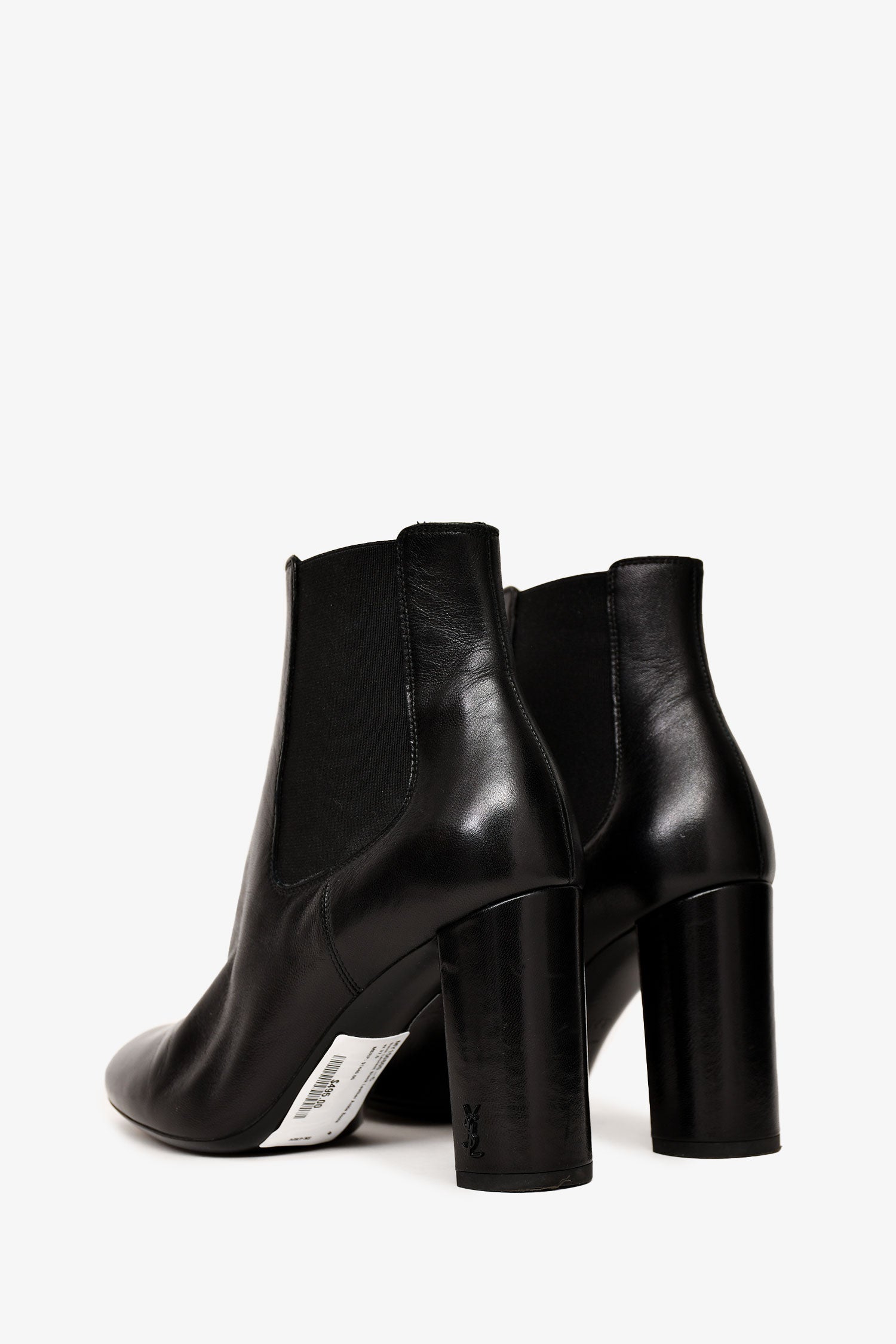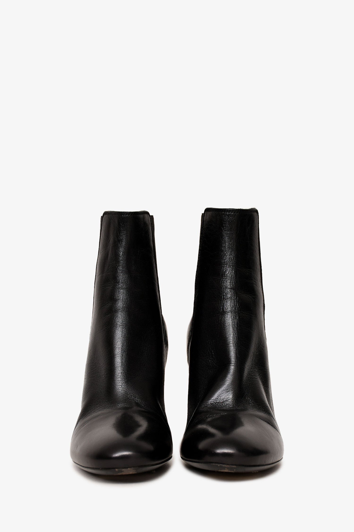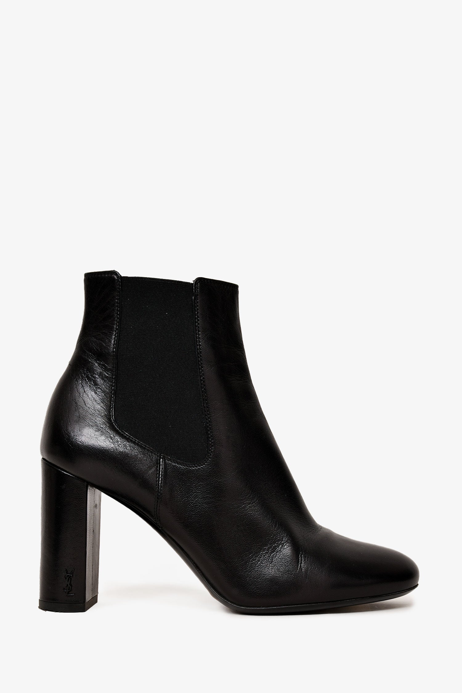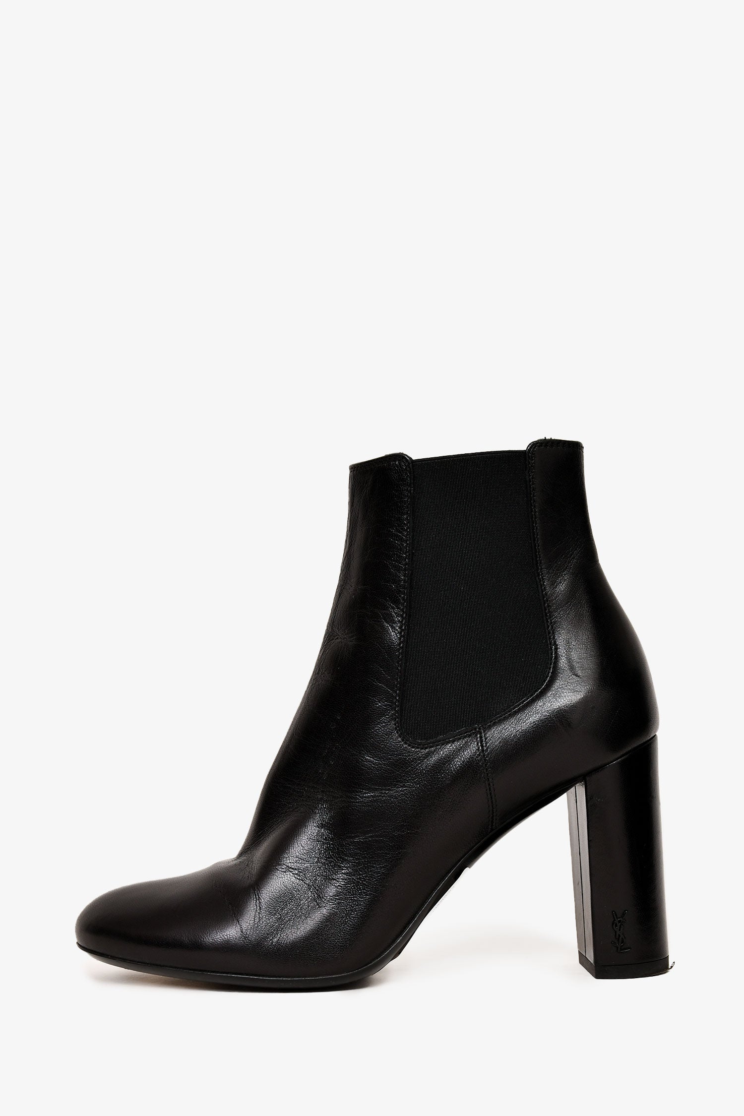 Refresh availabilitySaint Laurent Black Leather Ankle Boots. Round toe silhouette. Elastic side panels for easy slip-on entry. Stacked block heel. Tonal stitching.