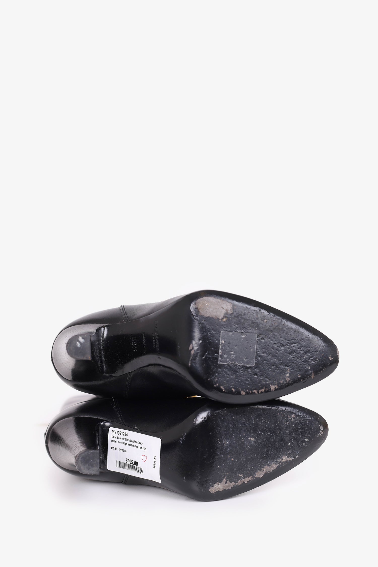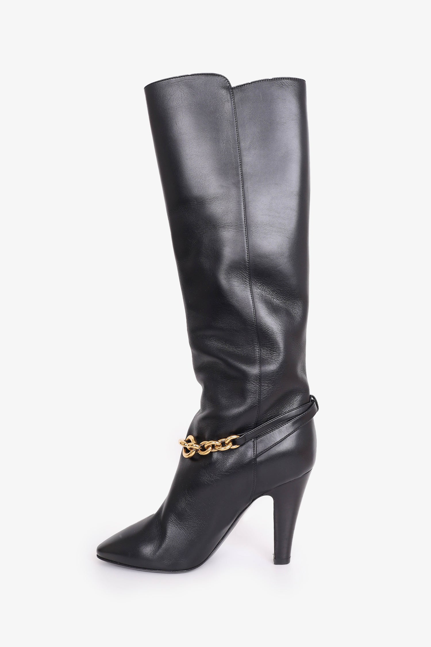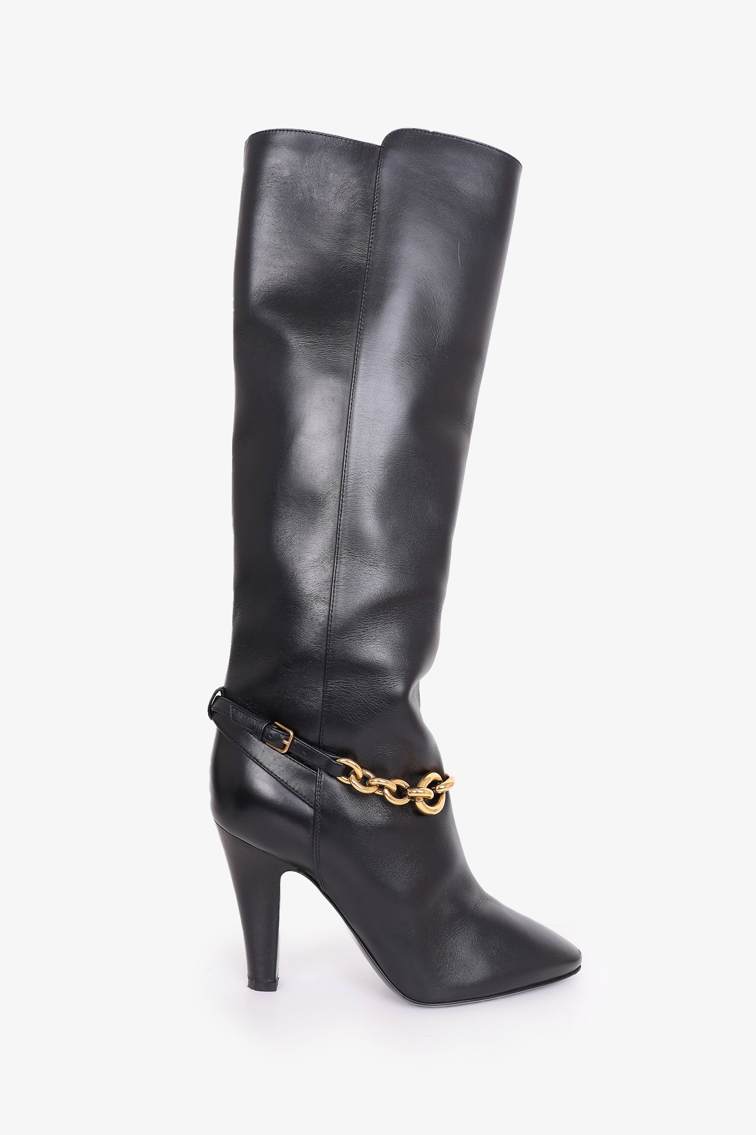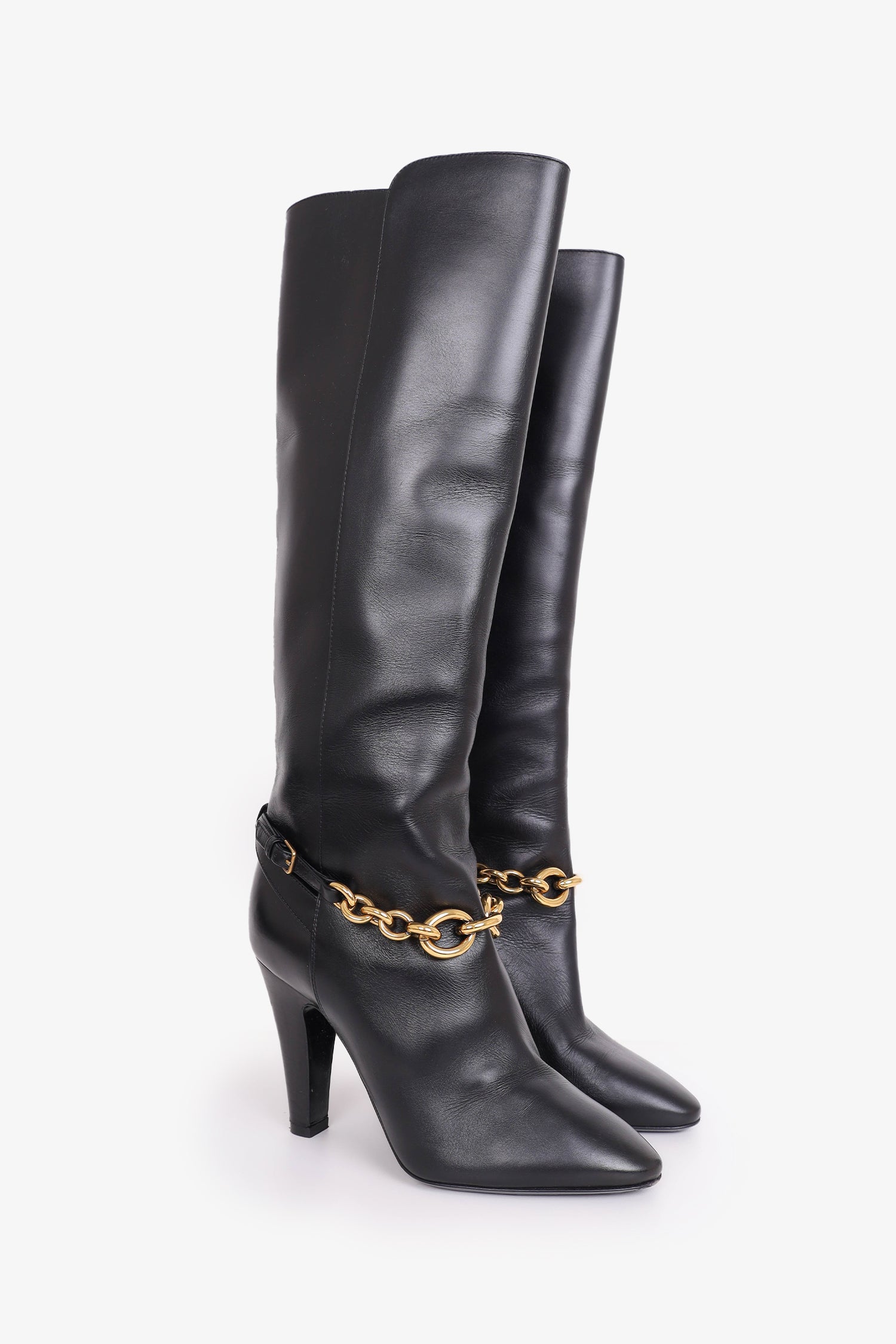 Refresh availabilitySaint Laurent Black Leather Chain Detail Knee High Heeled Boots. Pull-on. Pointed toe. Gold-tone chain detail around ankle. Tonal stitching.