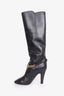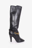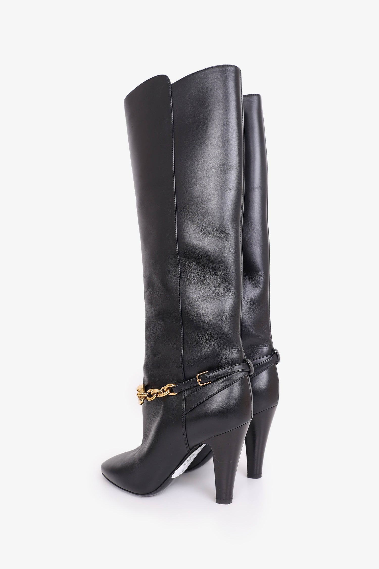 Saint Laurent Black Leather Chain Detail Knee High Heeled Boots Size 35.5