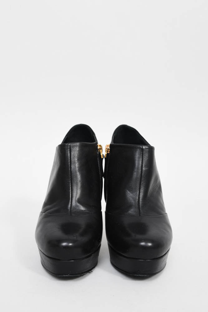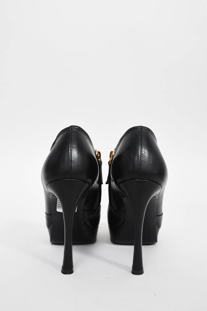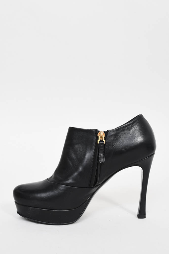 Refresh availabilitySaint Laurent Black Leather Heeled Ankle Bootie. Round toe. Platform sole. Side zipper closure. under the ankle height. Tonal stitching.