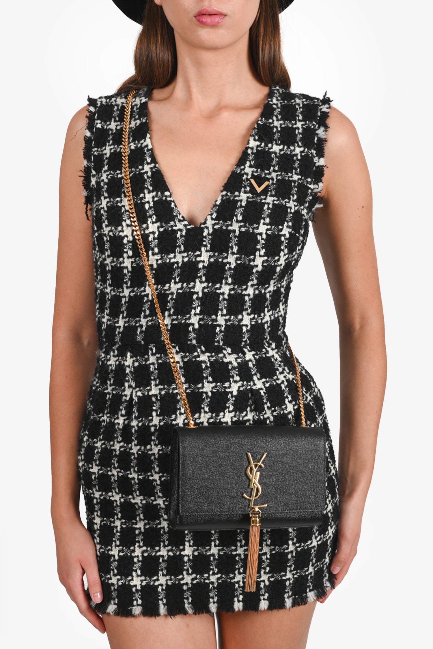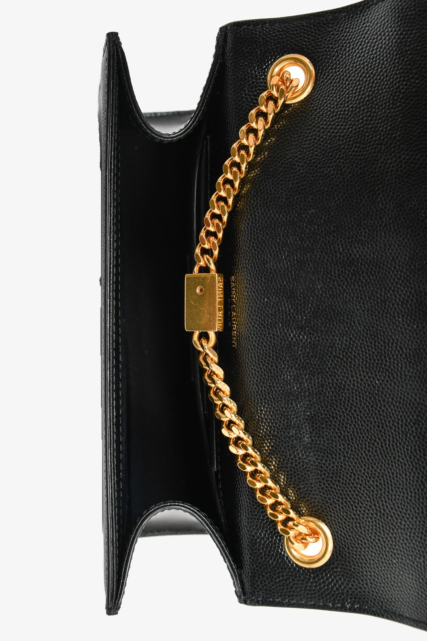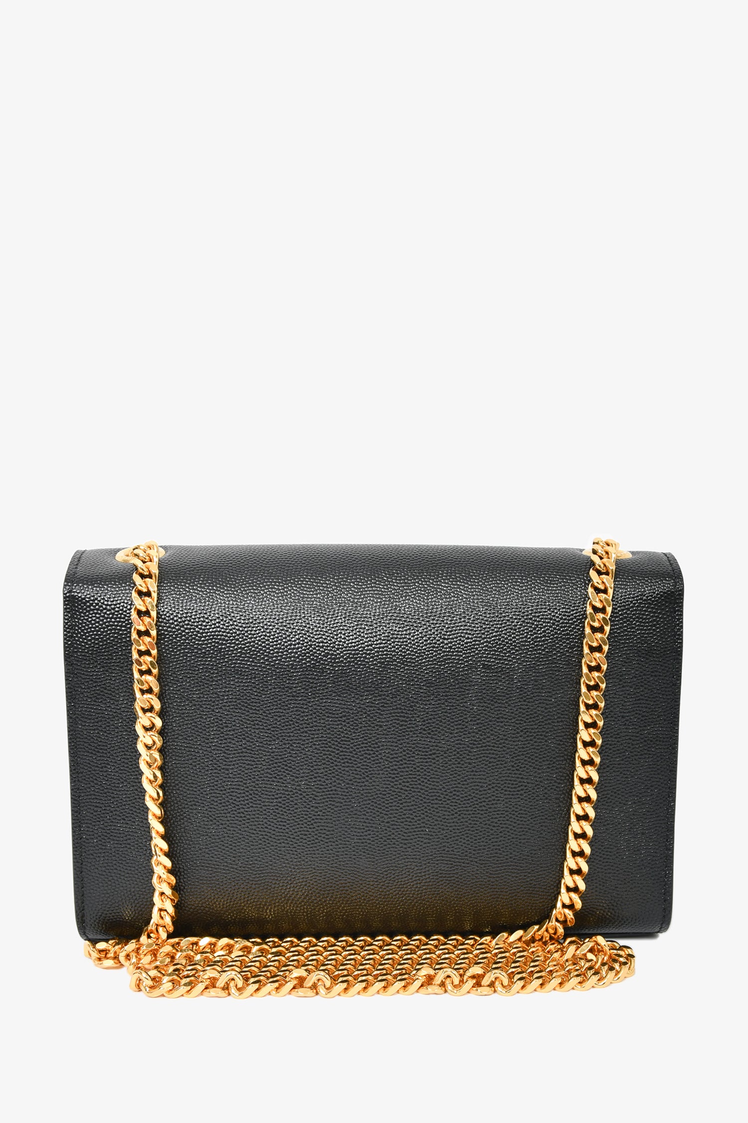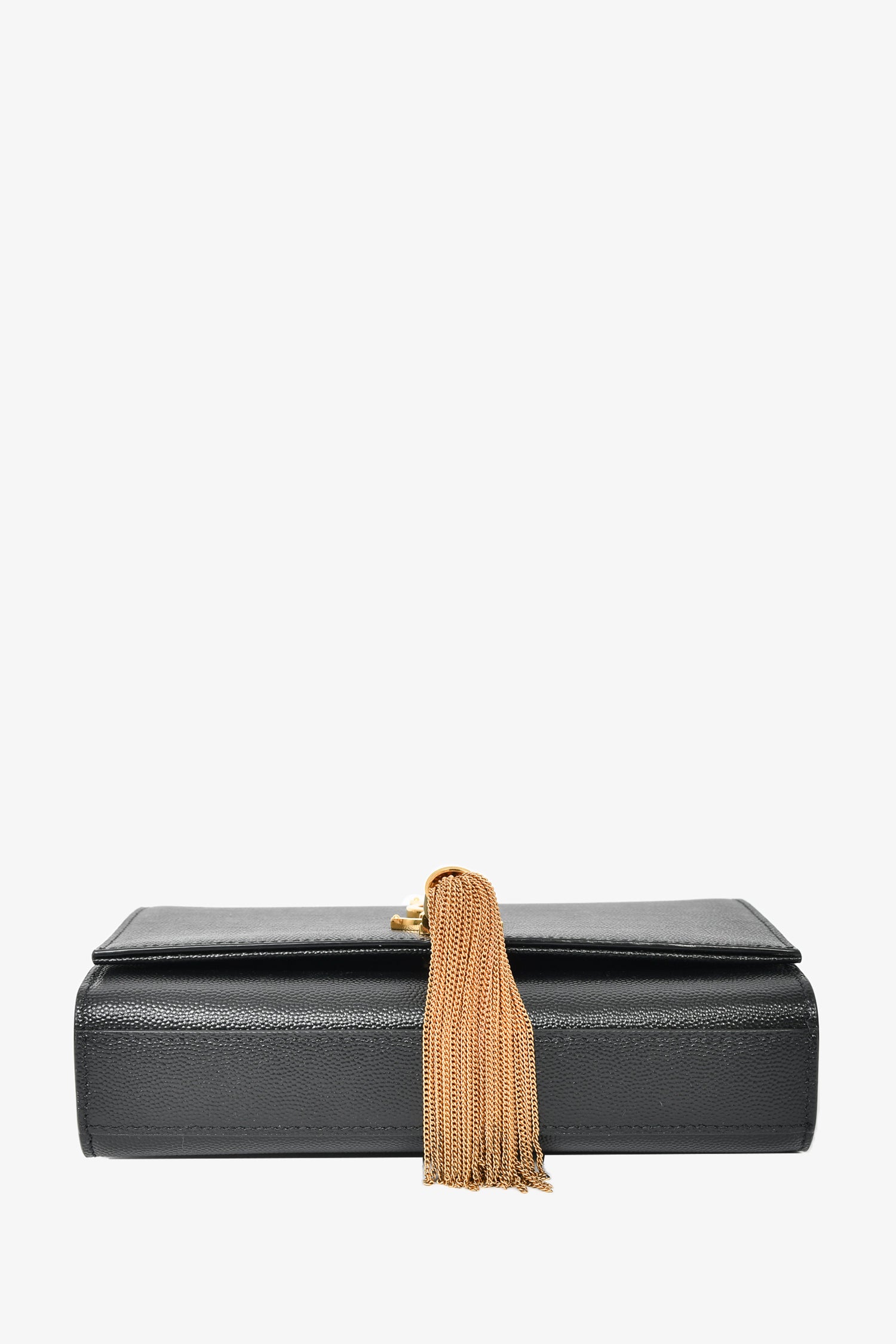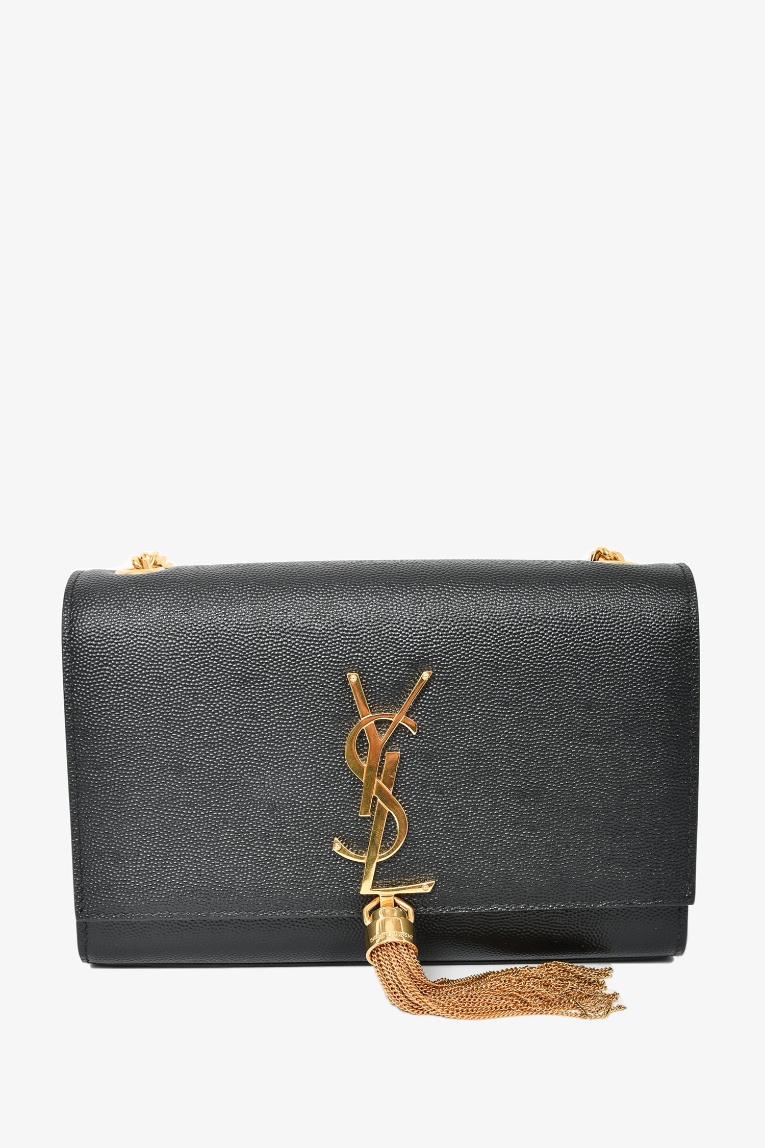 Refresh availabilitySaint Laurent Black Leather Kate Tassle Small Crossbody. Gold-tone hardware. 1 interior slip pocket. Fold over flap with magnetic button closure. Tonal stitching.