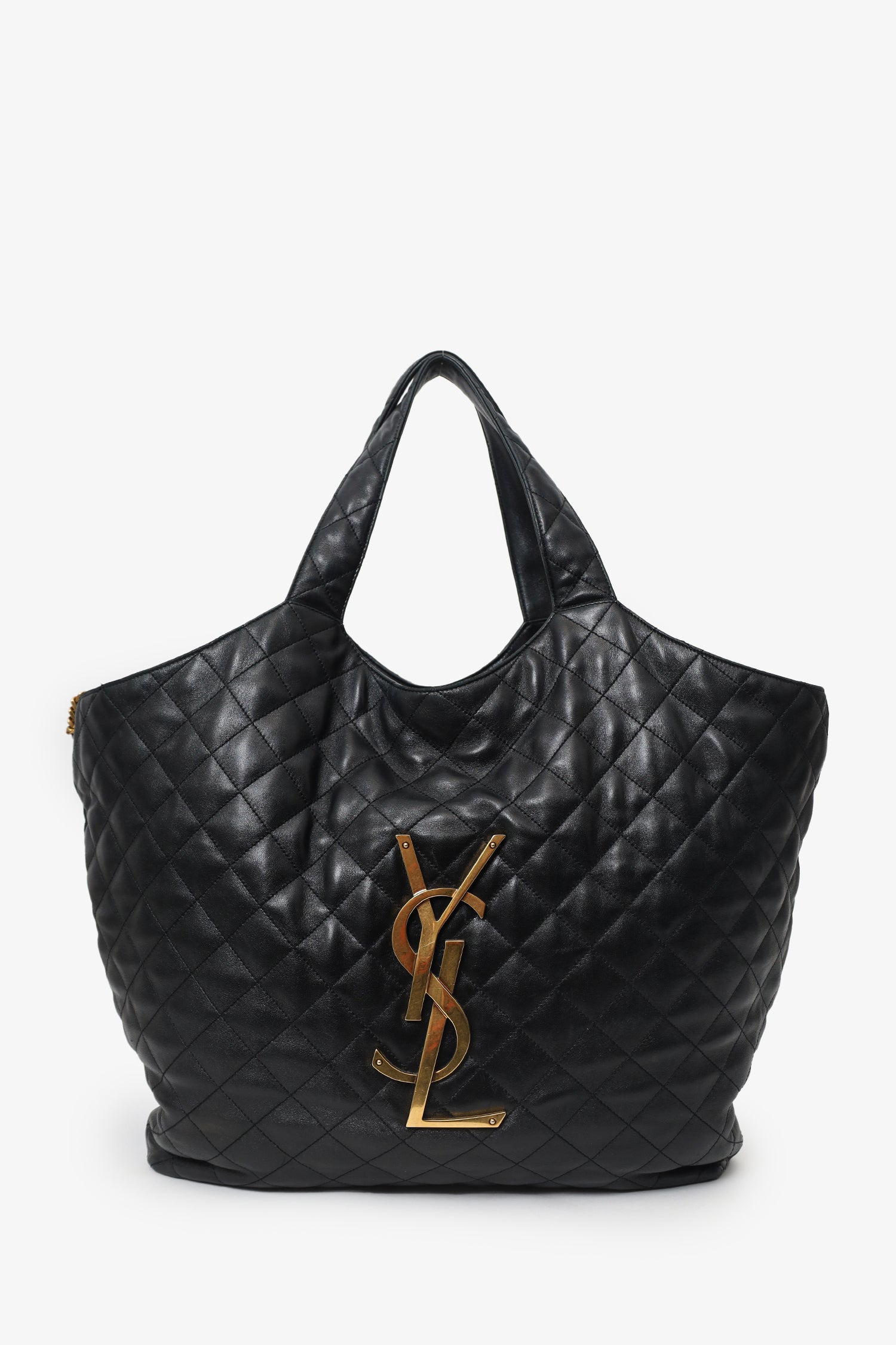Refresh availabilitySaint Laurent Black Leather Quilted 'ICARE' Oversized Bag with Pouch. Open top. Twin top handles. Lined interior with single zip pocket. Removable pouch with zip closure. Single interior slip pocket in pouch. Gold-tone hardware. Tonal stitching.