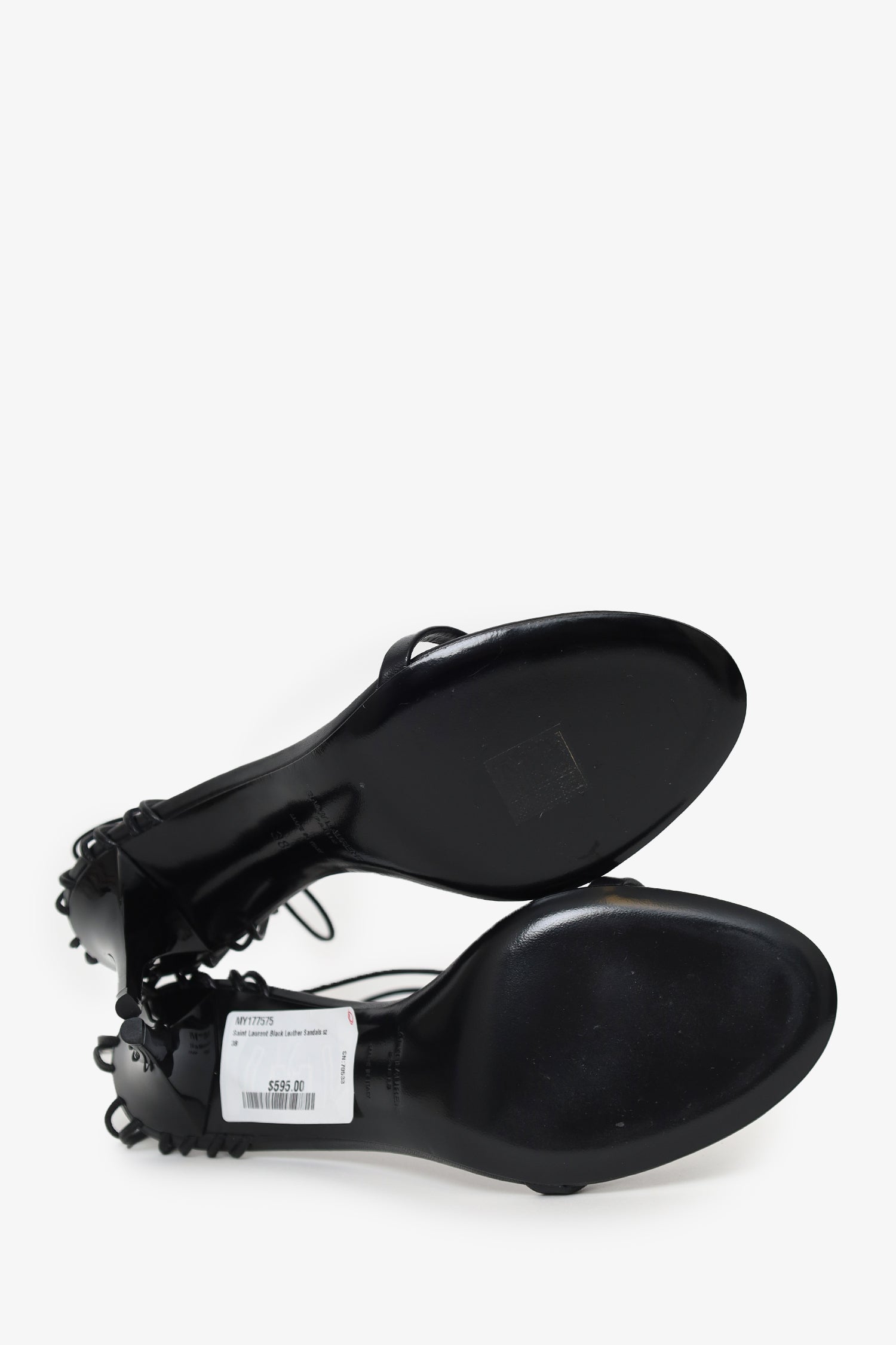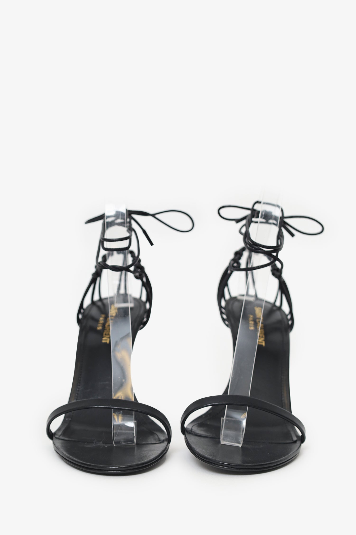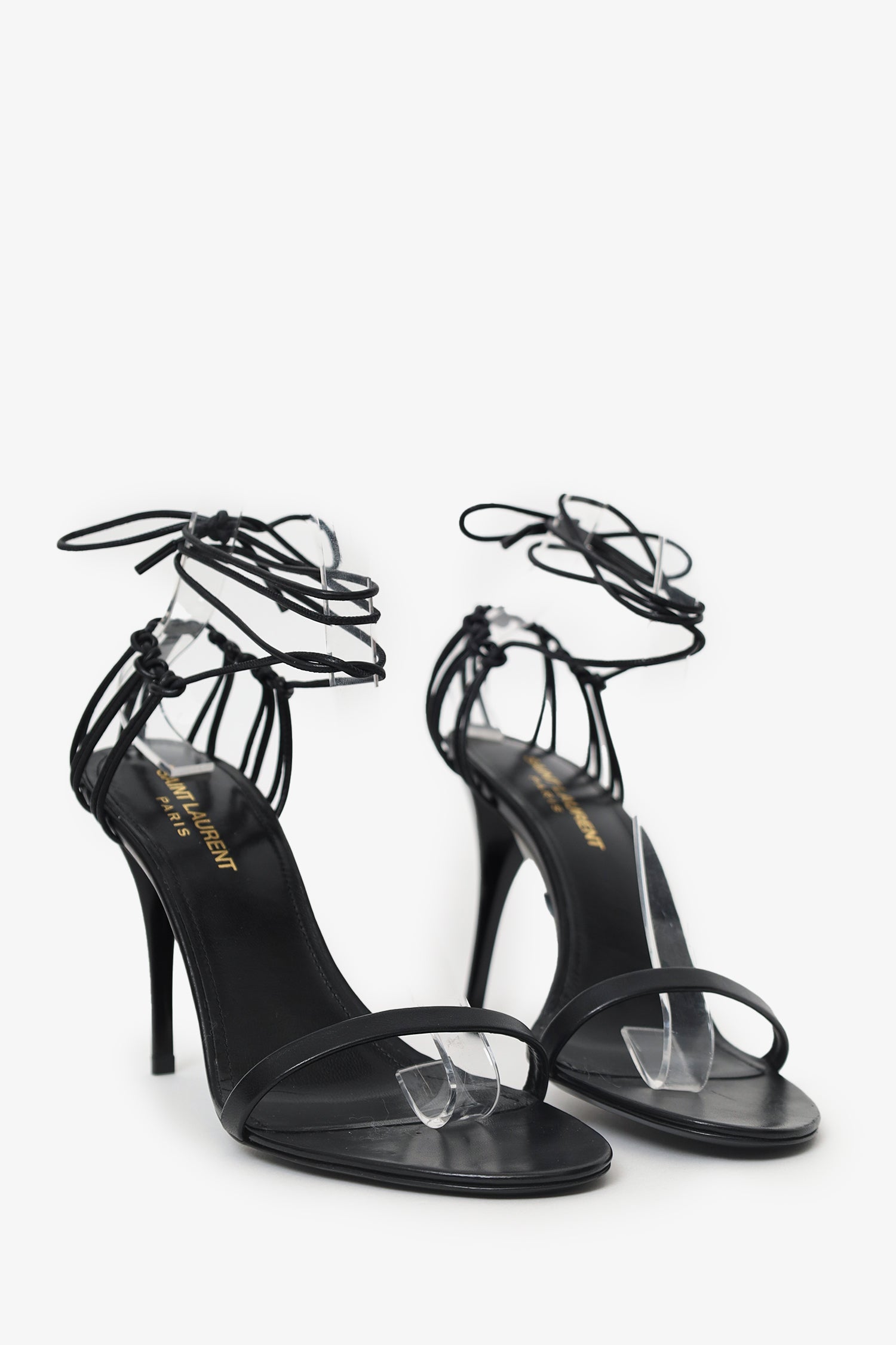 Refresh availabilitySaint Laurent Black Leather Sandals. Slip on. Open-round toe. Ankle tie closure. Tonal stitching.