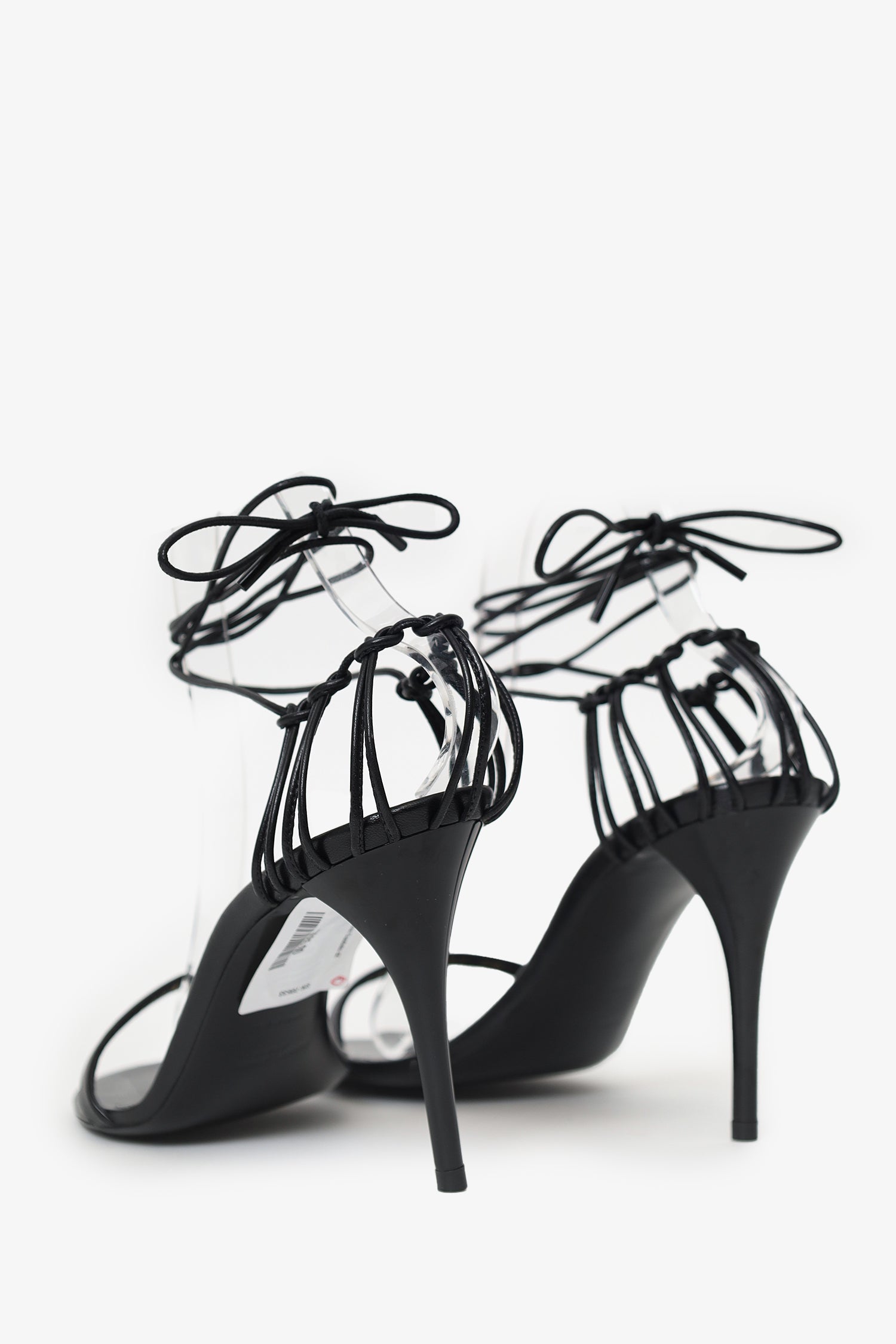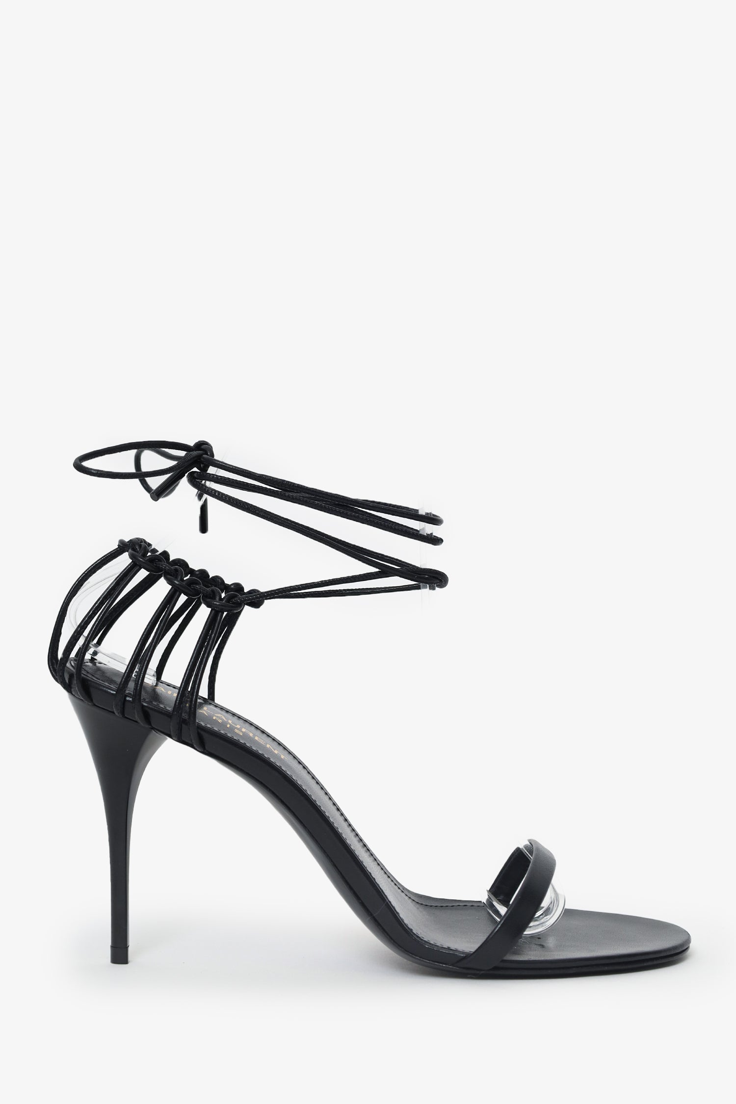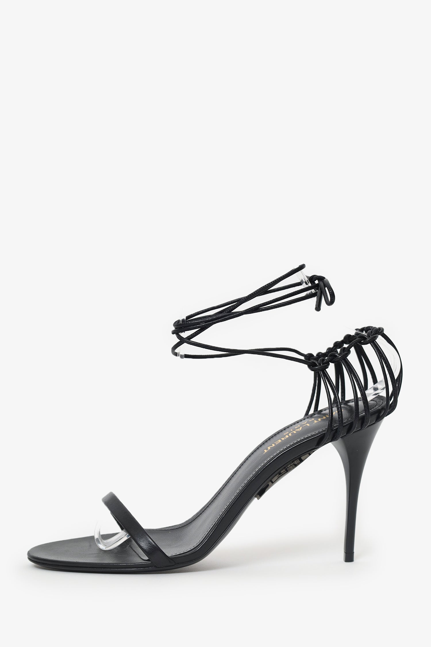 Refresh availabilitySaint Laurent Black Leather Sandals. Slip on. Open-round toe. Ankle tie closure. Tonal stitching.