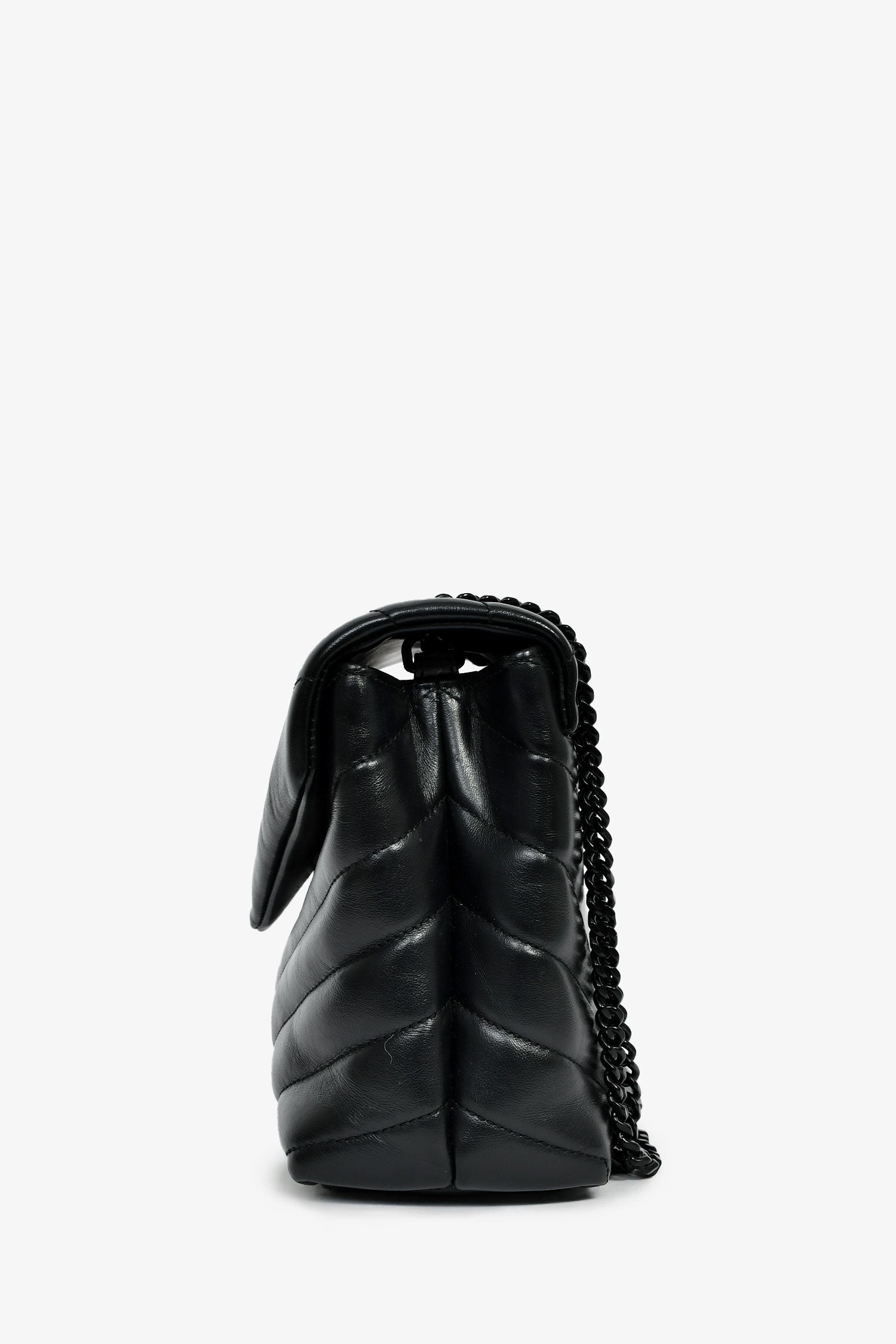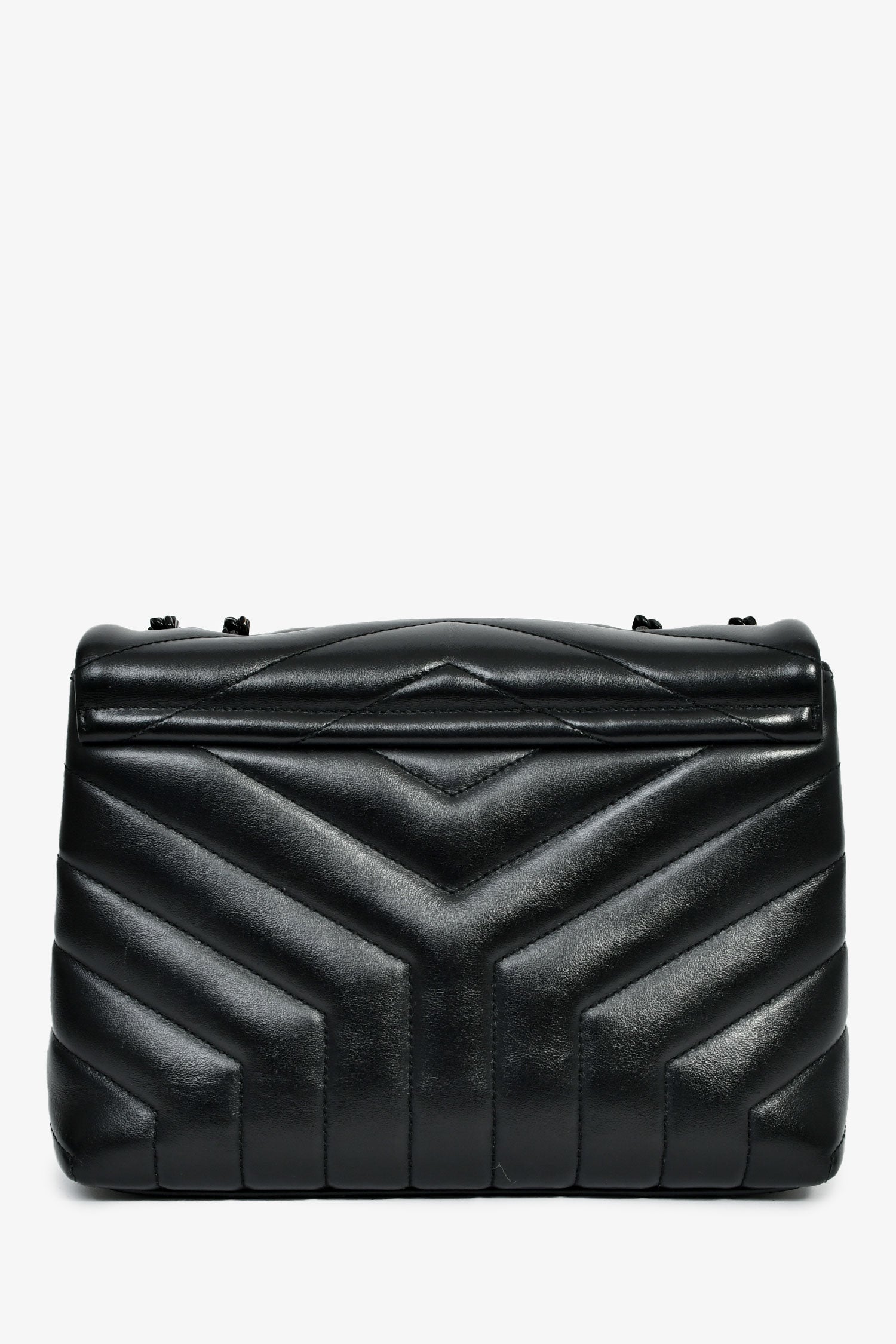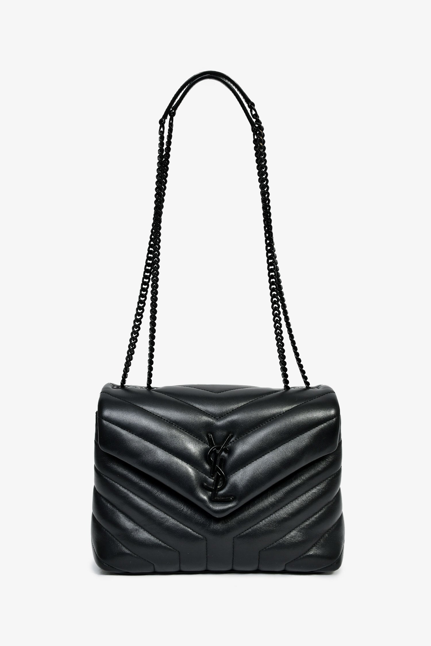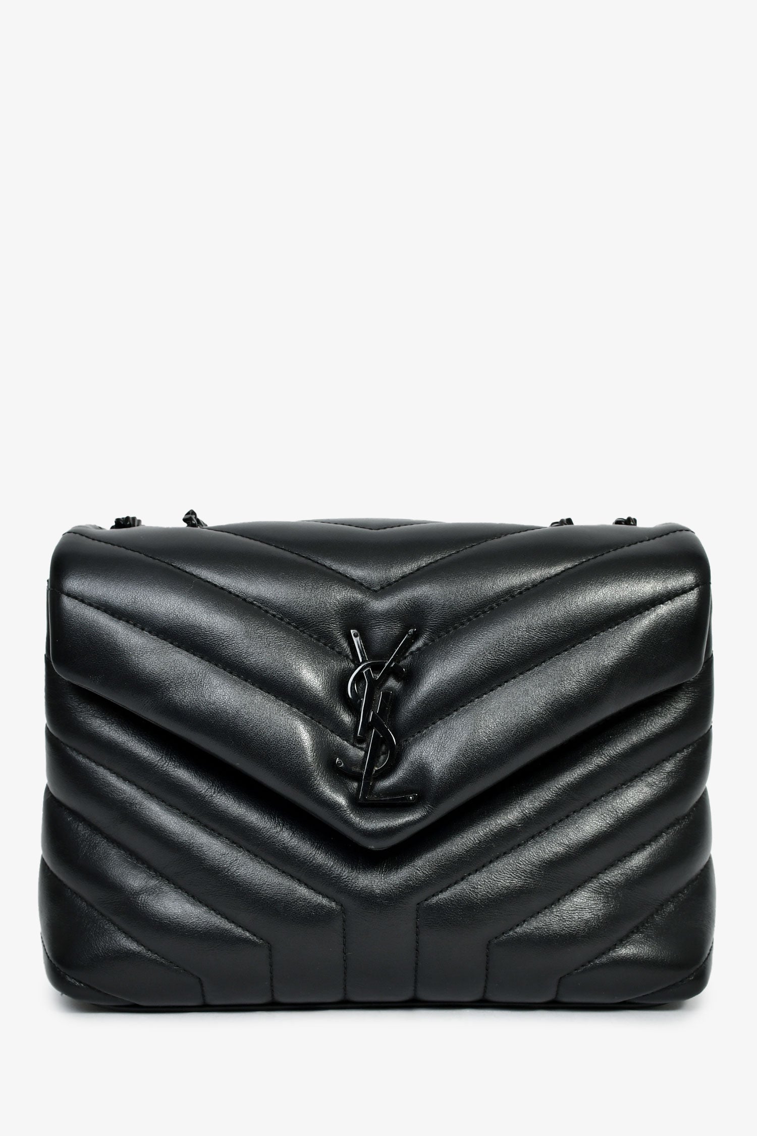 Refresh availabilitySaint Laurent Black Leather Small LouLou Chevron Quilted Shoulder Bag. Front fold-over flap with a snap closure. Black-tone chain-link shoulder strap. Lined interior with 2 spacious and 1 zipped compartment, and 1 slip pocket. Plated hardware. Tonal stitching.