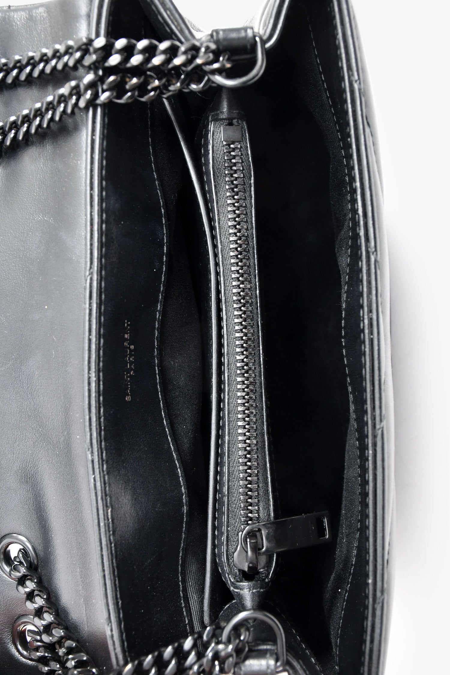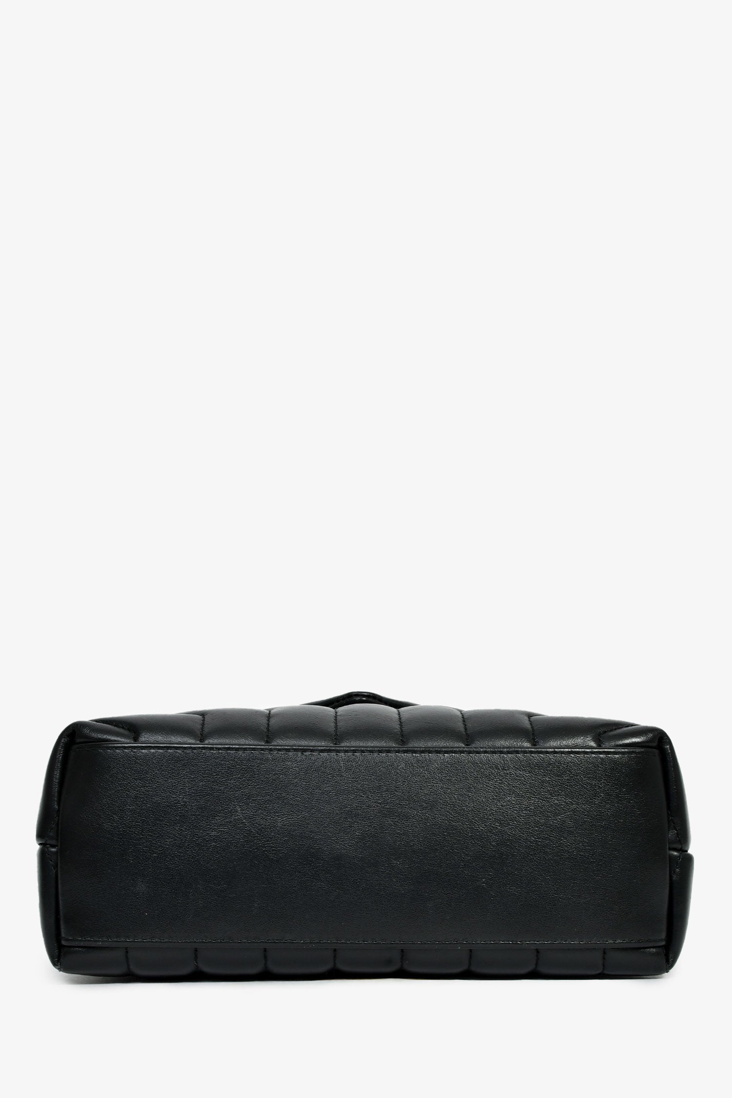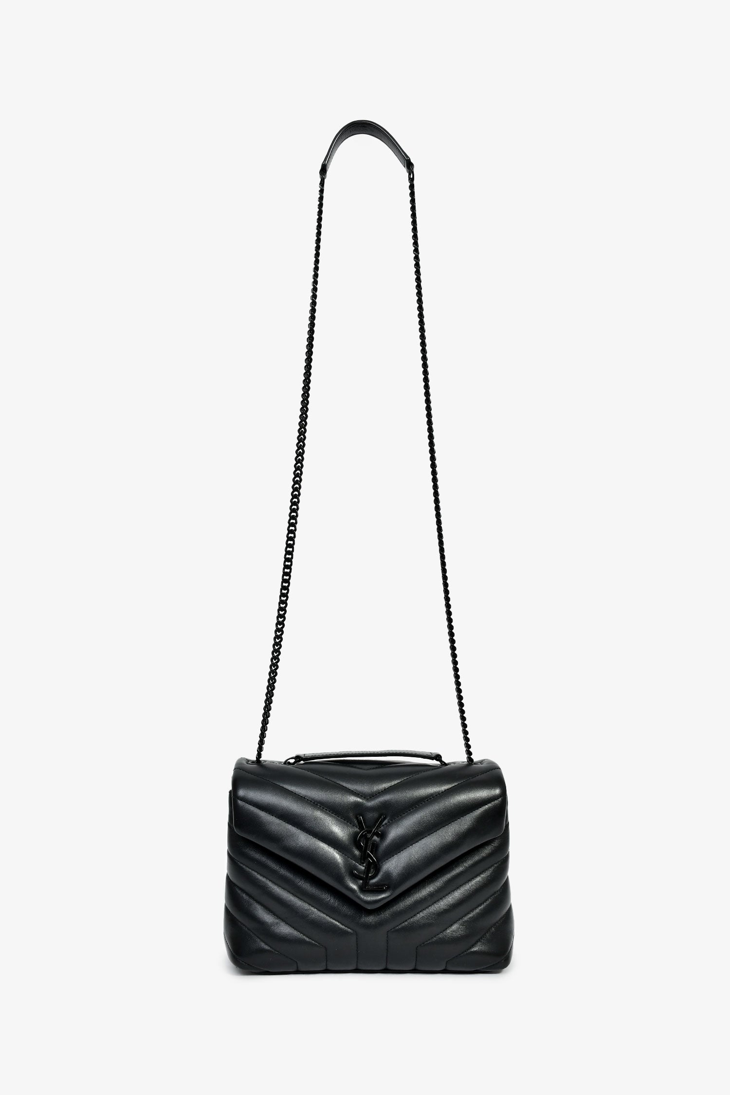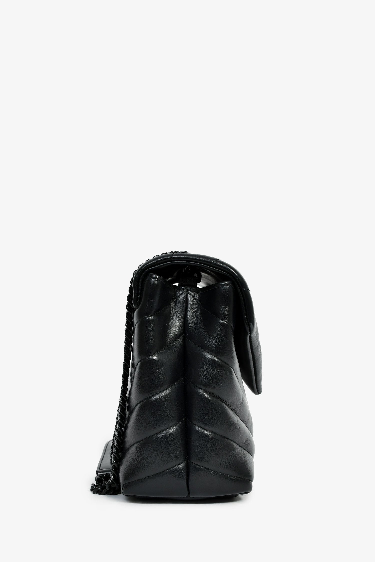 Refresh availabilitySaint Laurent Black Leather Small LouLou Chevron Quilted Shoulder Bag. Front fold-over flap with a snap closure. Black-tone chain-link shoulder strap. Lined interior with 2 spacious and 1 zipped compartment, and 1 slip pocket. Plated hardware. Tonal stitching.