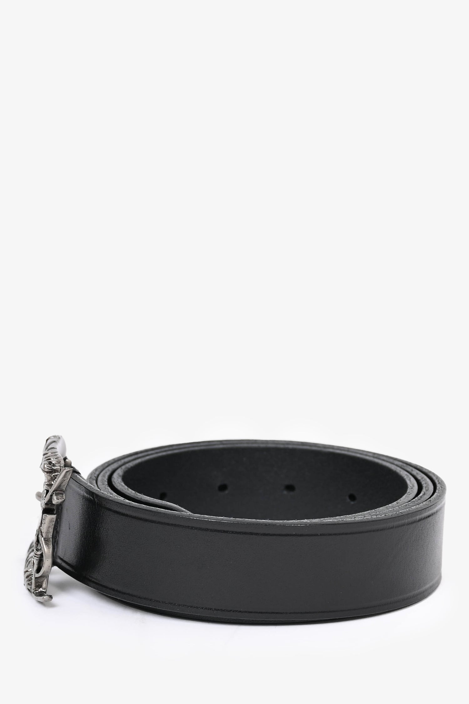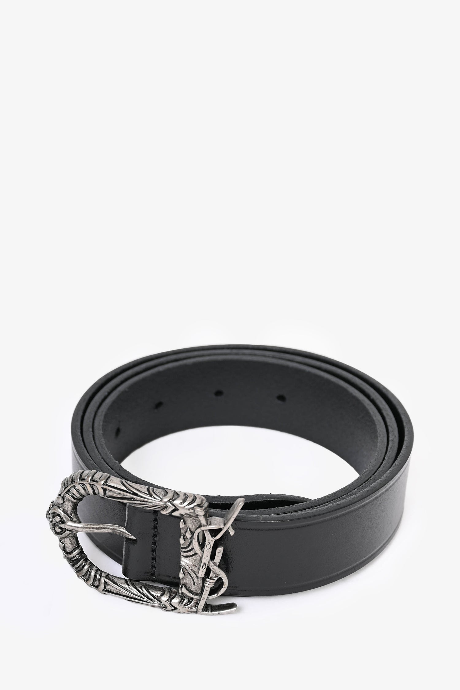 Refresh availabilitySaint Laurent Black Leather Western YSL Buckle Belt. Antiqued silver-tone hardware.