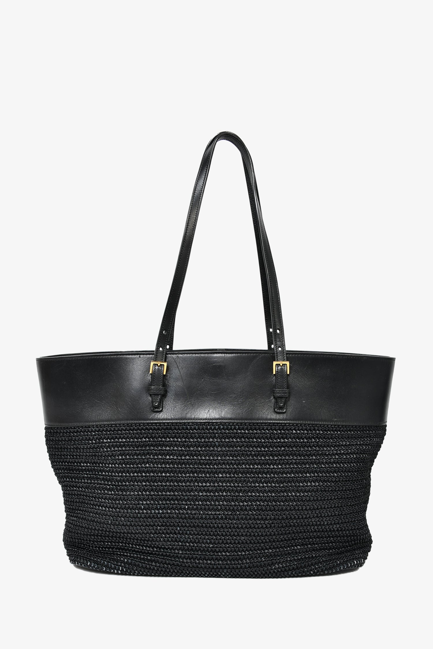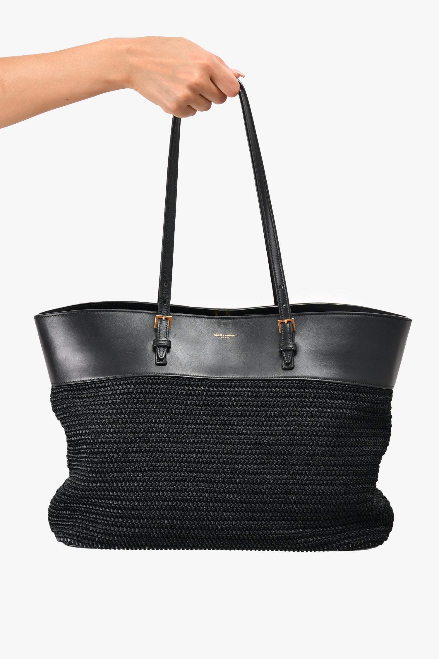 Refresh availabilitySaint Laurent Black Leather/Wicker Boucle Shopping Tote. Top adjustable snap closure. One interior slip pocket. Adjustable handles. Gold-toned hardware. Tonal stitching.