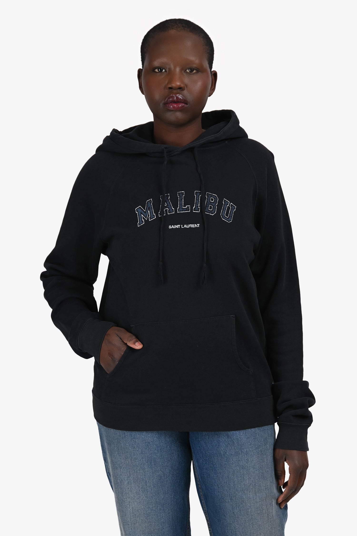 Refresh availabilitySaint Laurent Black 'Malibu' Logo Hoodie. Pull-on. Ribbed cuffs and hemline. Adjustable drawstrings on the hood. Front pouch pocket. Tonal stitching.