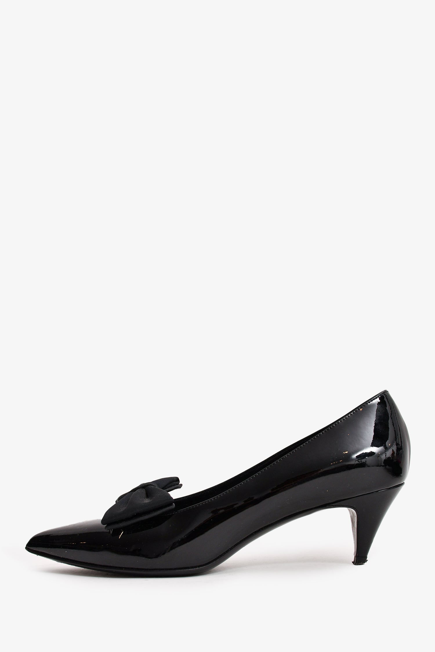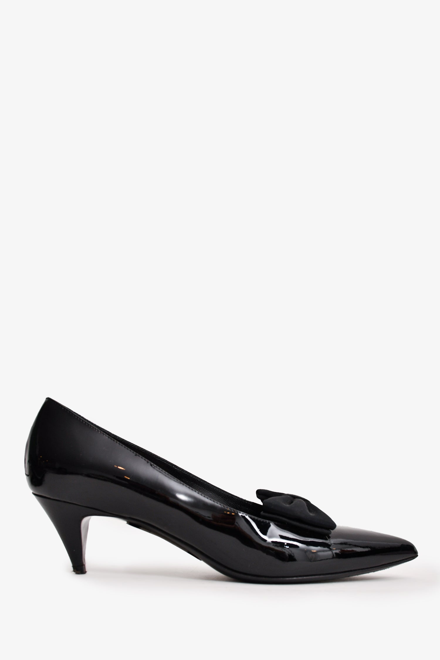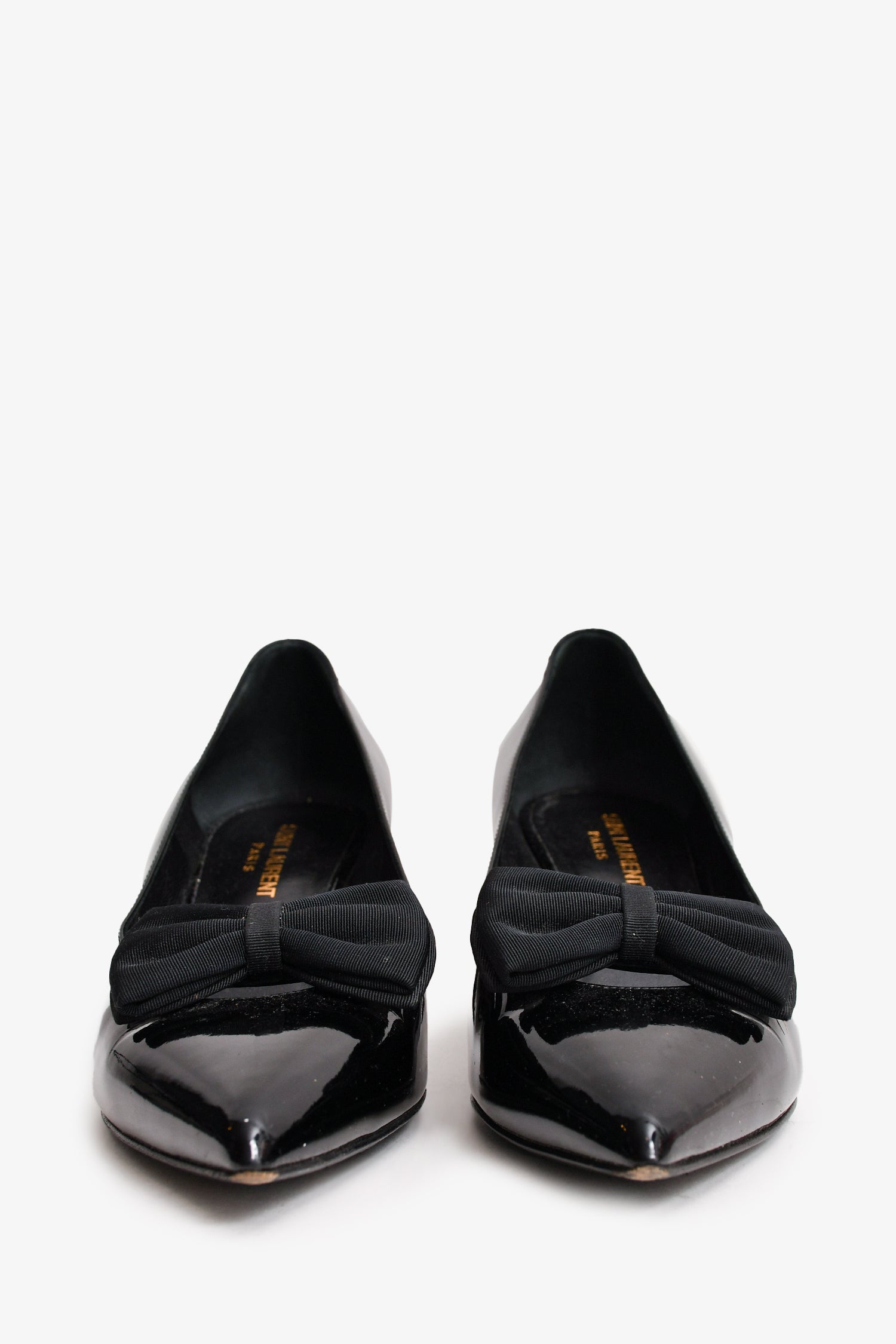 Refresh availabilitySaint Laurent Black Patent Bow Detail Kitten Heels. Slip-on. Pointed toe. Glossy finish.