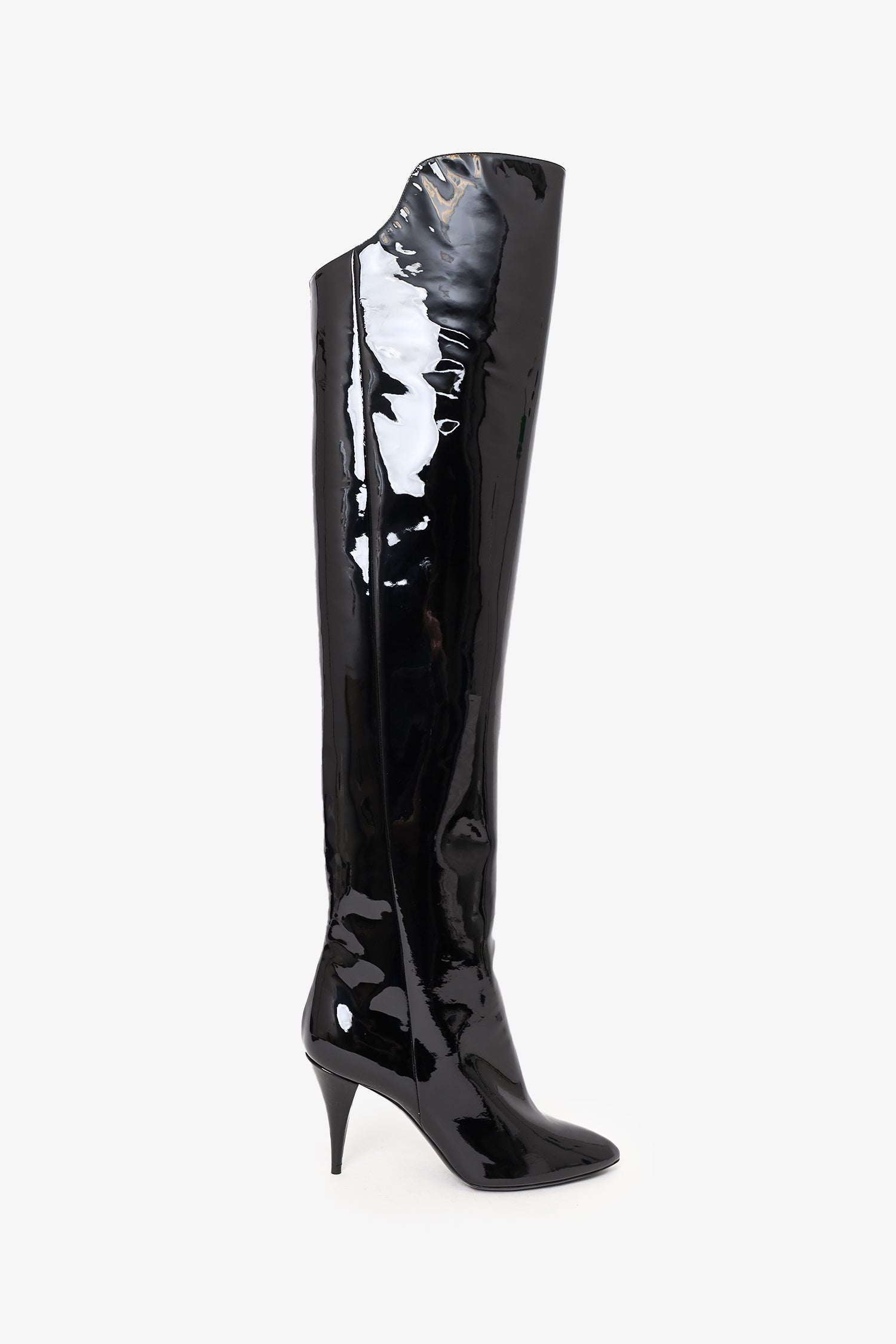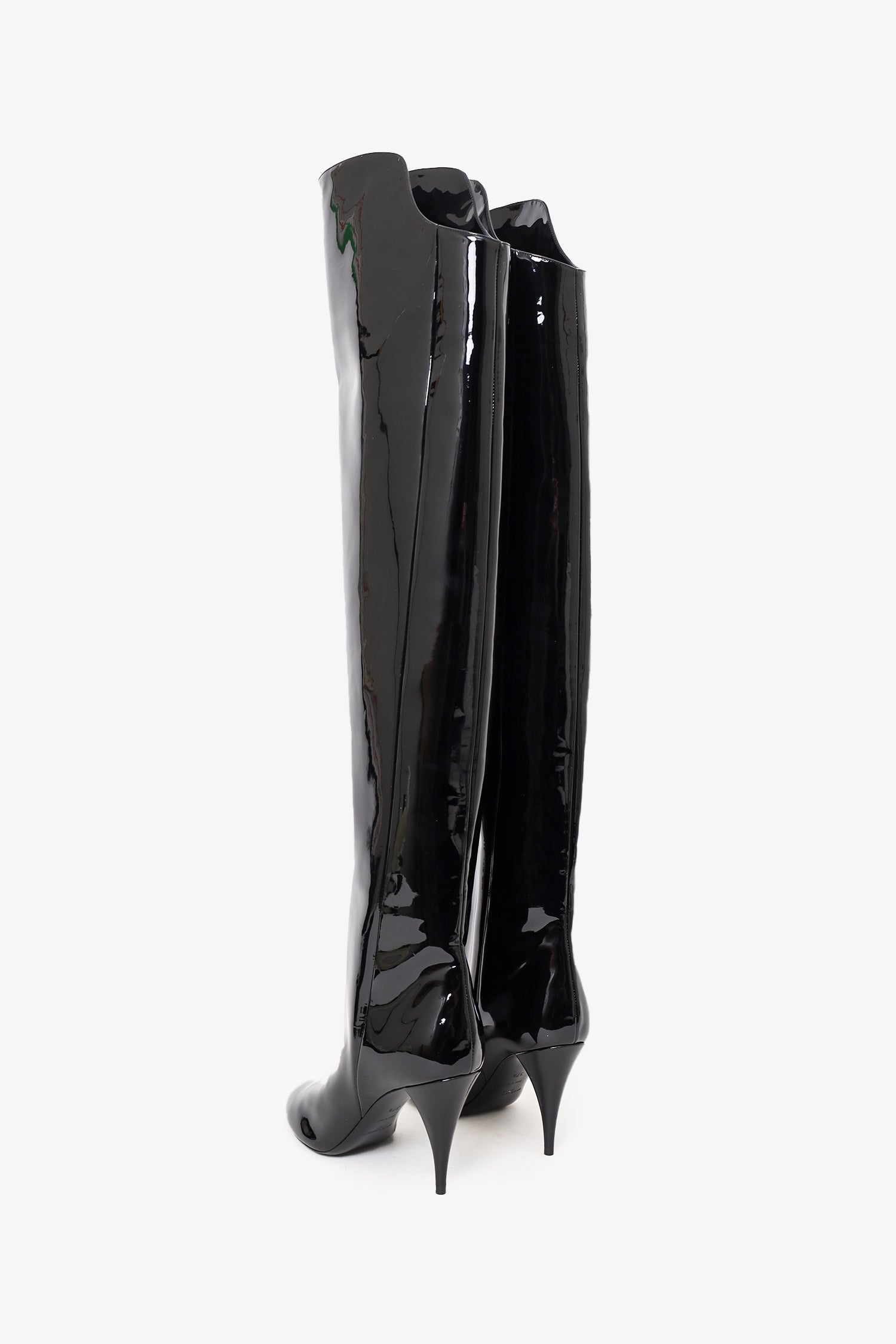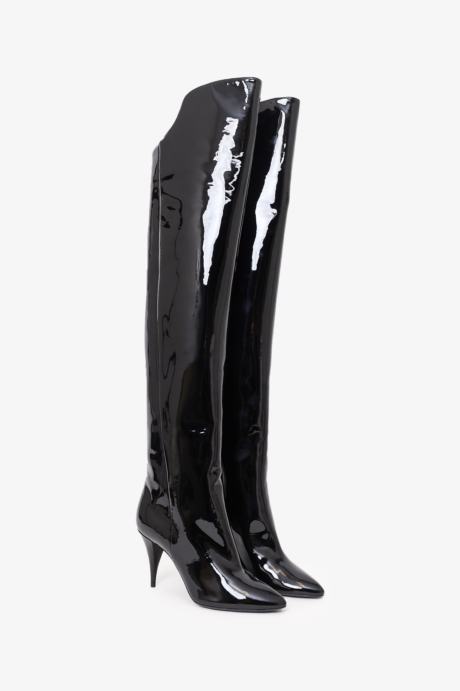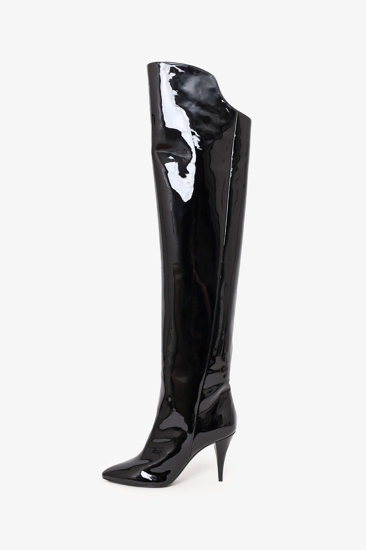Refresh availabilitySaint Laurent Black Patent Knee High Boots. Pull-on. Pointed-toe. Patent finish. Lined interior. Tonal stitching.