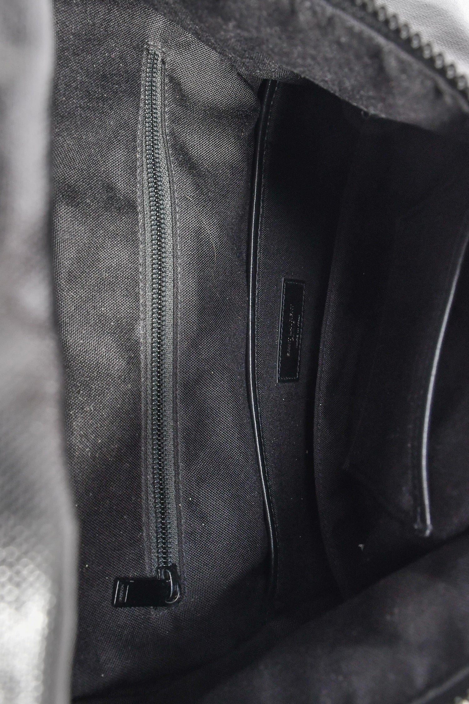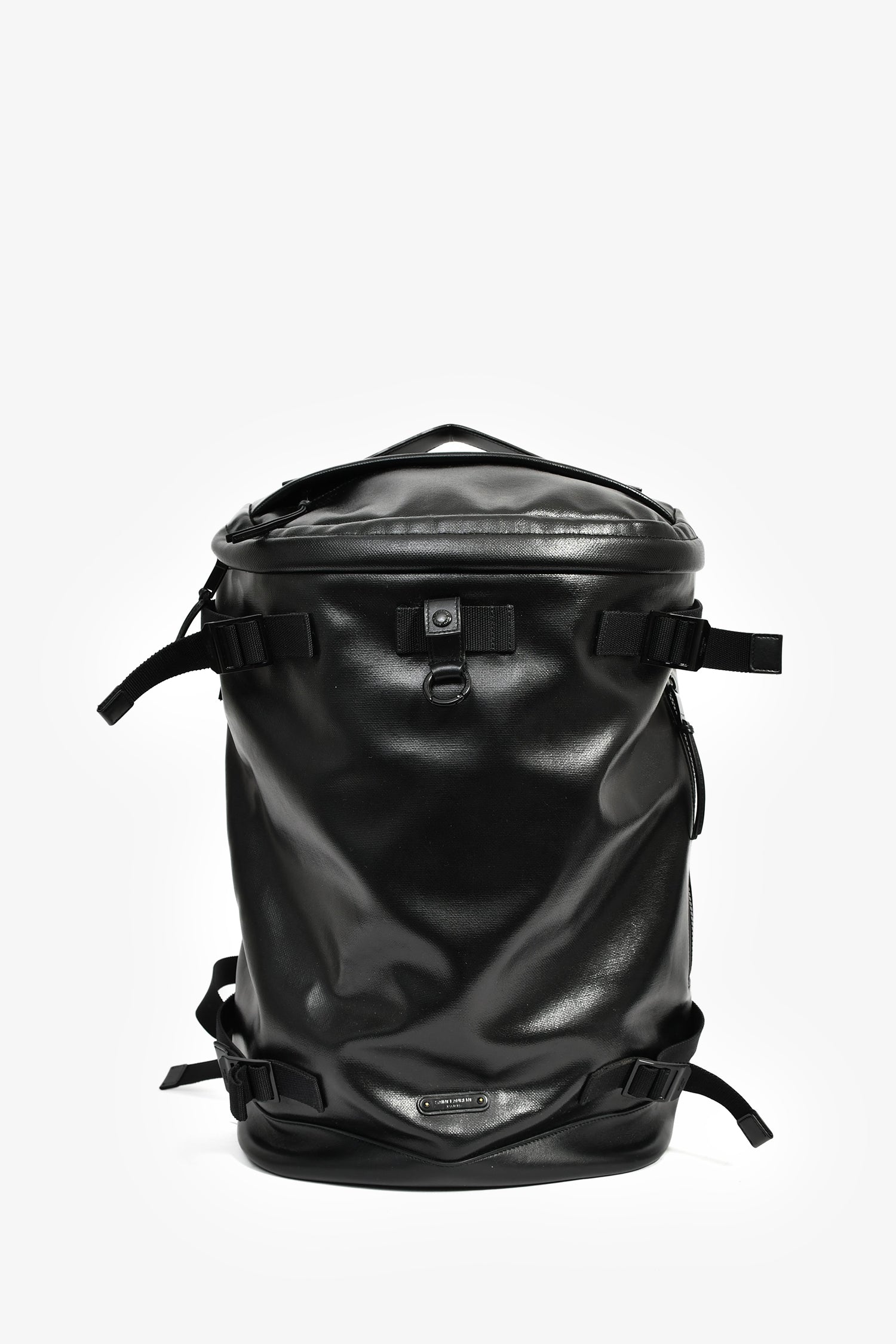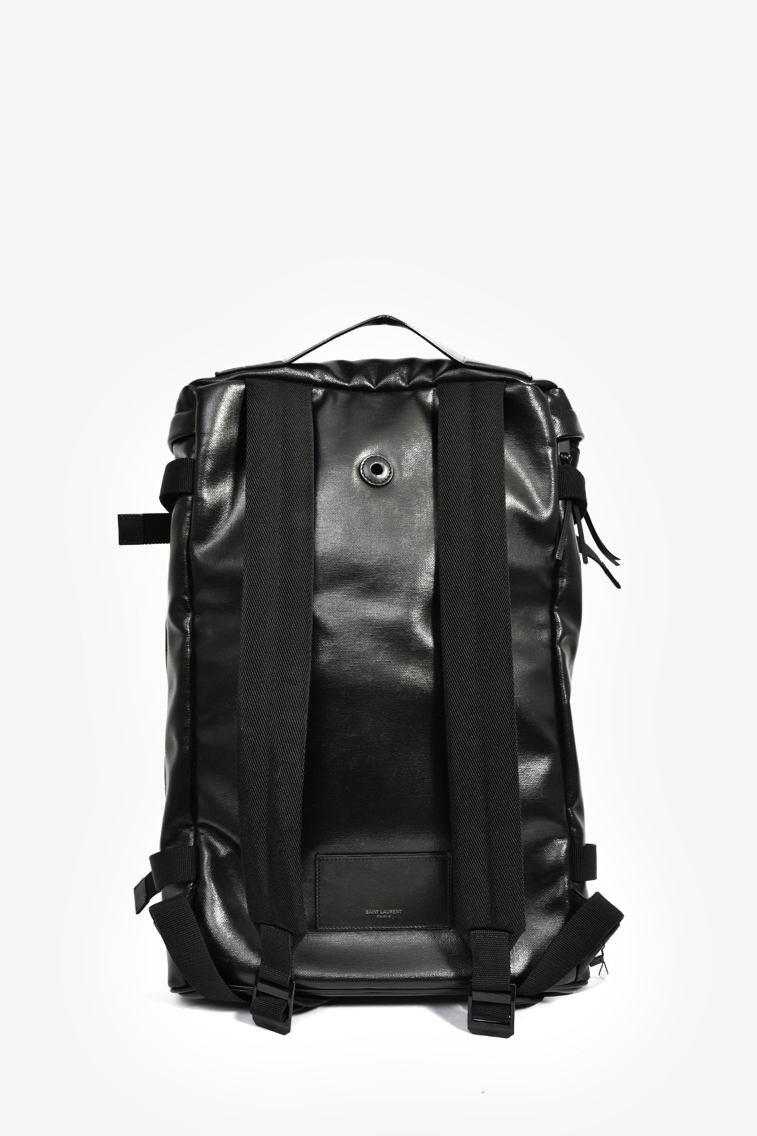 Refresh availabilitySaint Laurent Black Patent Rivington Race Backpack. Top handle. Top zip closure. Adjustable straps. Tonal textile-lined interior. 3 interior wall pockets; 2 slip, 1 with zip closure. Tonal hardware. Tonal stitching.