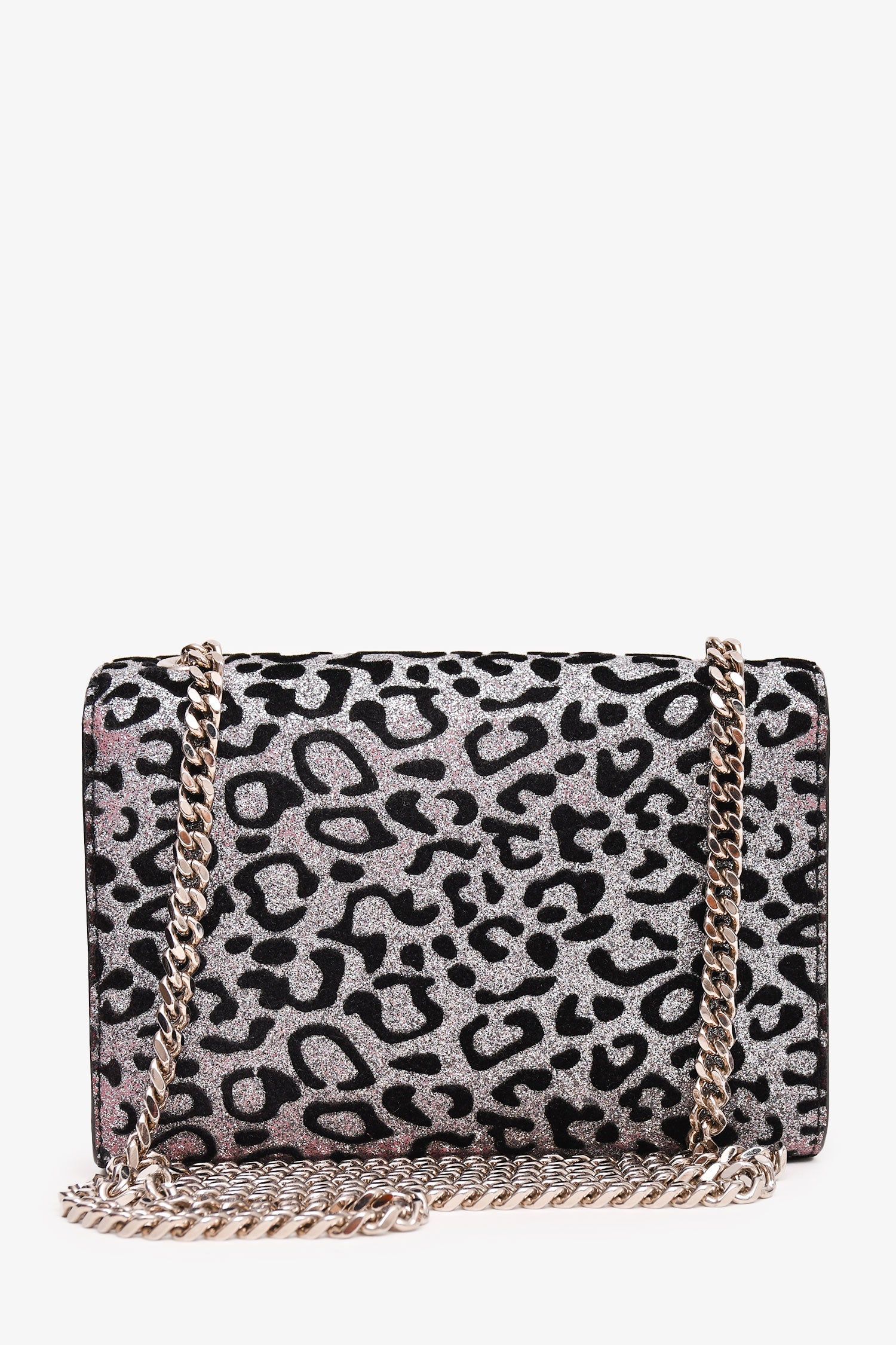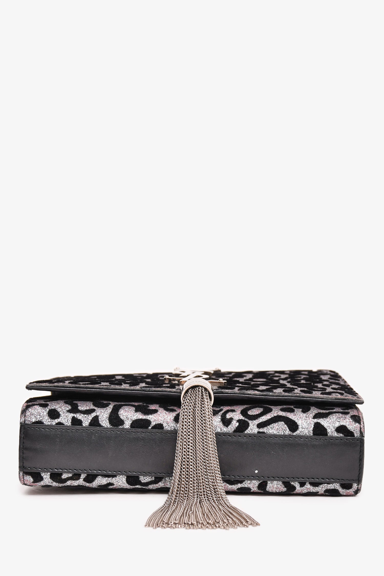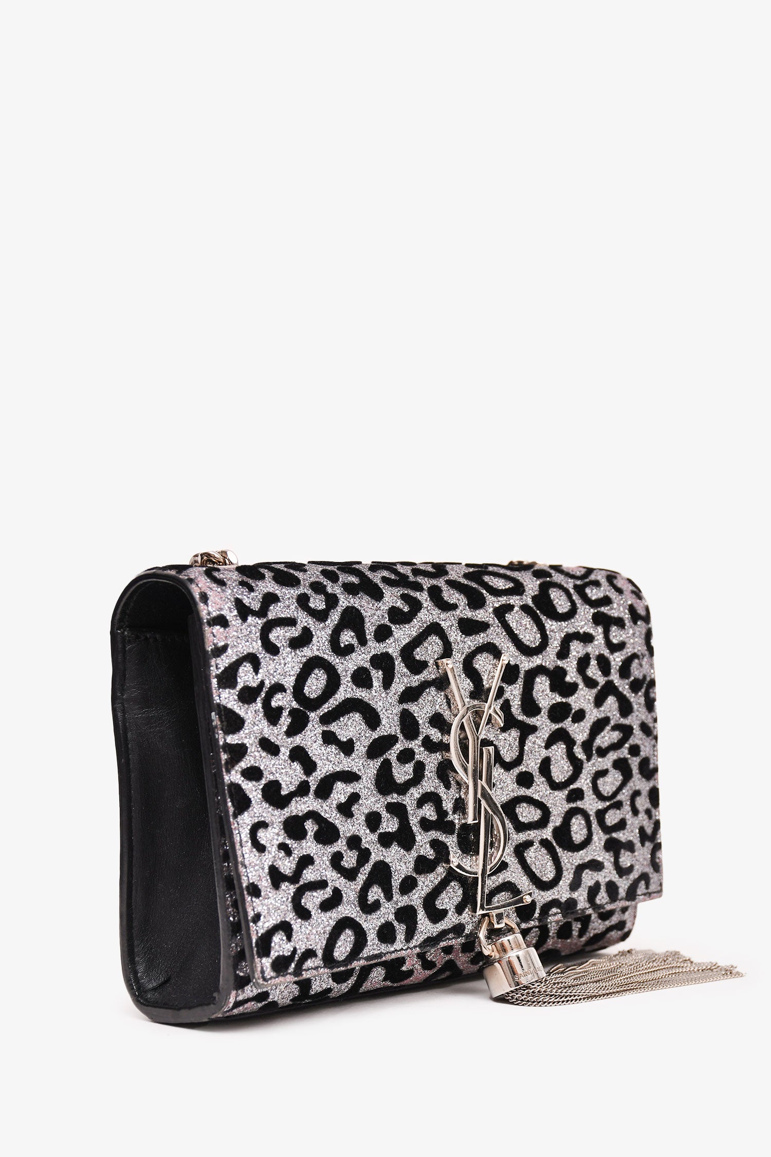 Refresh availabilitySaint Laurent Black Silver Animal Print Kate Tassle Small Crossbody. Front fold-over flap with magnetic button closure. Black leather interior lining. Single interior wall slip pocket. Slide-around chain. Silver-tone hardware.