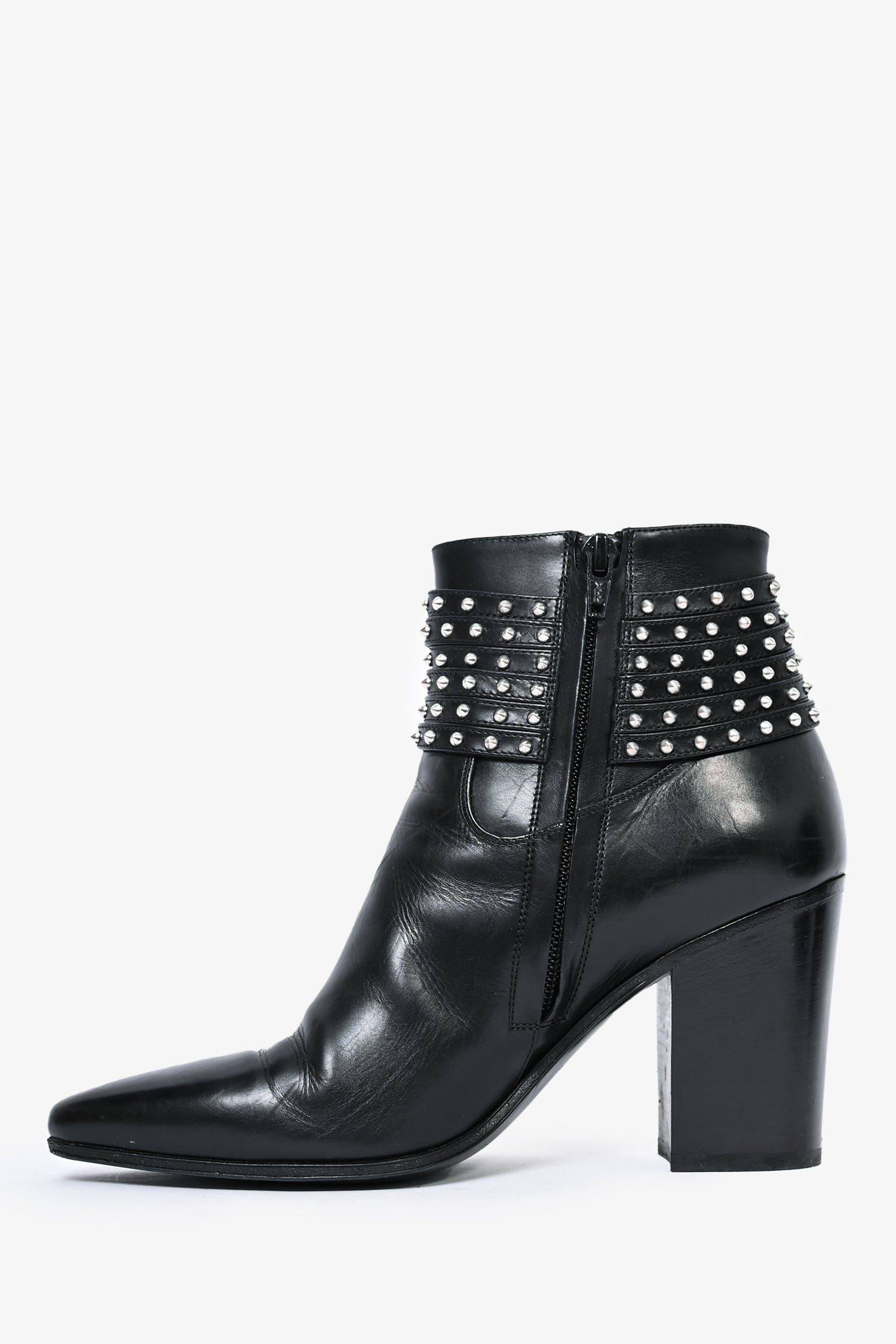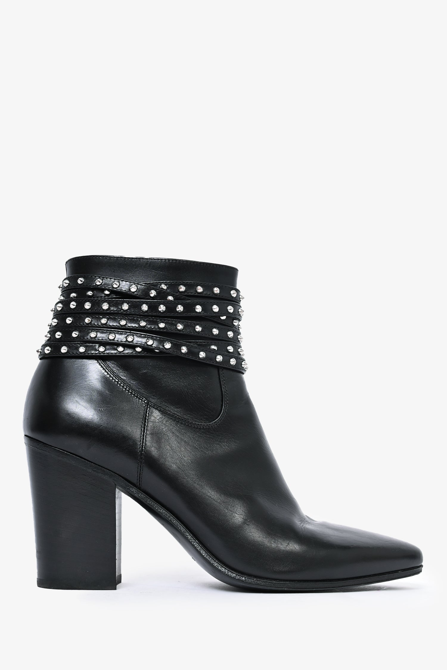 Refresh availabilitySaint Laurent Black Silver Studded Heeled Booties. Silver-tone hardware. Pointed toe. Side zipper.
