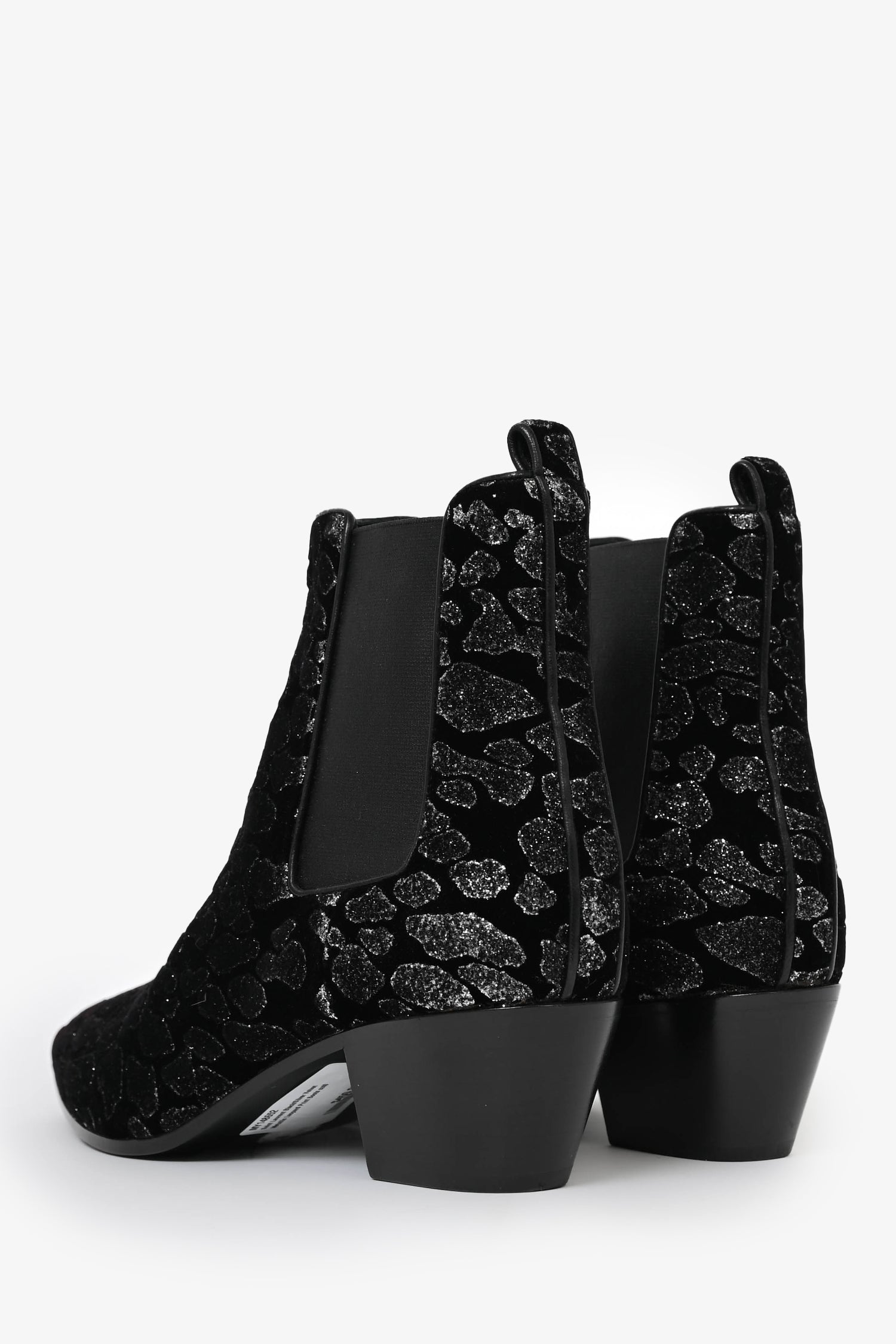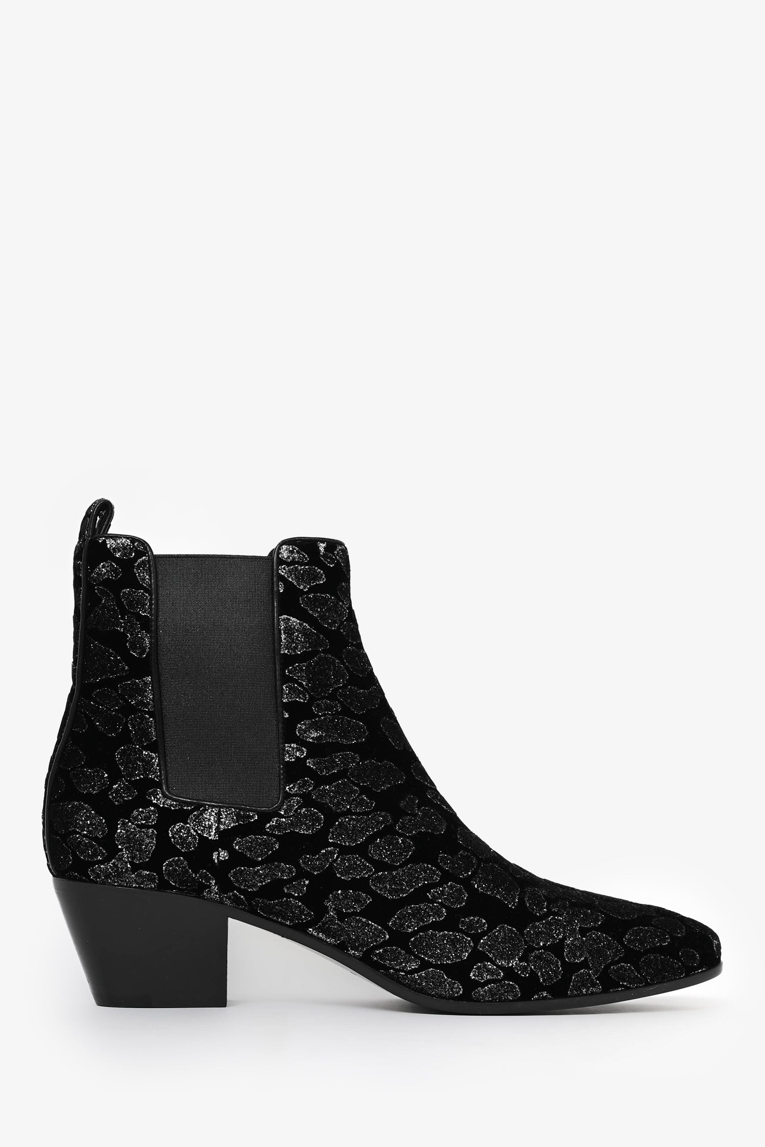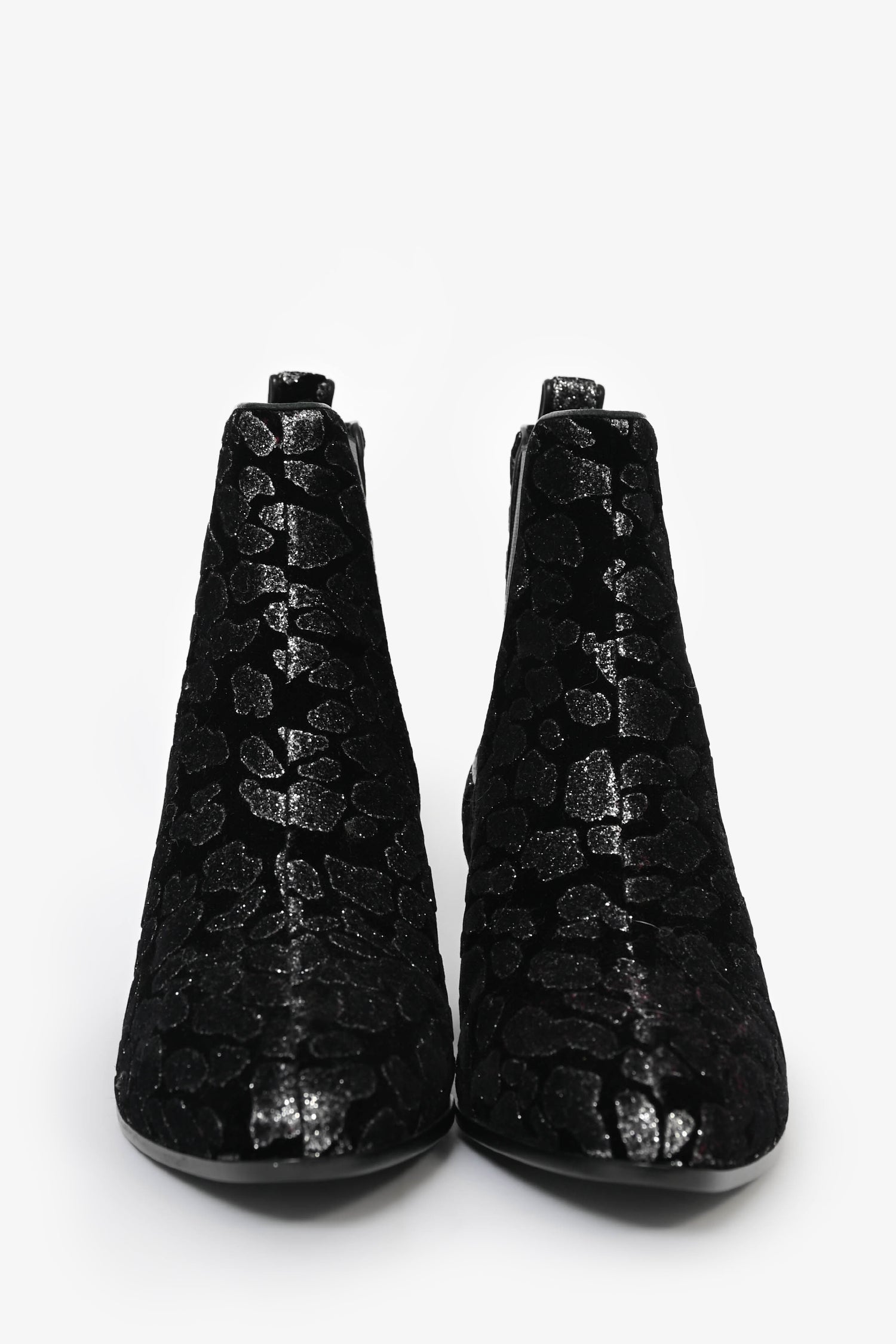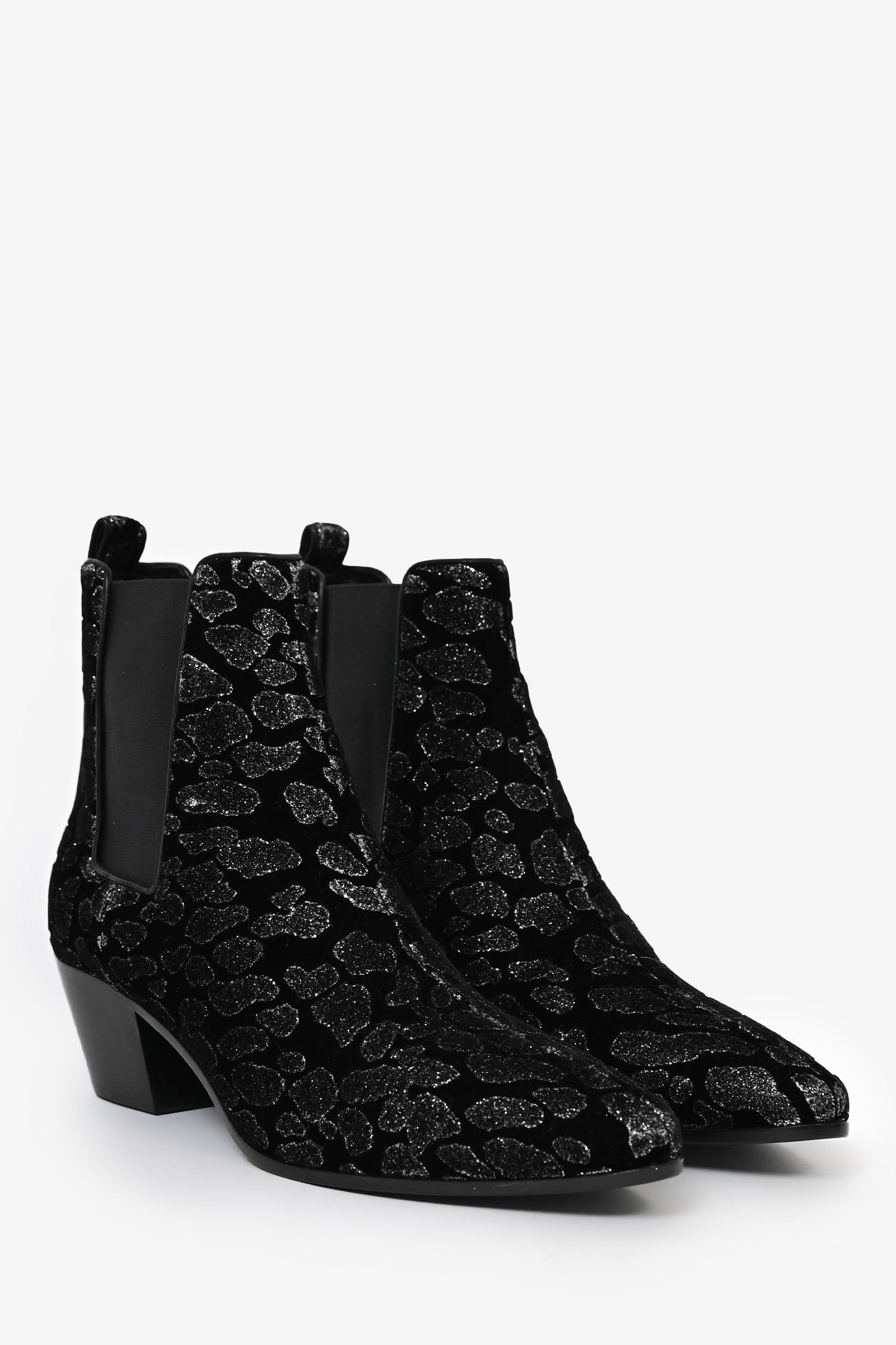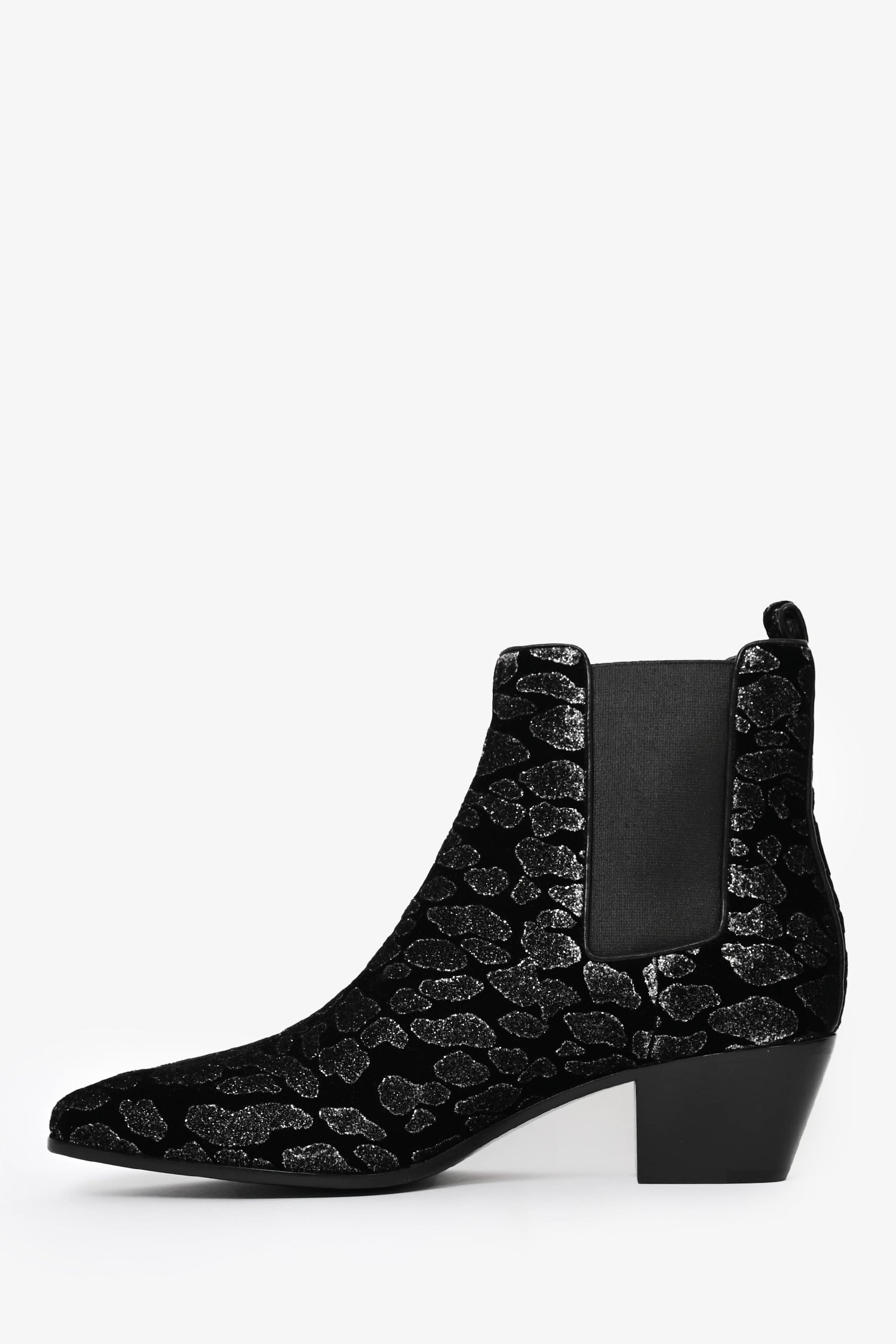 Refresh availabilitySaint Laurent Black/Silver Velvet Metallic Leopard Print Boots. Pointed toe front. Coated trimming. Leather lined interior. Tonal stitching.